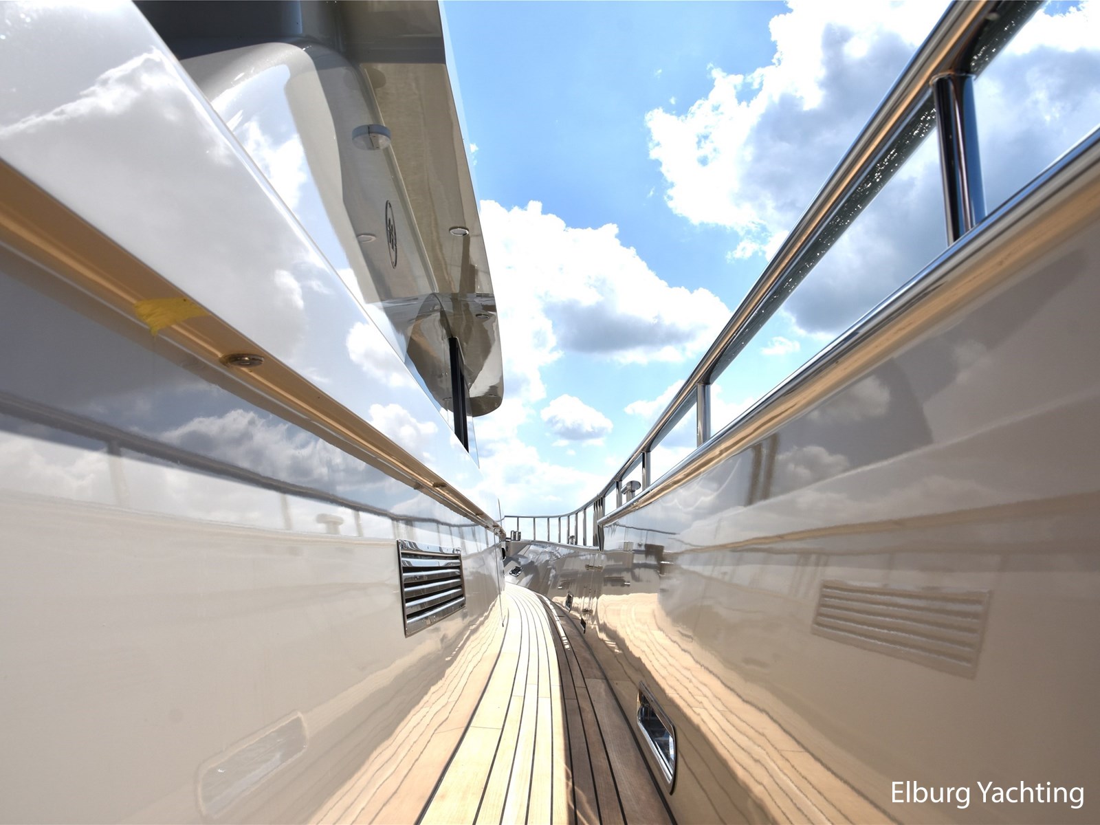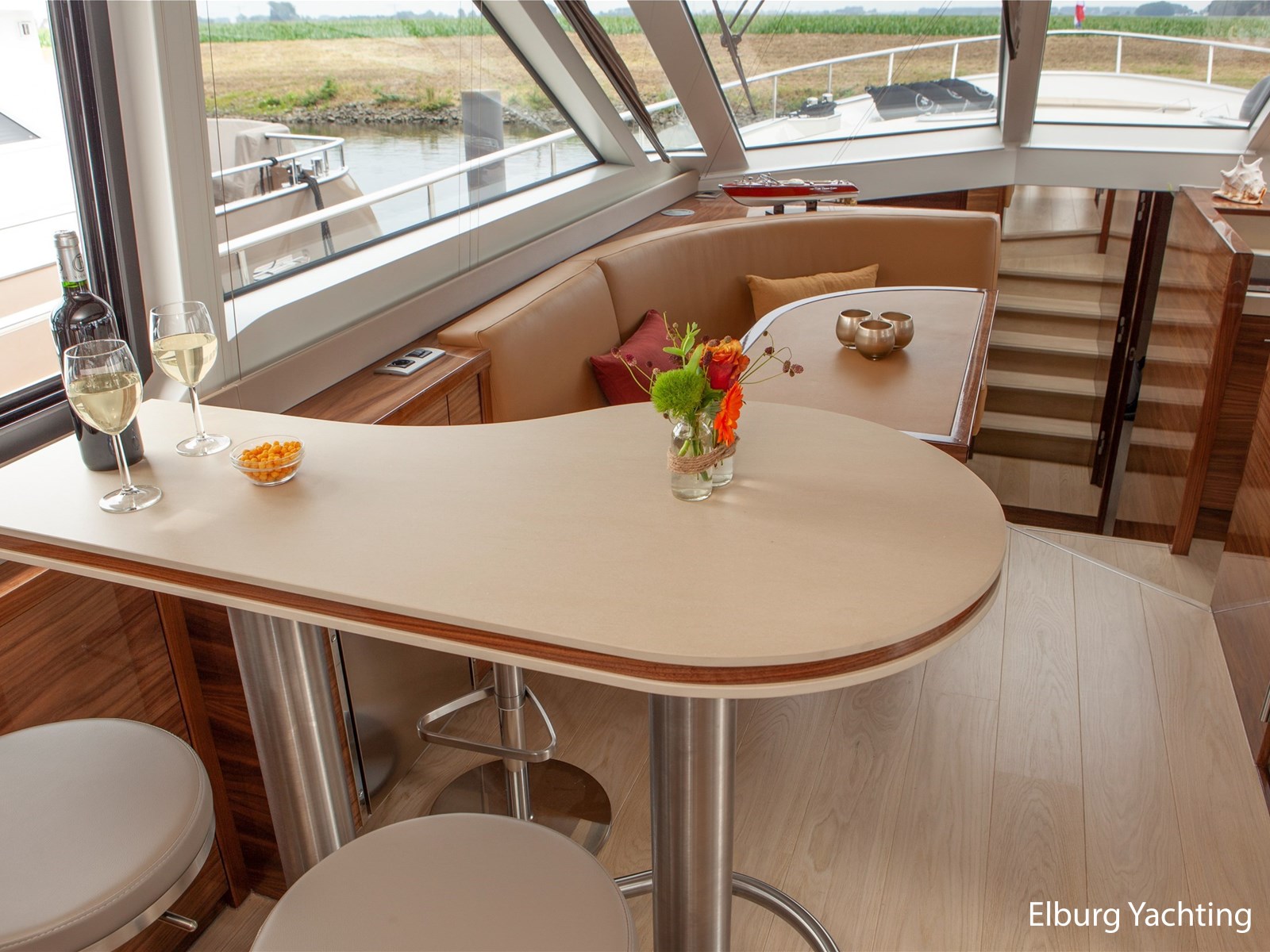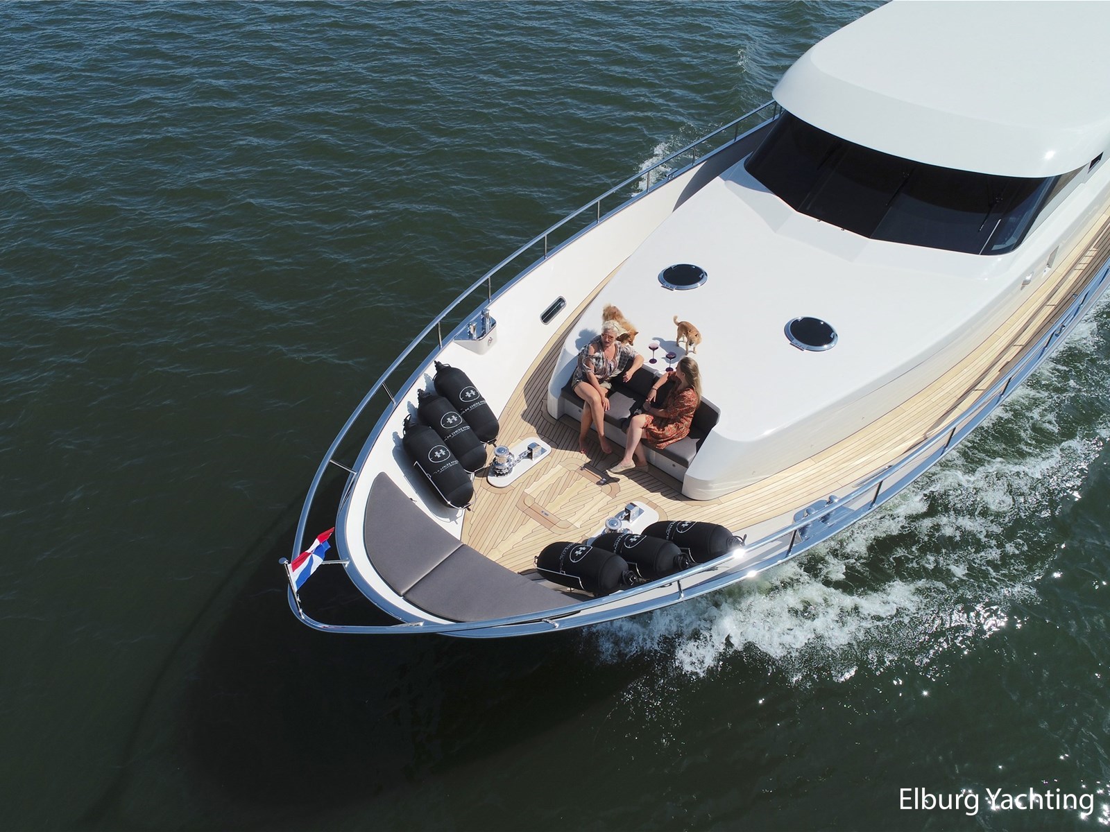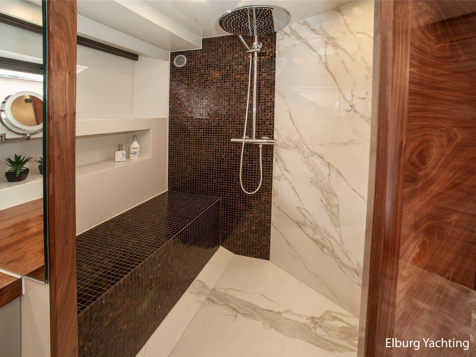 De salon op dekniveau biedt een spectaculair 360-graden uitzicht, wat het gevoel van ruimte en licht versterkt doormiddel van de grote raampartijen. De brede gangboorden rondom maken het veilig en gemakkelijk om gelijkvloers rondom het dek te bewegen. Het voordek biedt volop ruimte om te loungen, compleet met een comfortabele bank om in alle rust van het uitzicht te genieten. Ook het achterdek is royaal opgezet, met een halfronde bank voor vijf personen en een overkapping die schaduw biedt tijdens zonnige dagen. Aan beide zijden van het jacht leiden stijlvolle trappen naar het ruime zwemplateau, dat tevens toegang biedt tot de professioneel ingerichte machinekamer met stahoogte. Met plezier maak je hier een dagelijks inspectie rondje en ziet in een oogopslag dat alle techniek in orde is. Dit schip beschikt over een geldig CVO certificaat.