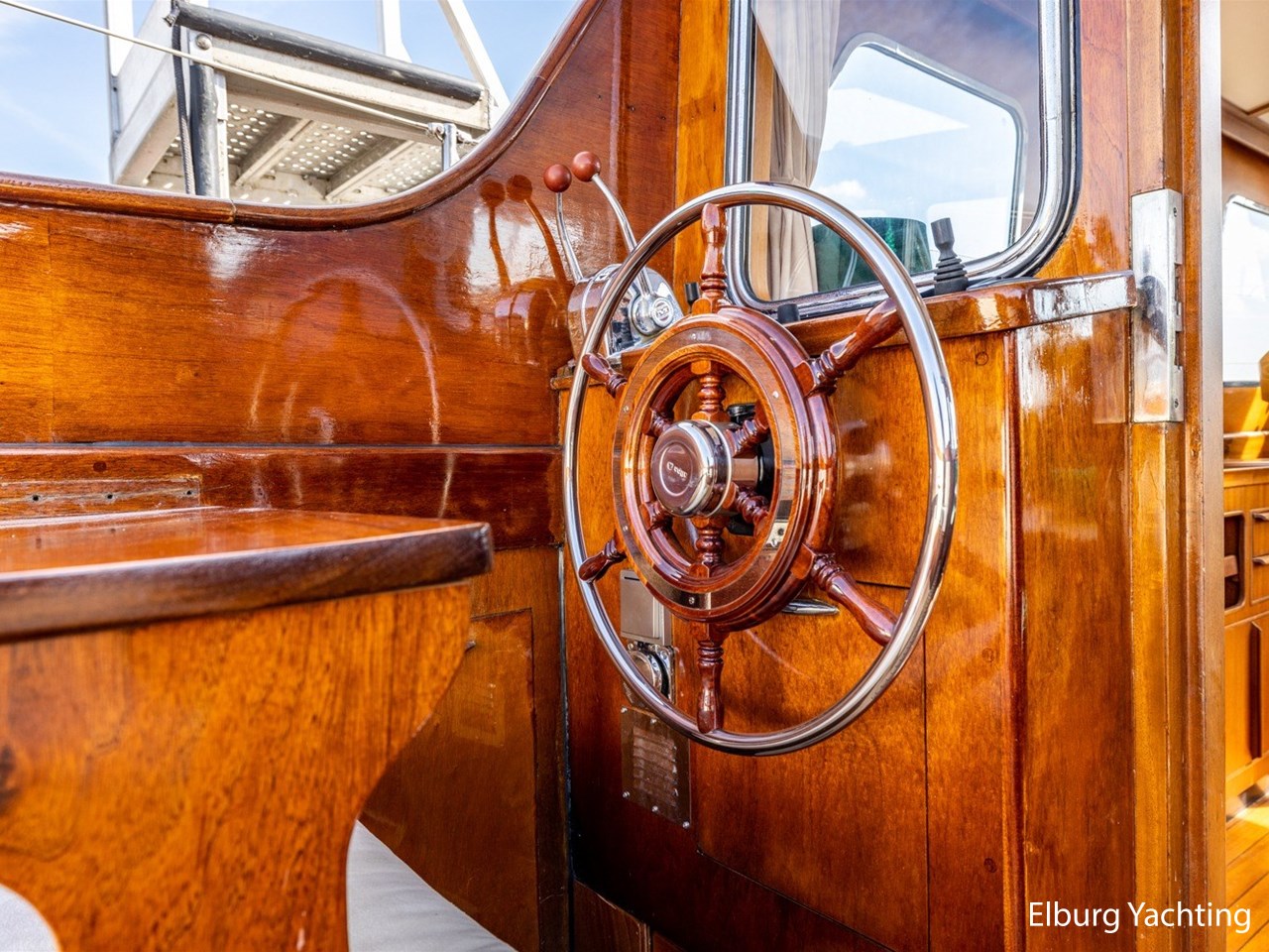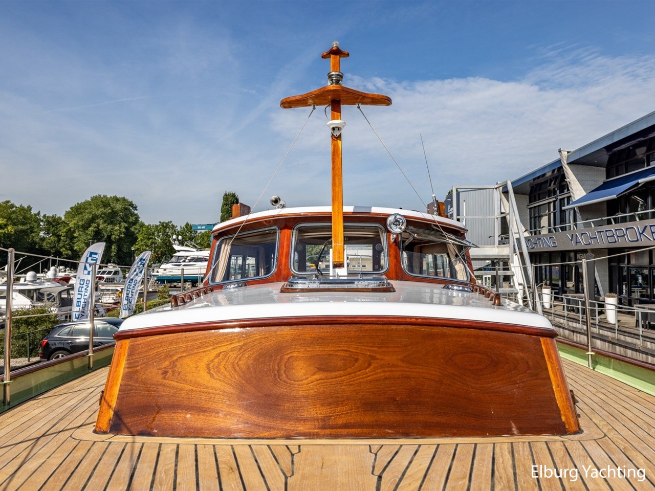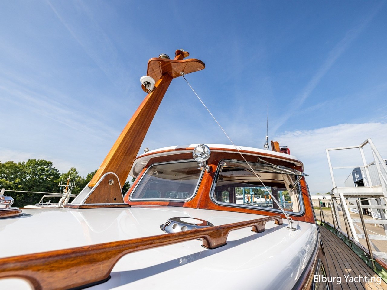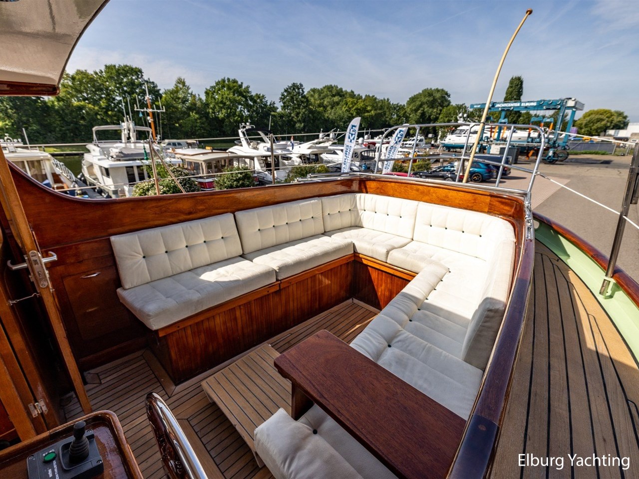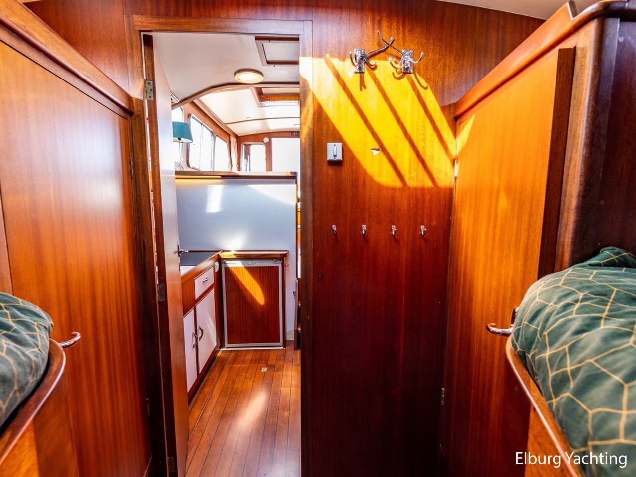 De Trewes Spitsgatkotter 12.00 is in 1968 ontworpen door de beroemde Naval Architect SM van der Meer en gebouwd door Van Dam scheepswerf in Aalsmeer. Het is een uniek, charmant en custom exemplaar met klassieke uitstraling. De open kuip en salon zijn door 2 openslaande deuren met elkaar verbonden, ruime open kuip beschikt over een U-vormige zitting, welke uitermate geschikt is om met gasten een heerlijke dag te genieten op het water, 2e stuurstand buiten is aanwezig, voorhut met 2 vaste kooien en royale hang/legkasten, ruime kombuis aan SB met ingebouwde Electrolux koelkast, r.v.s. aanrechtbak. Aan BB grote toiletruimte aanwezig met vaste wastafel. In salon aan SB ruime L-bank, barkast aan SB, dressoir met diverse kastjes en laden aan BB. Vloeren in voorhut, kombuis en salon afgewerkt met sierlijn teak. Securit glas in koperverchroomde profielen, vaste ramen in achterschot en deuren, middelste zijramen schuivend, 1 voorfront en 1 half klappend raam. Teak met gerubberde naden over stalen dek. Gehele opbouw van 20 mm. mahonie hechthout, daken van 3 x 7 mm Occumé hechthout gelamineerd. Groot schuifluik in salondak. stalen zelflozende kuipvloer, bekleed met teakhout met gerubberde naden. Kuipbanken en -randen geheel in massief mahonie. Kuip voorzien van volledige overdekte tent met zichtvensters. Het schip heeft in 2022 volledige renovatie van teakdek ondergaan, ruime hoge open kuip, 2e stuurstand, r.v.s. bolders, hoge dubbele reling, alle kitranden zijn vernieuwd 2022, klapbare teakhouten mast, ledverlichting door gehele boot, Victron Digital Multi Control, stroomsysteem, veel bergruimte. De doorvaarthoogte met geklapte mast is ca. 2,50m. Het schip afgelopen winterseizoenen binnen gelegen. Voor vragen en/of het maken van een afspraak bent u 7 dagen per week van harte welkom bij Elburg Yachting.