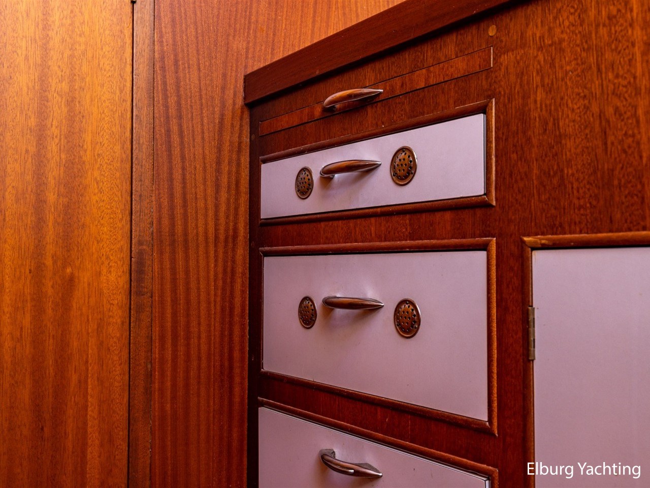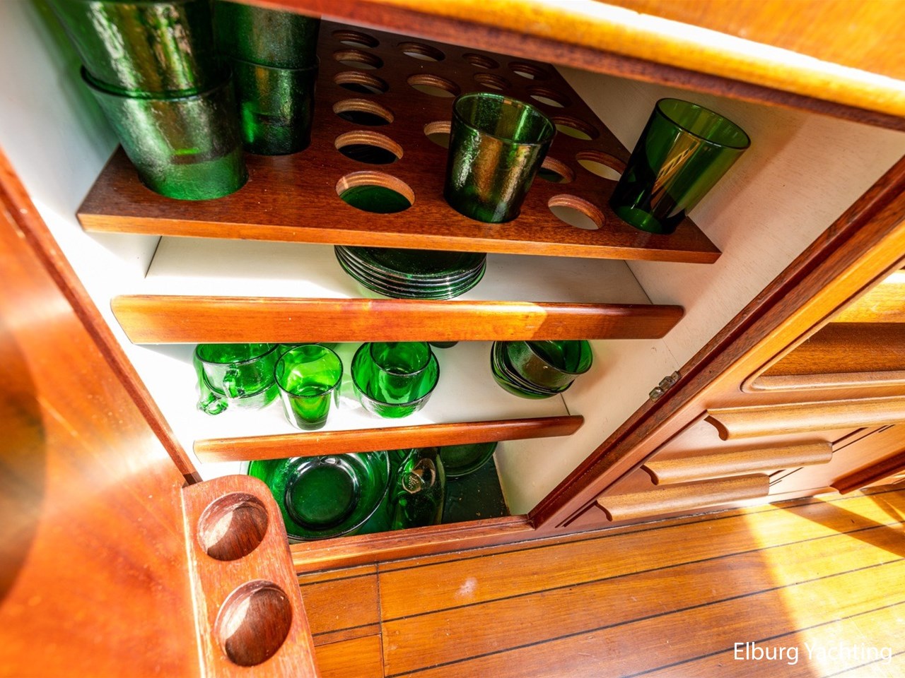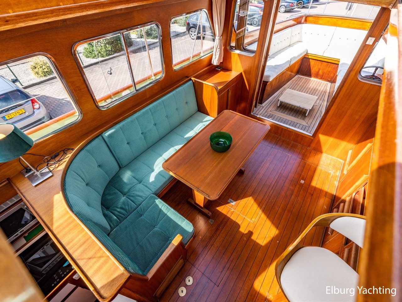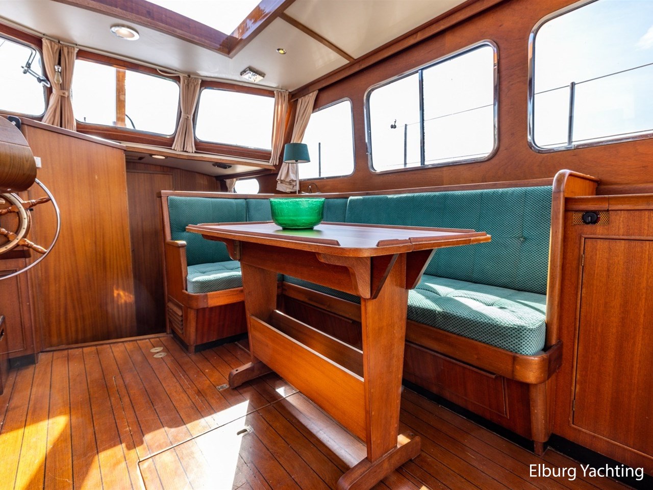 De Trewes Spitsgatkotter 12.00 is in 1968 ontworpen door de beroemde Naval Architect SM van der Meer en gebouwd door Van Dam scheepswerf in Aalsmeer. Het is een uniek, charmant en custom exemplaar met klassieke uitstraling. De open kuip en salon zijn door 2 openslaande deuren met elkaar verbonden, ruime open kuip beschikt over een U-vormige zitting, welke uitermate geschikt is om met gasten een heerlijke dag te genieten op het water, 2e stuurstand buiten is aanwezig, voorhut met 2 vaste kooien en royale hang/legkasten, ruime kombuis aan SB met ingebouwde Electrolux koelkast, r.v.s. aanrechtbak. Aan BB grote toiletruimte aanwezig met vaste wastafel. In salon aan SB ruime L-bank, barkast aan SB, dressoir met diverse kastjes en laden aan BB. Vloeren in voorhut, kombuis en salon afgewerkt met sierlijn teak. Securit glas in koperverchroomde profielen, vaste ramen in achterschot en deuren, middelste zijramen schuivend, 1 voorfront en 1 half klappend raam. Teak met gerubberde naden over stalen dek. Gehele opbouw van 20 mm. mahonie hechthout, daken van 3 x 7 mm Occumé hechthout gelamineerd. Groot schuifluik in salondak. stalen zelflozende kuipvloer, bekleed met teakhout met gerubberde naden. Kuipbanken en -randen geheel in massief mahonie. Kuip voorzien van volledige overdekte tent met zichtvensters. Het schip heeft in 2022 volledige renovatie van teakdek ondergaan, ruime hoge open kuip, 2e stuurstand, r.v.s. bolders, hoge dubbele reling, alle kitranden zijn vernieuwd 2022, klapbare teakhouten mast, ledverlichting door gehele boot, Victron Digital Multi Control, stroomsysteem, veel bergruimte. De doorvaarthoogte met geklapte mast is ca. 2,50m. Het schip afgelopen winterseizoenen binnen gelegen. Voor vragen en/of het maken van een afspraak bent u 7 dagen per week van harte welkom bij Elburg Yachting.