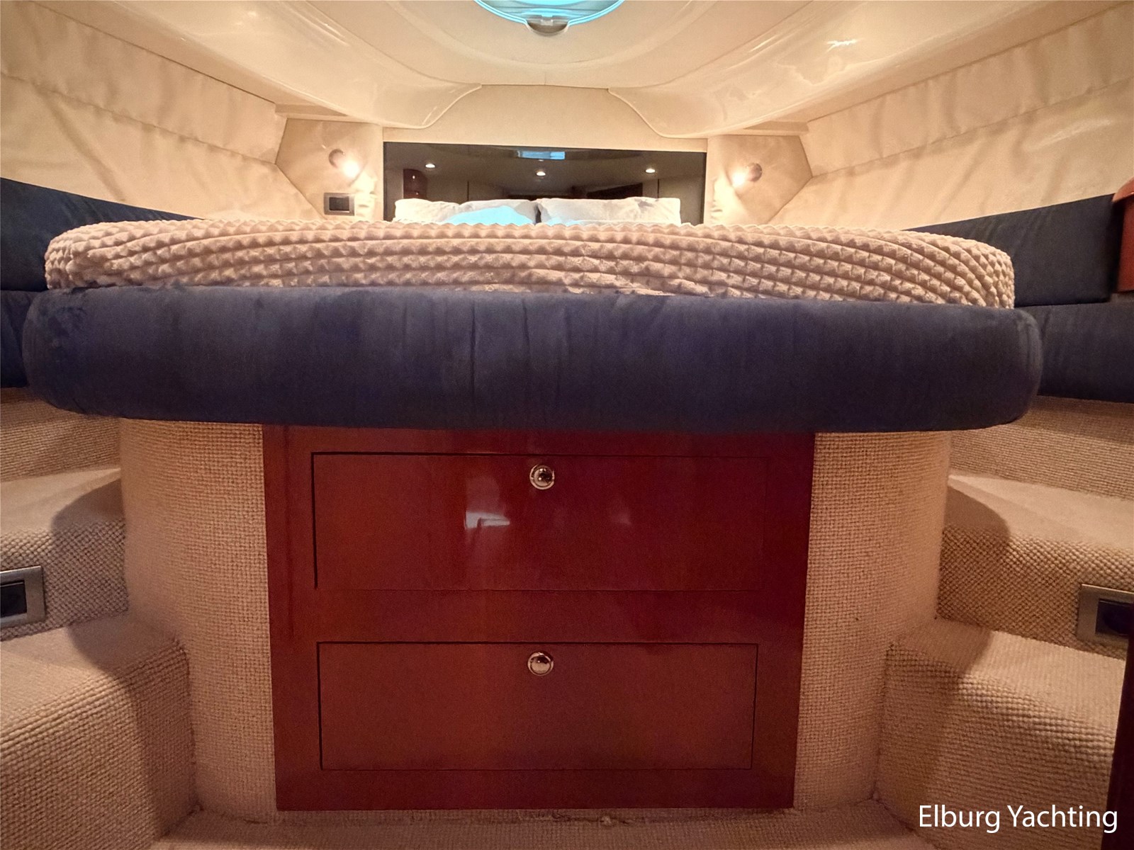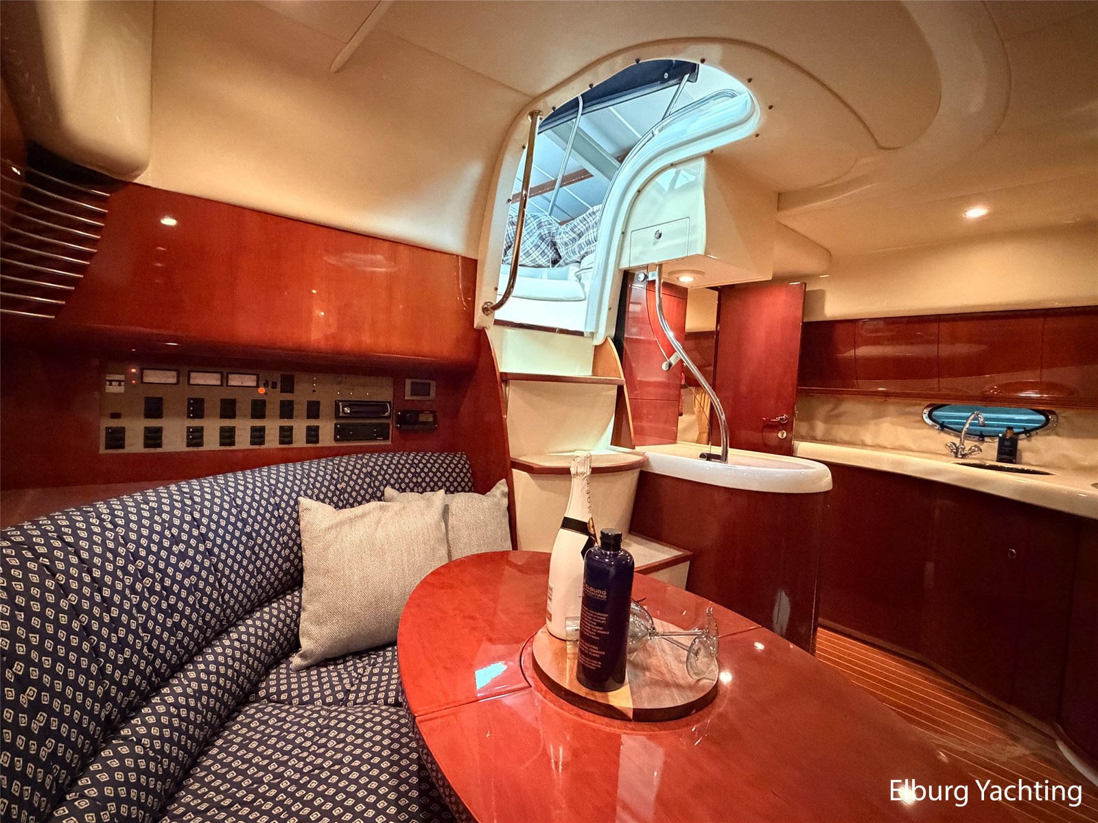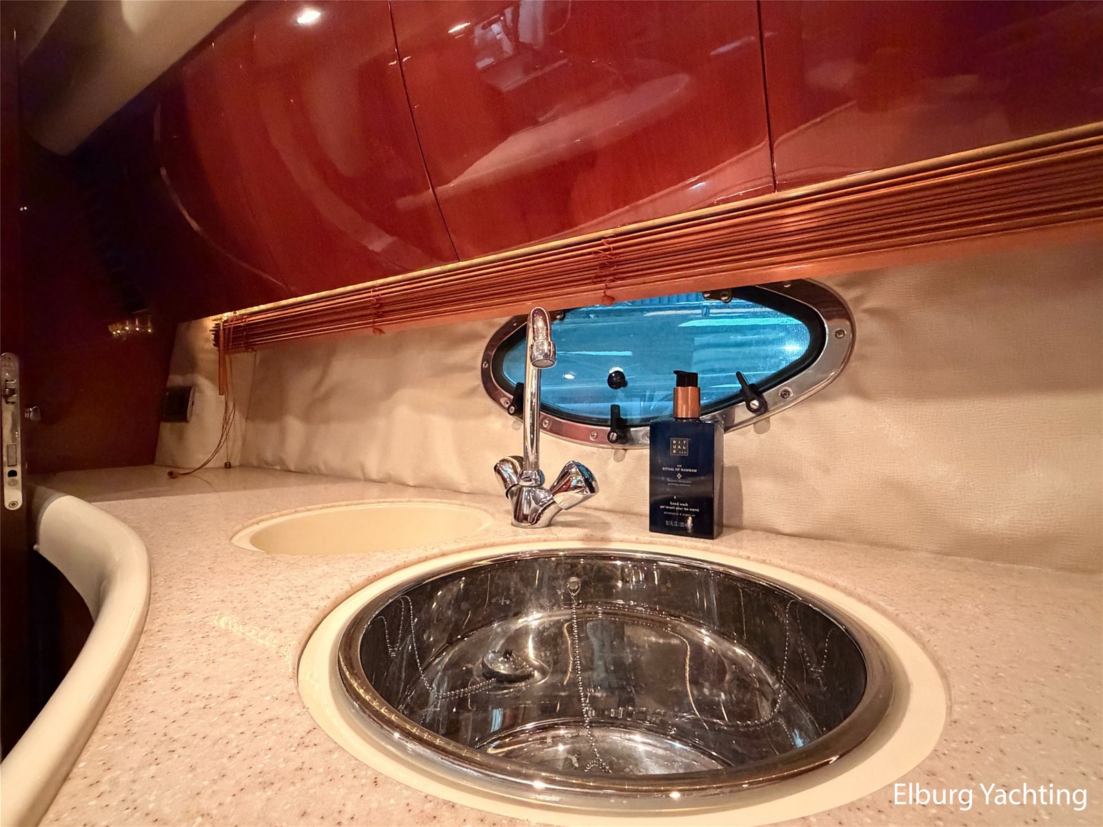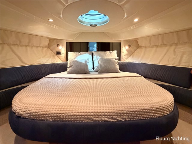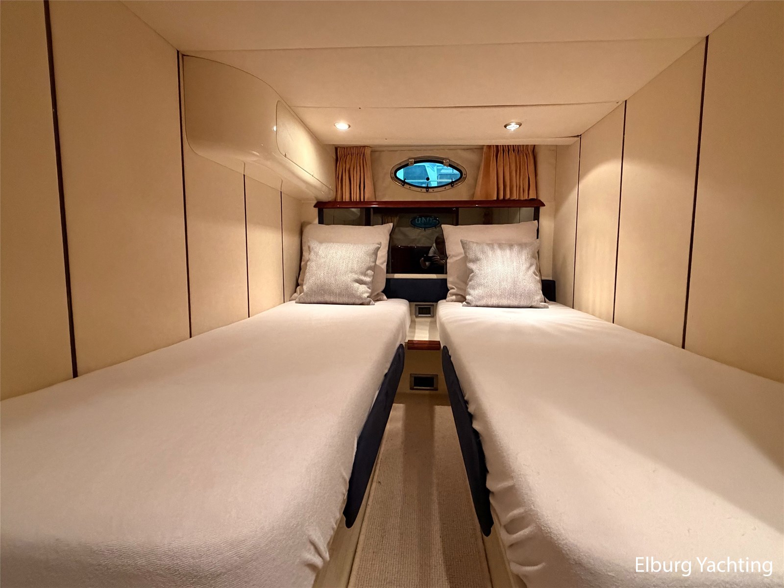 The Fairline Targa 43 is a true all-rounder in terms of its practical layout both above and below decks, but also with its sailing characteristics, this ship feels at home on many waters. This Fairline Targa 43 is propulsed by two powerful Volvo Penta engines with 480hp each and a solid transmission by propeller shafts. In the transom of the ship is a dinghy garage integrated with an electrically operated hatch. There is also a retractable Opacmare gangway available. The cockpit has leather cushions and a wetbar with sink/fridge/grill. The helm has a 2-person pilot bench. Below deck is a U-shaped dinette table situated with an open kitchen. In the bow you will find the owner's cabin with a 2-person French bed and private bathroom (toilet/shower) en-suite. The second toilet/shower is located centrally in the boat and can also be used as the day toilet. The guest cabin is found amidships and has a 2 x single bed. The engine room is accessible through the open cockpit. This Fairline Targa 43 is equipped with: Full tent around cockpit with extricable parts, removable sun bed on foredeck and aft deck, screens for portholes, trim tabs, multiple storage options in the open cockpit and aft under the sun bed. Complete upholstery in the open cockpit + sunbed renewed in 2022. Teak deck in the open cockpit and on bathing platform renewed in 2022. Maintenance on both main engines carried out in 11/2023.