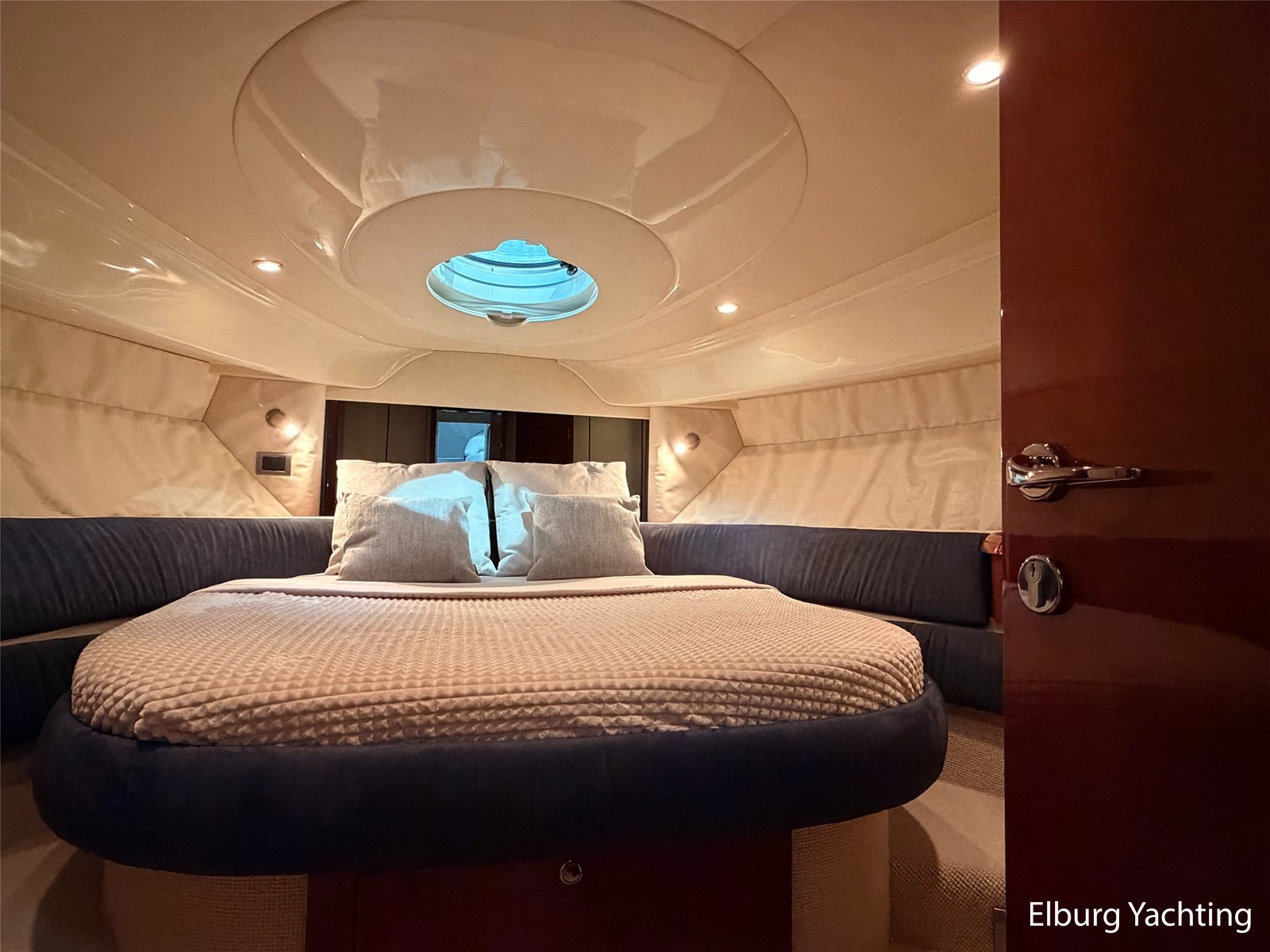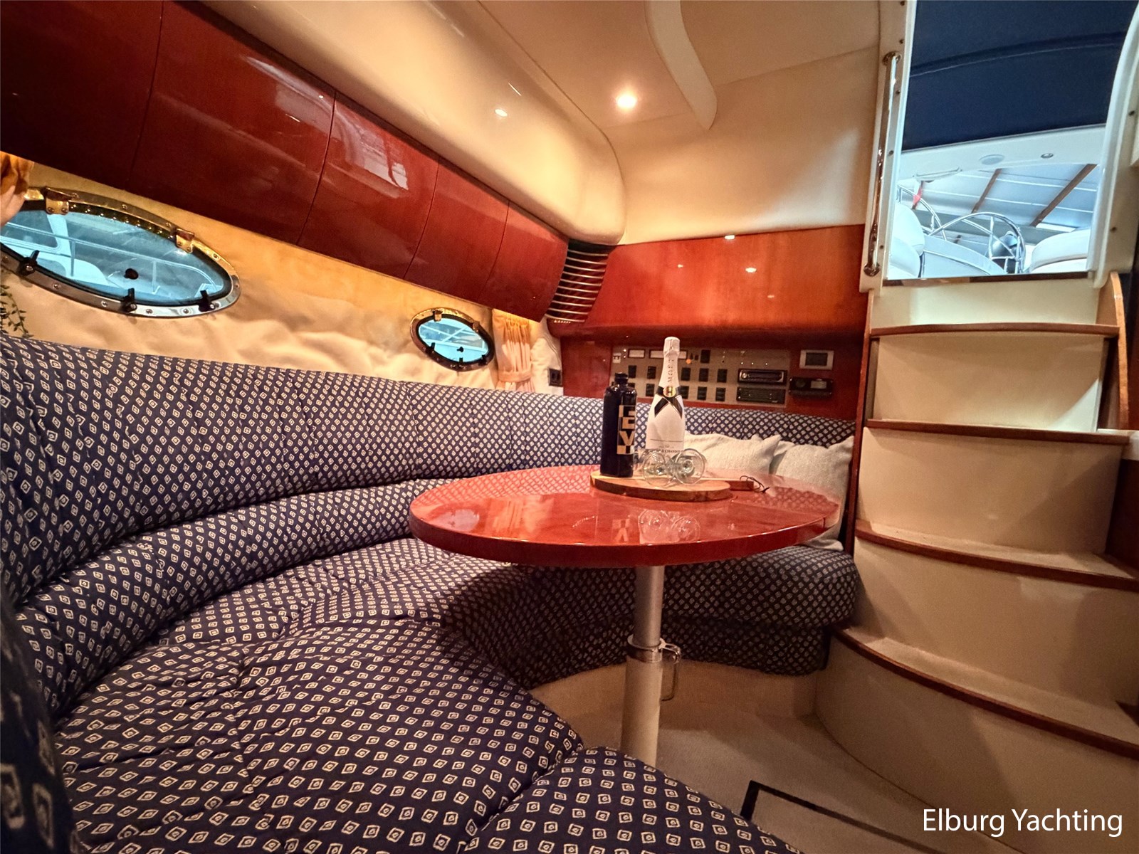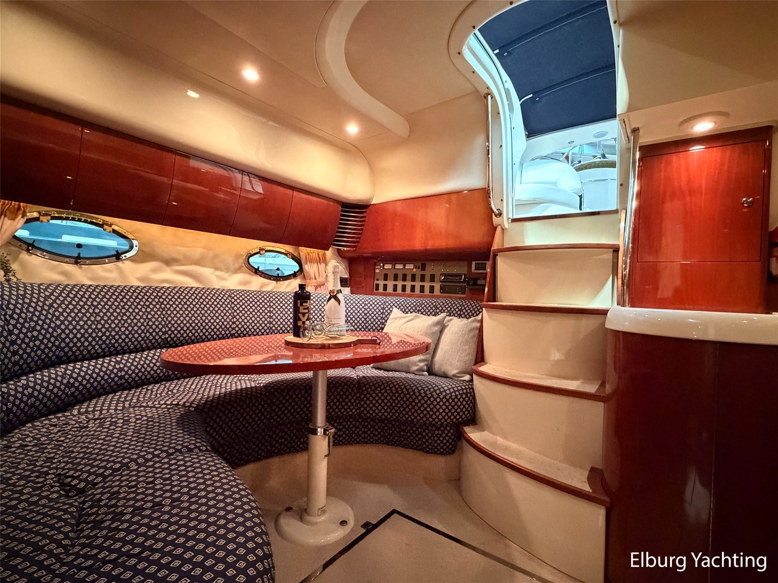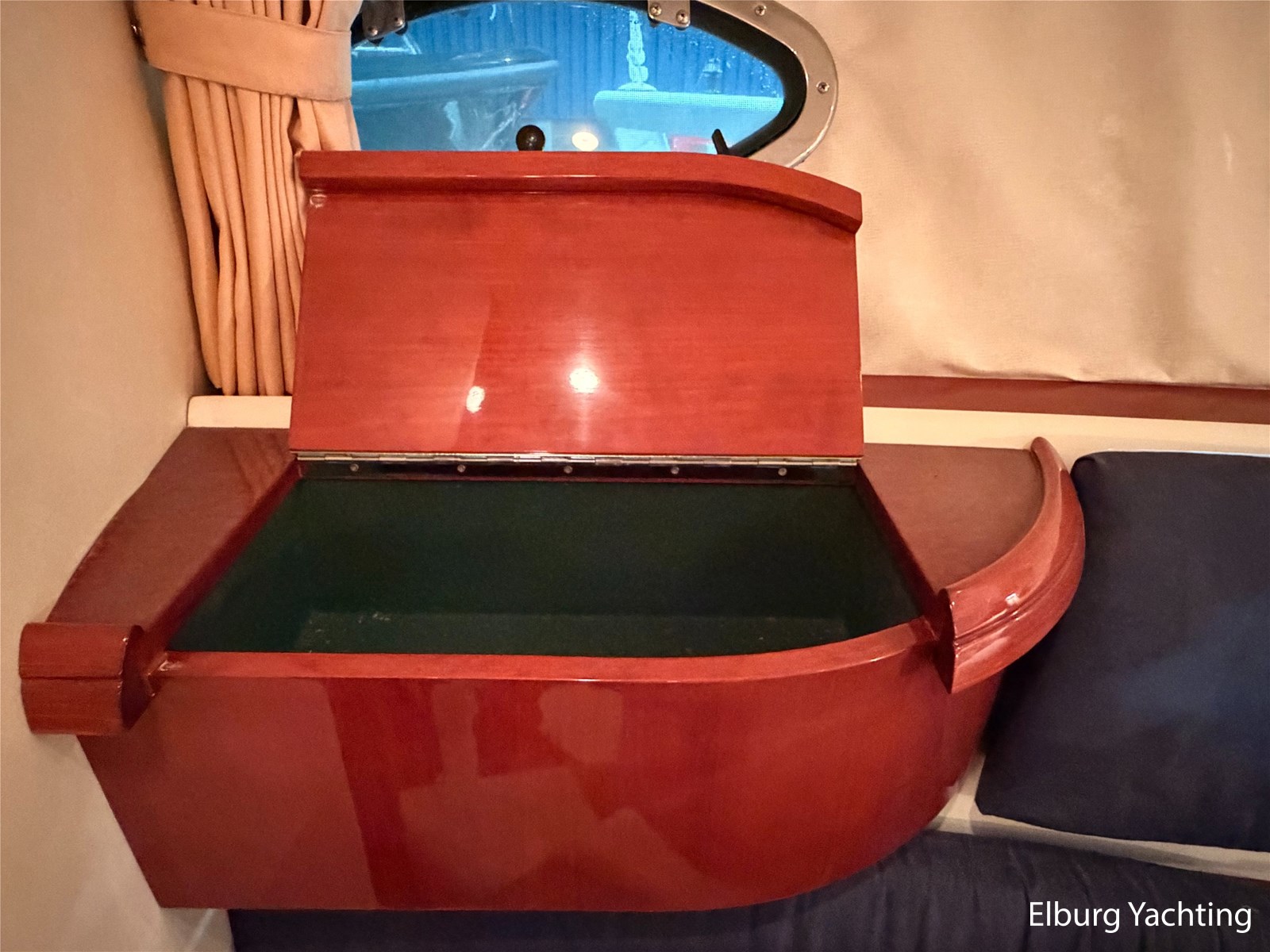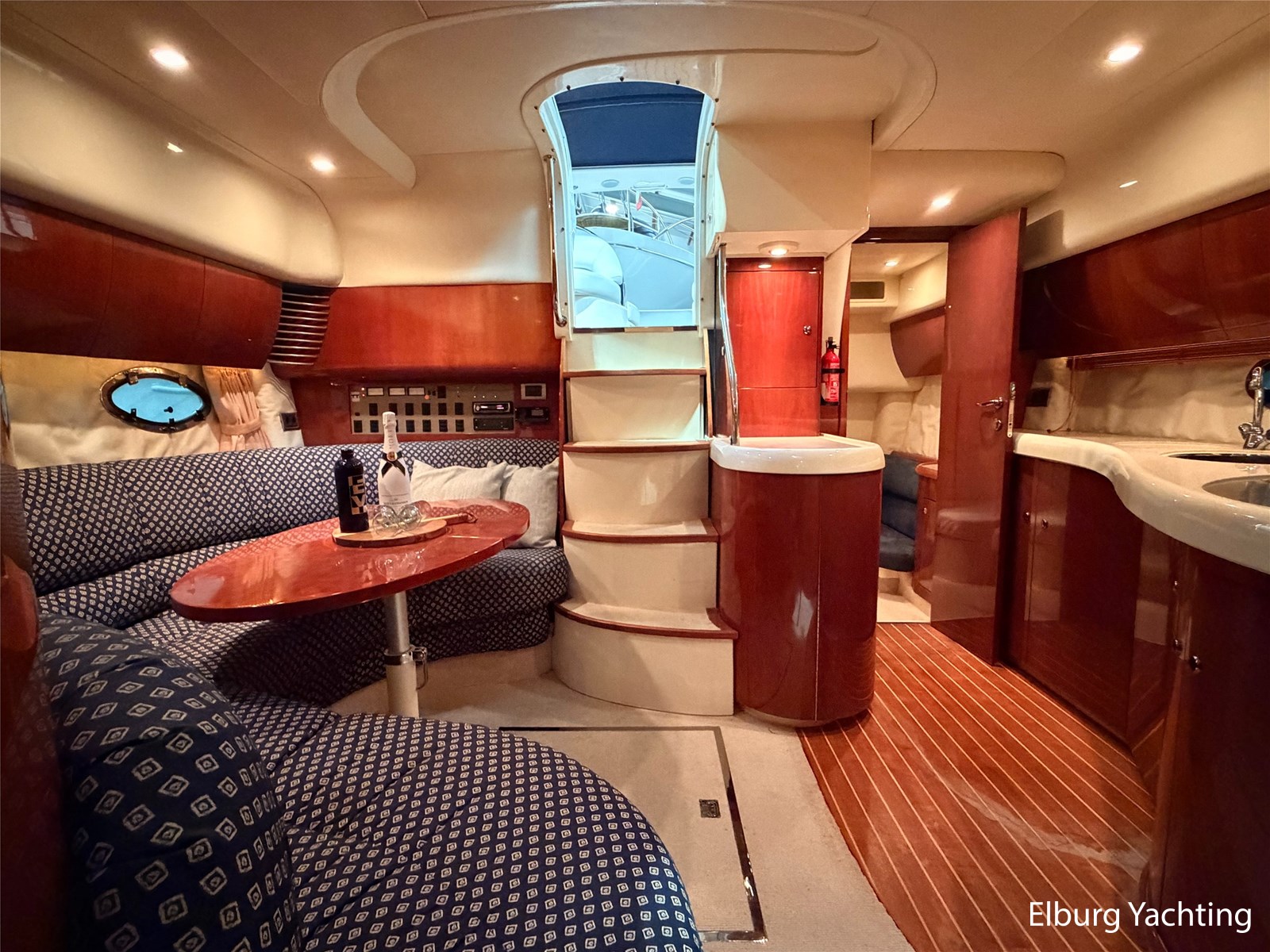 The Fairline Targa 43 is a true all-rounder in terms of its practical layout both above and below decks, but also with its sailing characteristics, this ship feels at home on many waters. This Fairline Targa 43 is propulsed by two powerful Volvo Penta engines with 480hp each and a solid transmission by propeller shafts. In the transom of the ship is a dinghy garage integrated with an electrically operated hatch. There is also a retractable Opacmare gangway available. The cockpit has leather cushions and a wetbar with sink/fridge/grill. The helm has a 2-person pilot bench. Below deck is a U-shaped dinette table situated with an open kitchen. In the bow you will find the owner's cabin with a 2-person French bed and private bathroom (toilet/shower) en-suite. The second toilet/shower is located centrally in the boat and can also be used as the day toilet. The guest cabin is found amidships and has a 2 x single bed. The engine room is accessible through the open cockpit. This Fairline Targa 43 is equipped with: Full tent around cockpit with extricable parts, removable sun bed on foredeck and aft deck, screens for portholes, trim tabs, multiple storage options in the open cockpit and aft under the sun bed. Complete upholstery in the open cockpit + sunbed renewed in 2022. Teak deck in the open cockpit and on bathing platform renewed in 2022. Maintenance on both main engines carried out in 11/2023.