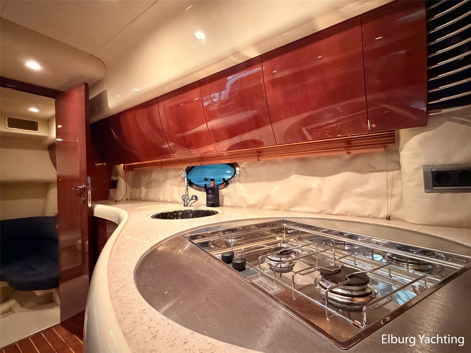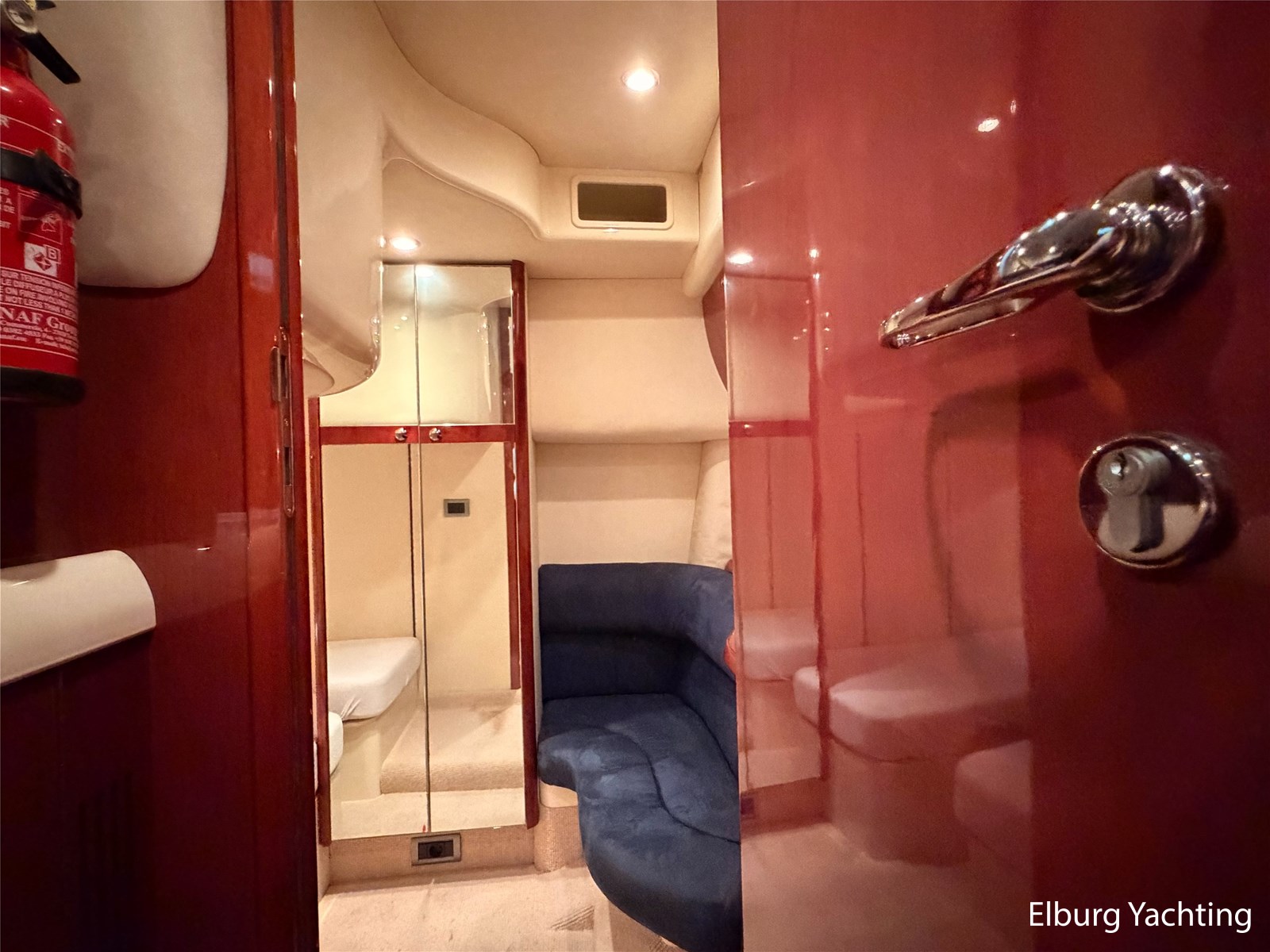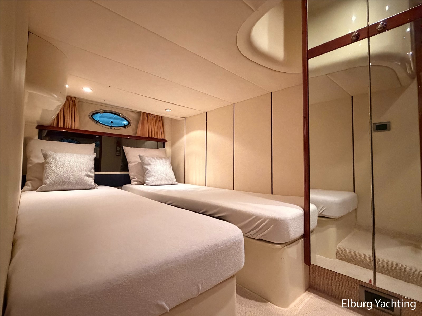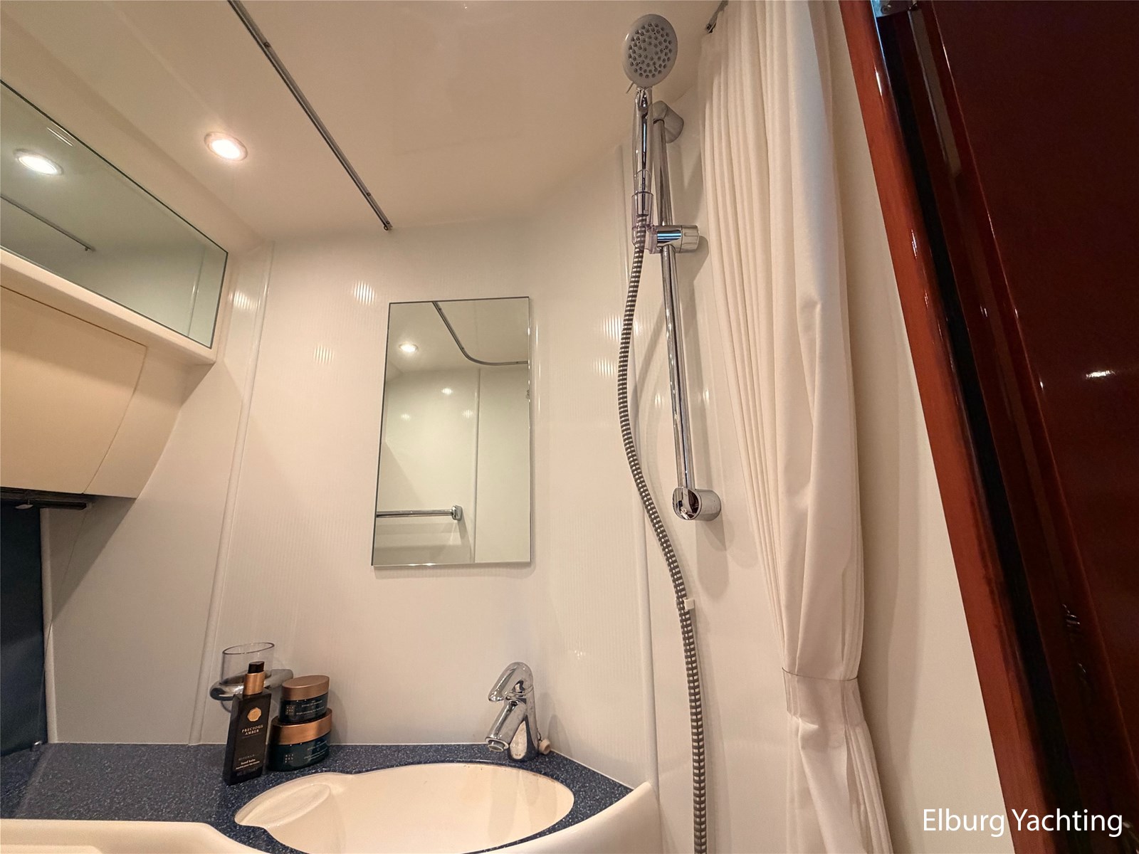 The Fairline Targa 43 is a true all-rounder in terms of its practical layout both above and below decks, but also with its sailing characteristics, this ship feels at home on many waters. This Fairline Targa 43 is propulsed by two powerful Volvo Penta engines with 480hp each and a solid transmission by propeller shafts. In the transom of the ship is a dinghy garage integrated with an electrically operated hatch. There is also a retractable Opacmare gangway available. The cockpit has leather cushions and a wetbar with sink/fridge/grill. The helm has a 2-person pilot bench. Below deck is a U-shaped dinette table situated with an open kitchen. In the bow you will find the owner's cabin with a 2-person French bed and private bathroom (toilet/shower) en-suite. The second toilet/shower is located centrally in the boat and can also be used as the day toilet. The guest cabin is found amidships and has a 2 x single bed. The engine room is accessible through the open cockpit. This Fairline Targa 43 is equipped with: Full tent around cockpit with extricable parts, removable sun bed on foredeck and aft deck, screens for portholes, trim tabs, multiple storage options in the open cockpit and aft under the sun bed. Complete upholstery in the open cockpit + sunbed renewed in 2022. Teak deck in the open cockpit and on bathing platform renewed in 2022. Maintenance on both main engines carried out in 11/2023.
