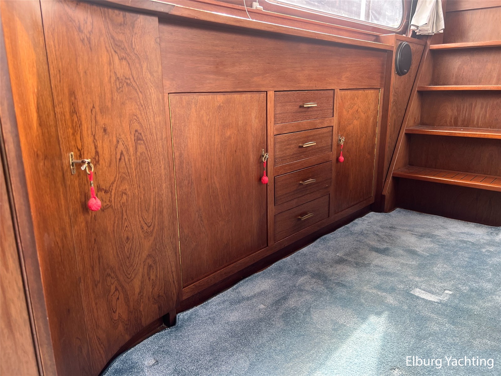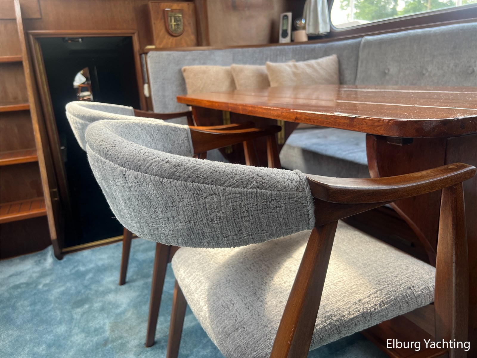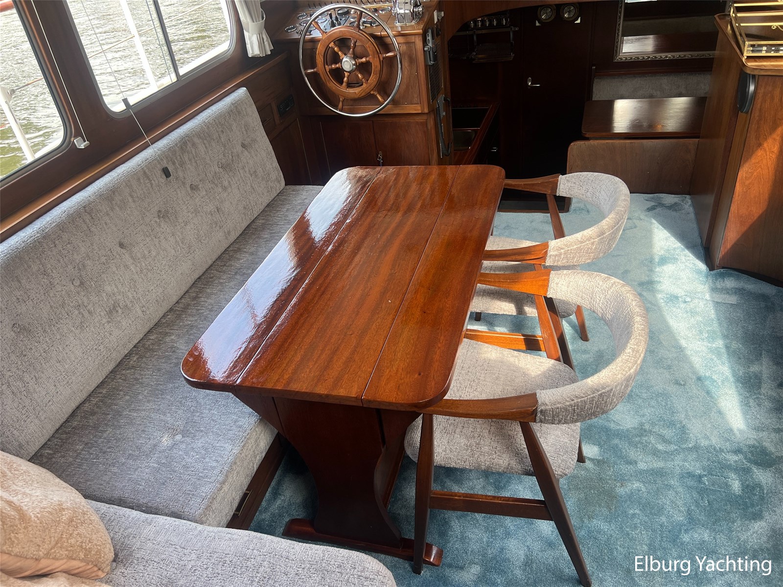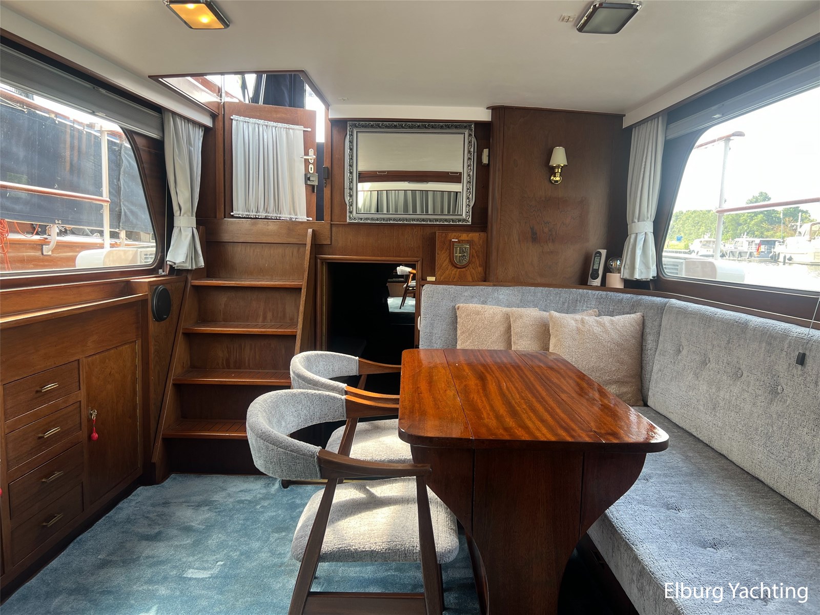 - Teak interieur met tapijt door het gehele schip