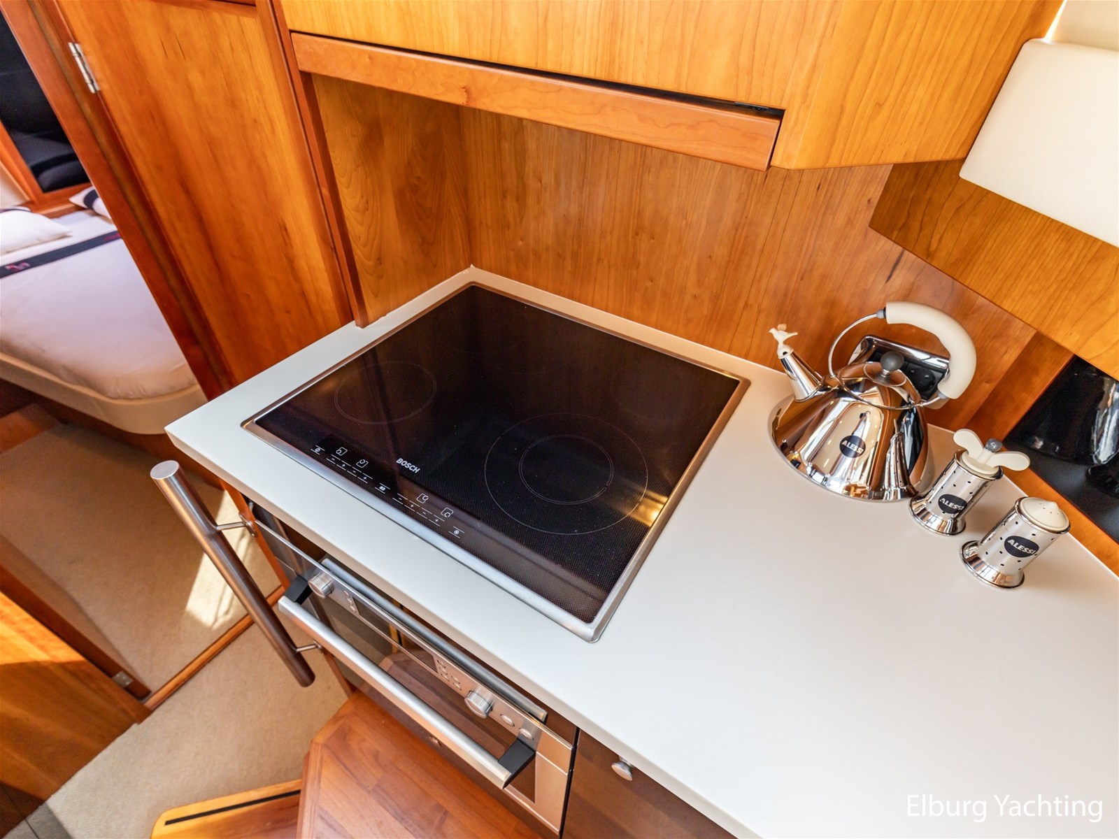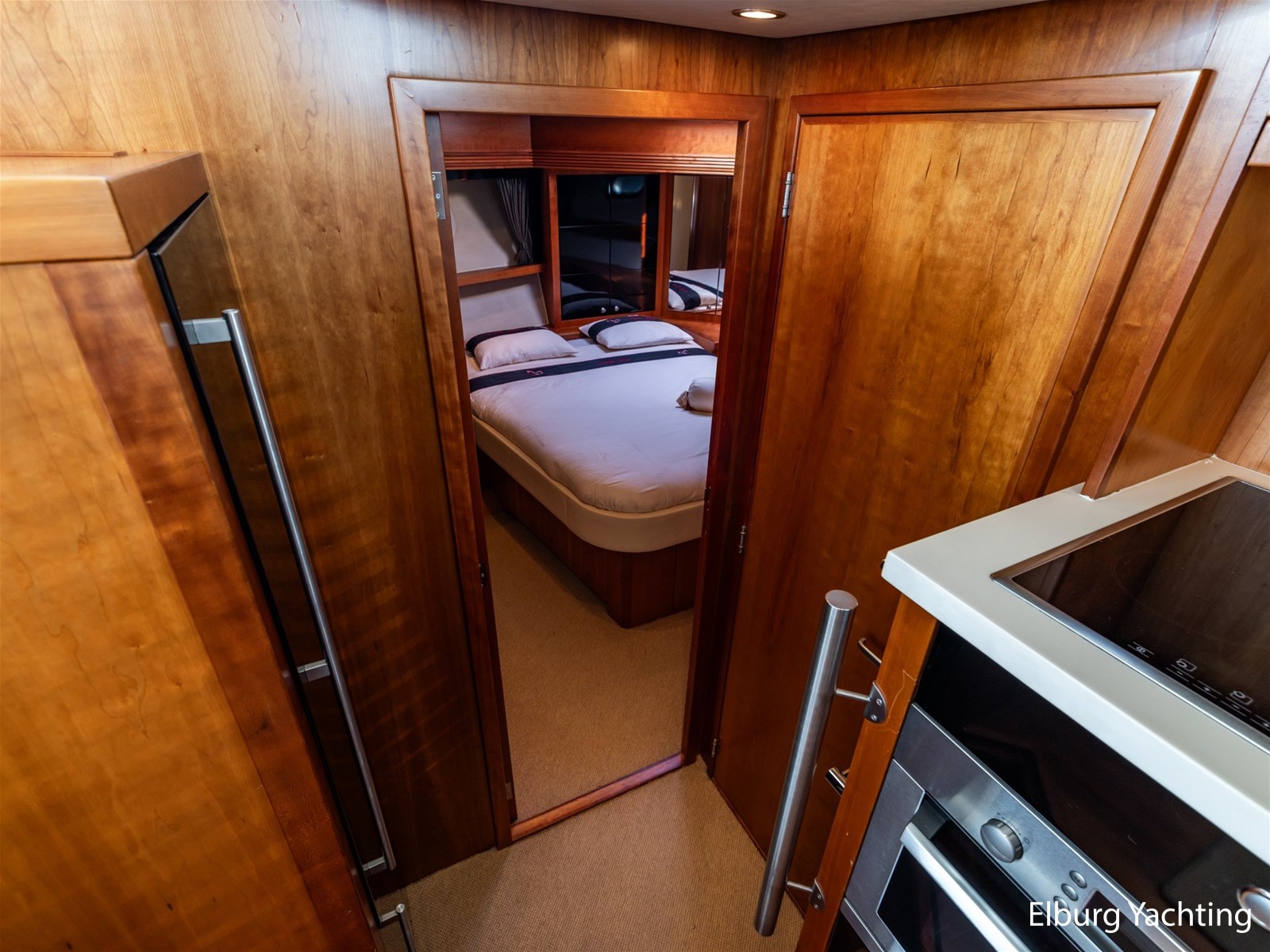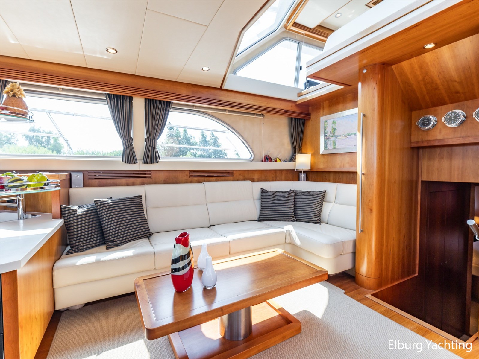 Vanuit de stuurhut loopt u via een niveauverschil naar de ruime salon, uitgevoerd in teak met crème-witte lederen bekleding en royale lichtinval dankzij de grote ramen. Aansluitend bevindt zich, een niveau lager, de volledig uitgeruste kombuis. Deze keuken is voorzien van een Corian werkblad, keramische kookplaat, afzuigkap, Bosch oven, combimagnetron en dubbele koelkast. Alles is aanwezig om aan boord volwaardig te kunnen koken en leven.