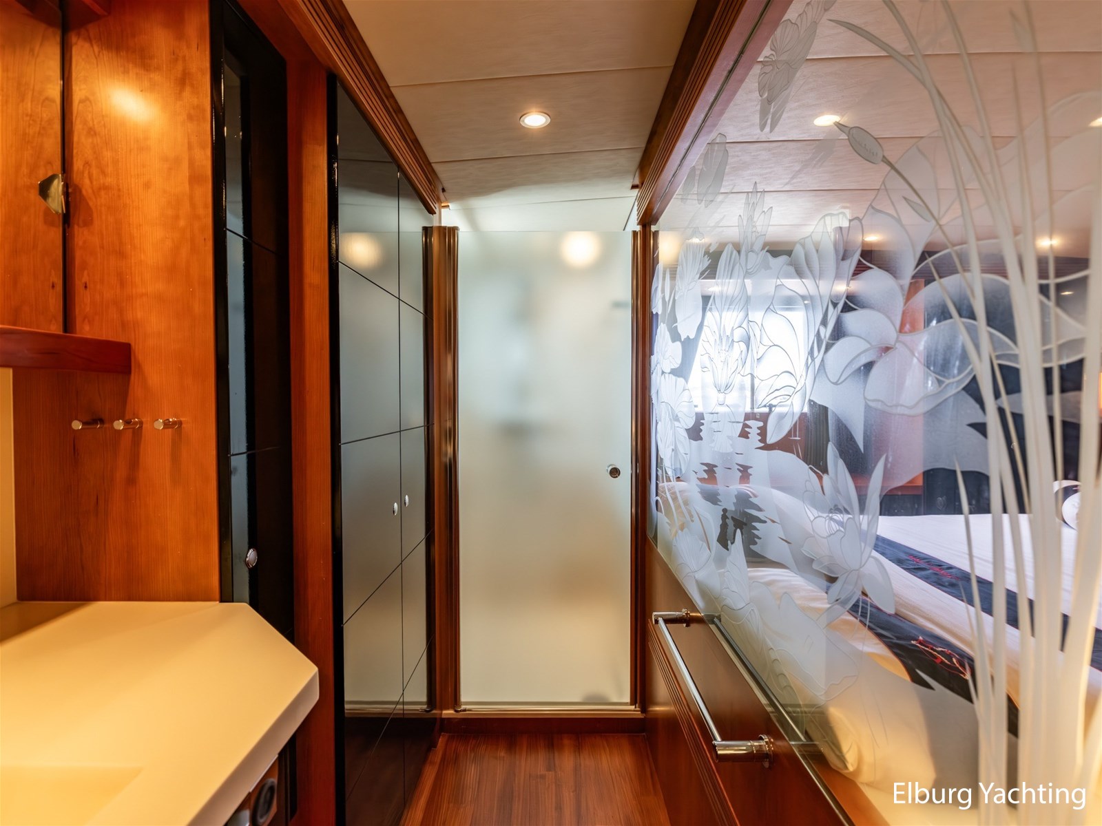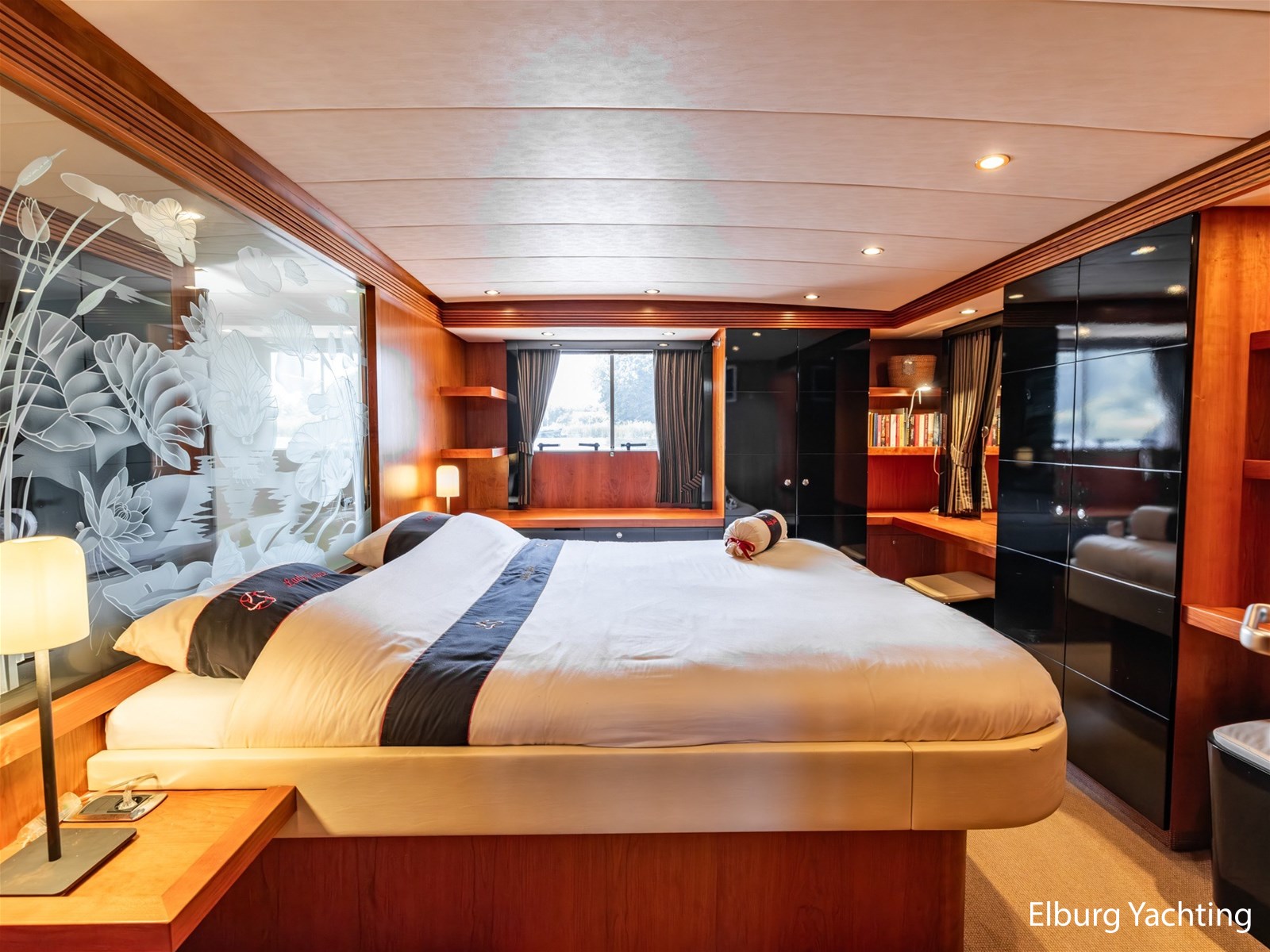 De eigenaarshut achterin is bijzonder royaal en beslaat de volle breedte van het schip. Deze luxe 'full beam' master cabin beschikt over een vrijstaand tweepersoonsbed, een badkamer en suite, ruime kastopstelling en een sfeervolle afwerking.