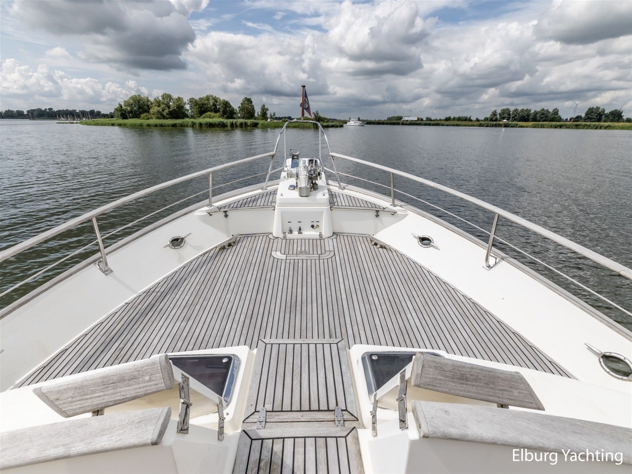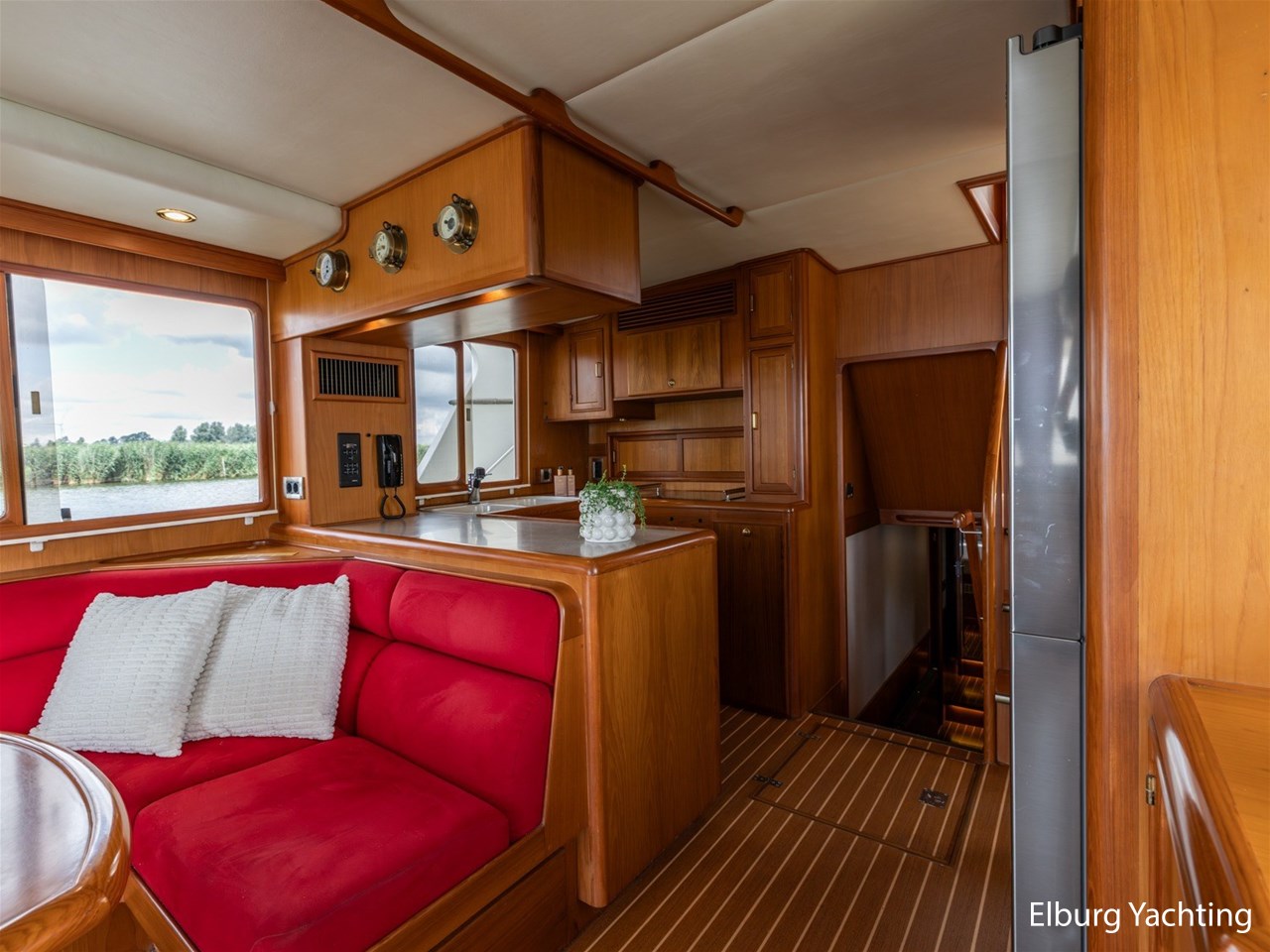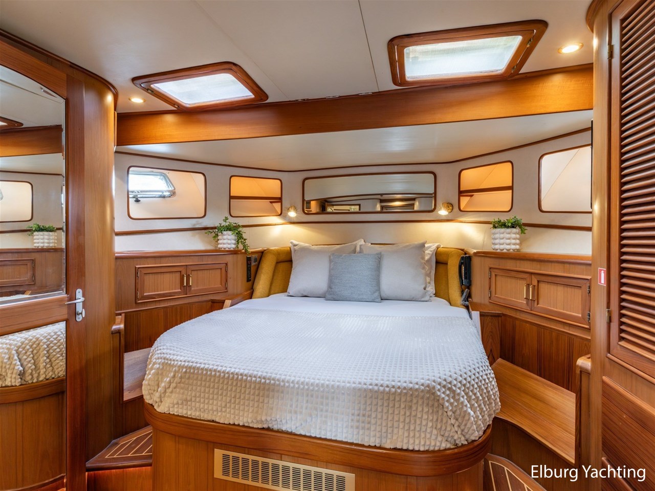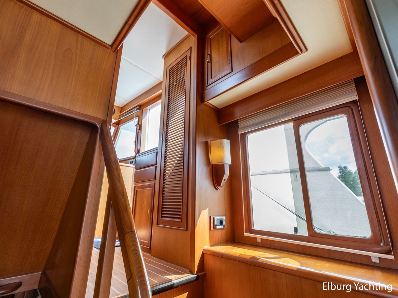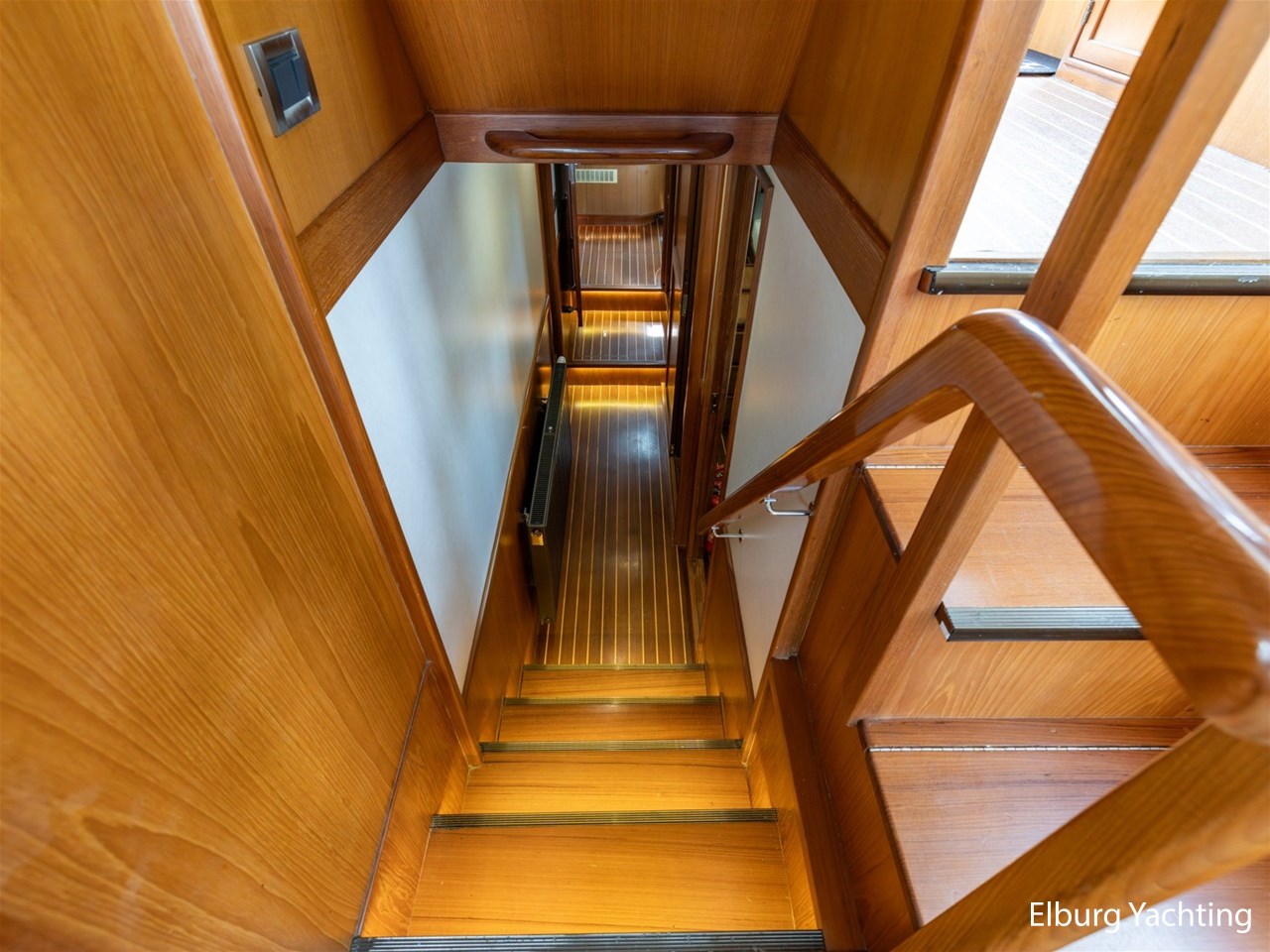 De indeling biedt een ruime eigenaarshut met kingsize 2 pers. bed en badkamer ensuite, twee extra slaaphutten met elk 2 x een 1 pers. bed. , drie dinette-opstellingen en een grote salon met veel daglicht. De flybridge is bereikbaar via zowel het stuurhuis als het achterdek., ruime zitgelegenheid op flybridge, bijbootsteunen op vaste dak. Het jacht is voorzien van een volledig teakdek rondom, ruime bergmogelijkheden en een separate toegang tot de machinekamer.