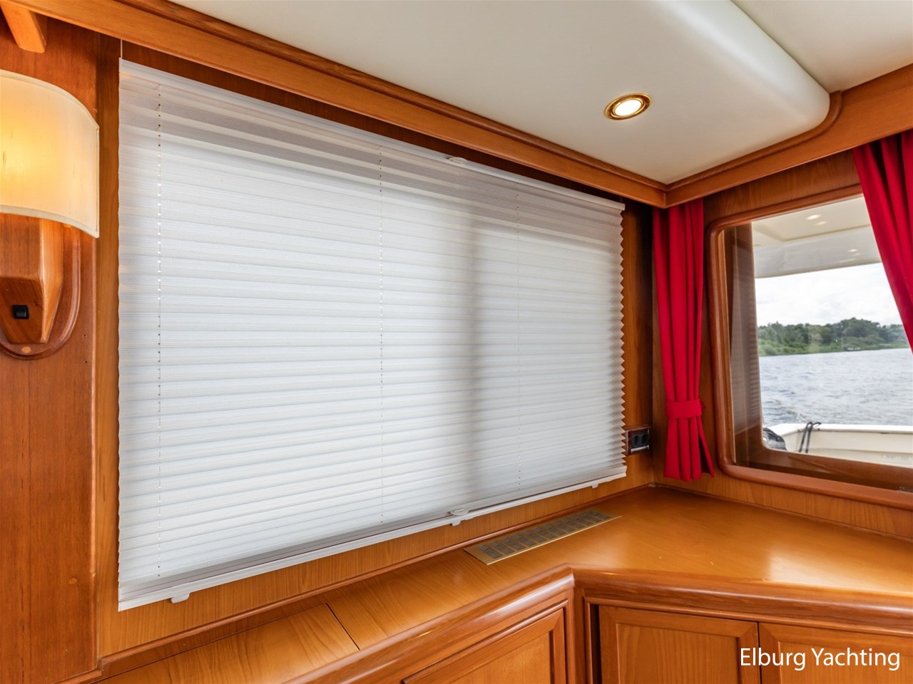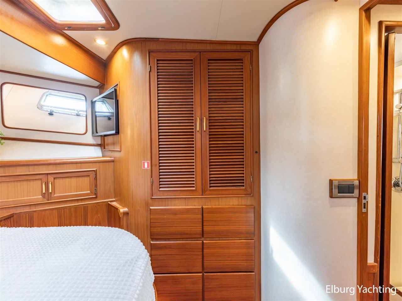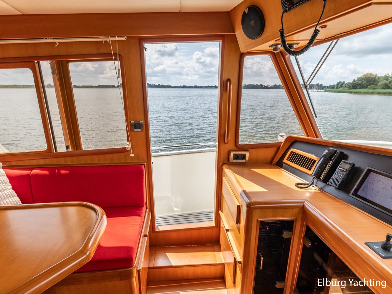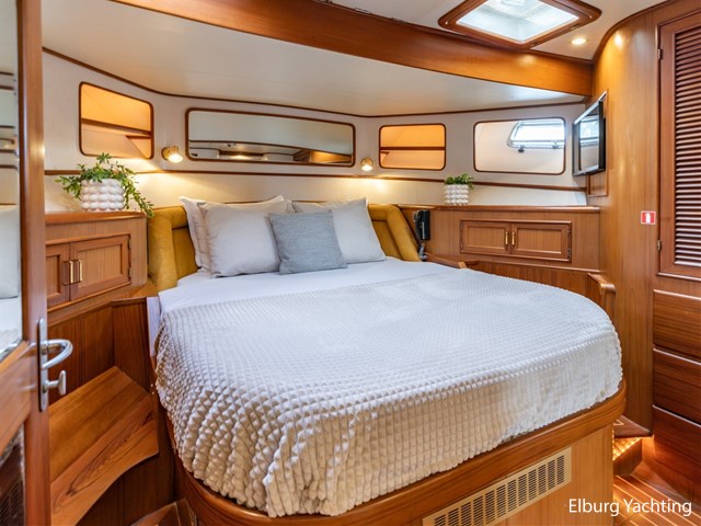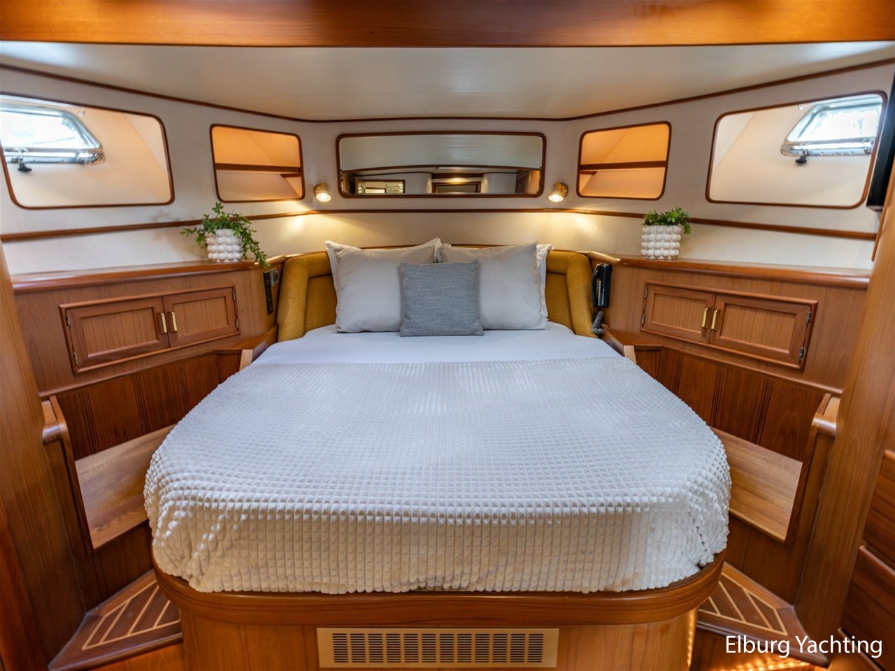 De indeling biedt een ruime eigenaarshut met kingsize 2 pers. bed en badkamer ensuite, twee extra slaaphutten met elk 2 x een 1 pers. bed. , drie dinette-opstellingen en een grote salon met veel daglicht. De flybridge is bereikbaar via zowel het stuurhuis als het achterdek., ruime zitgelegenheid op flybridge, bijbootsteunen op vaste dak. Het jacht is voorzien van een volledig teakdek rondom, ruime bergmogelijkheden en een separate toegang tot de machinekamer.