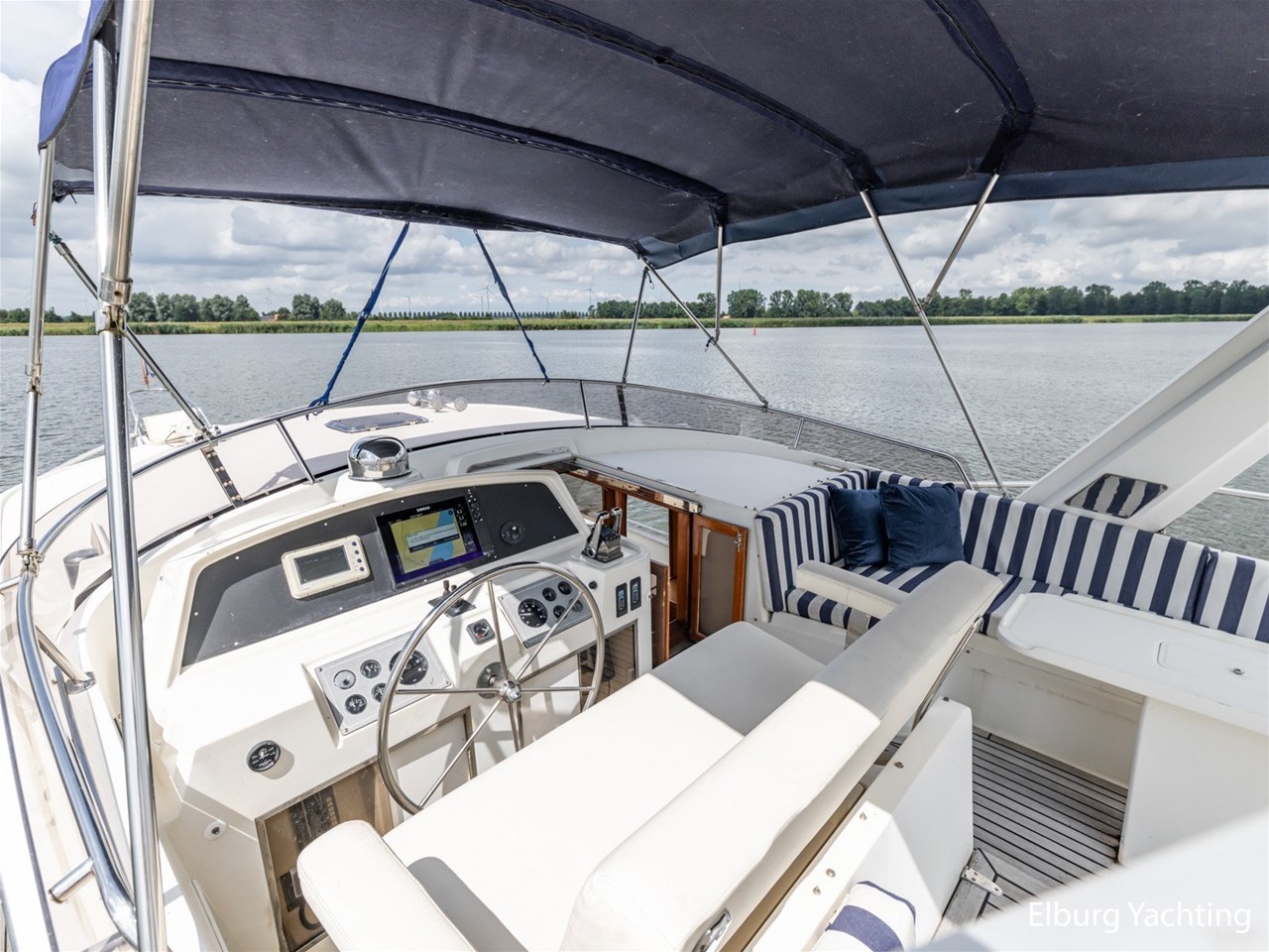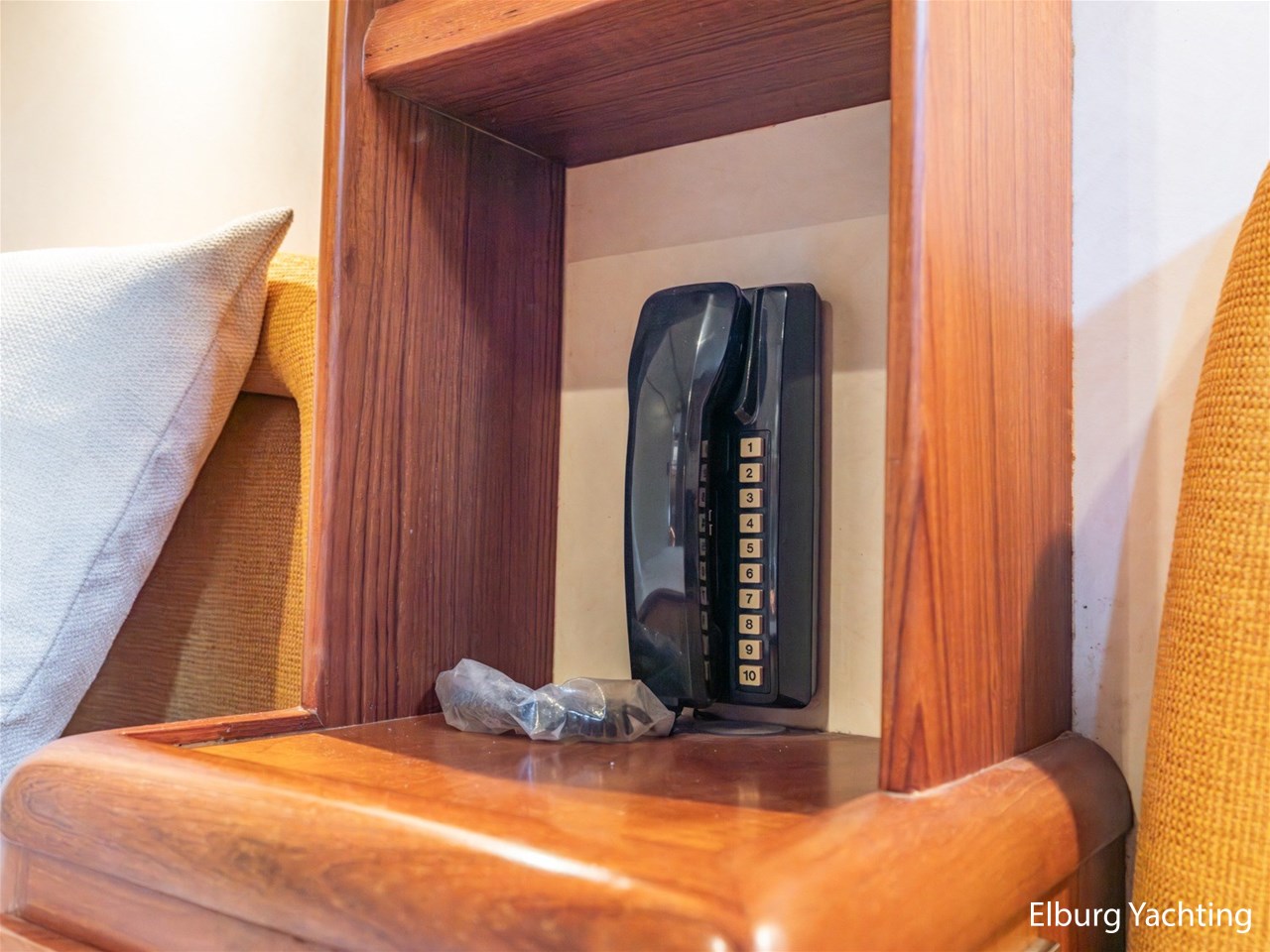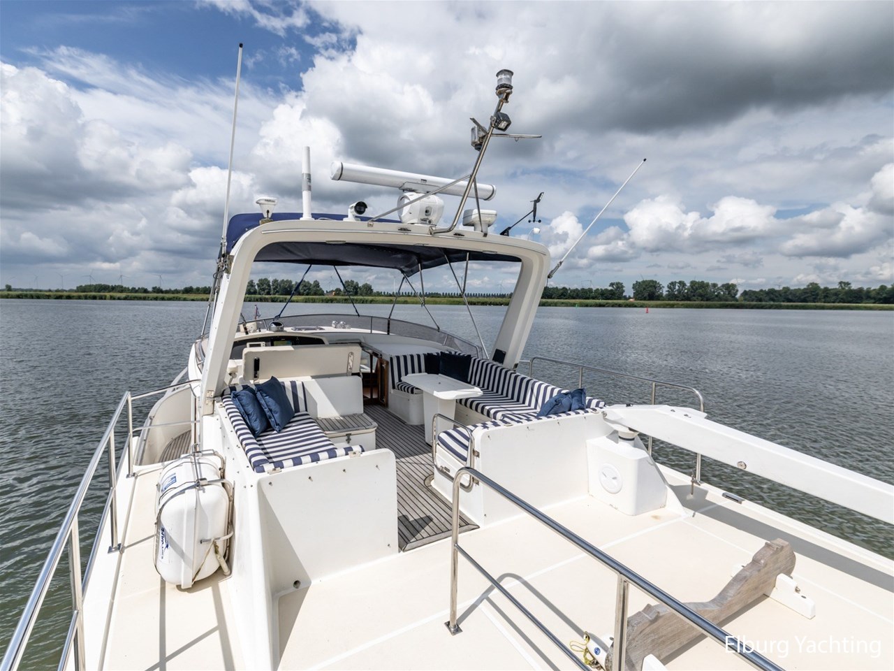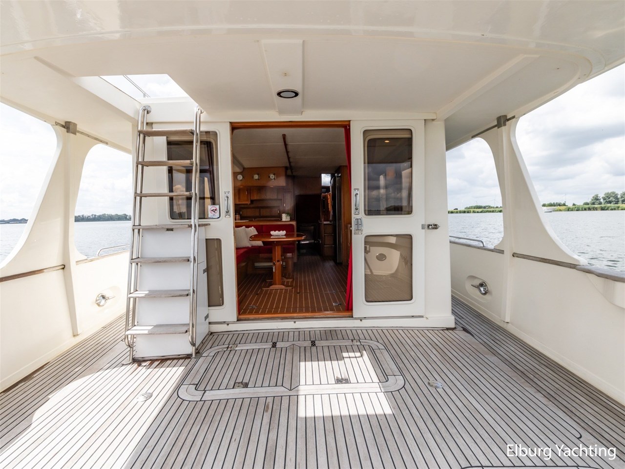 De indeling biedt een ruime eigenaarshut met kingsize 2 pers. bed en badkamer ensuite, twee extra slaaphutten met elk 2 x een 1 pers. bed. , drie dinette-opstellingen en een grote salon met veel daglicht. De flybridge is bereikbaar via zowel het stuurhuis als het achterdek., ruime zitgelegenheid op flybridge, bijbootsteunen op vaste dak. Het jacht is voorzien van een volledig teakdek rondom, ruime bergmogelijkheden en een separate toegang tot de machinekamer.
