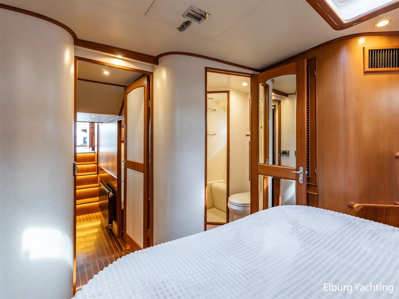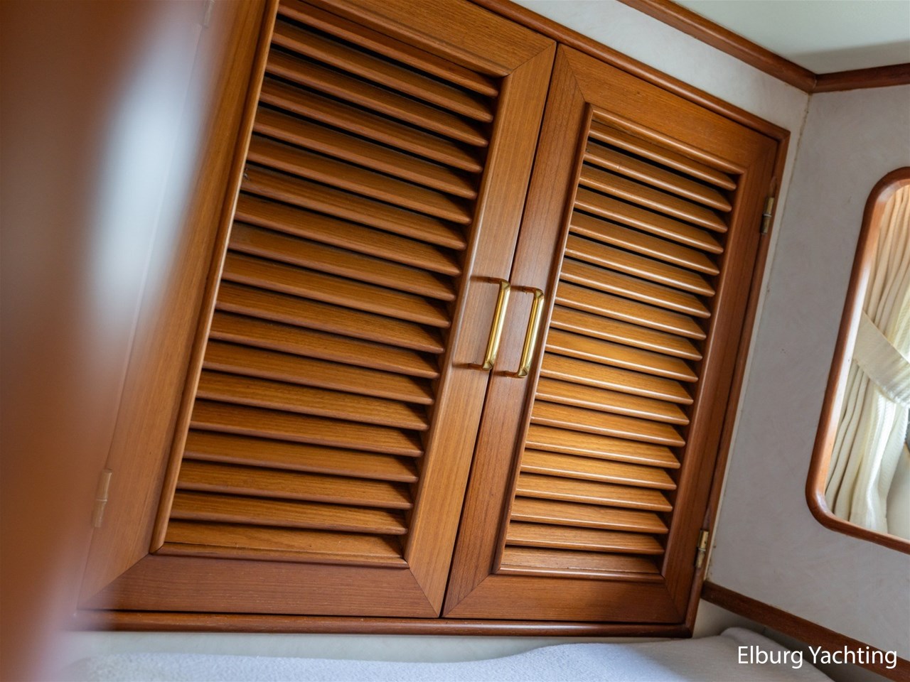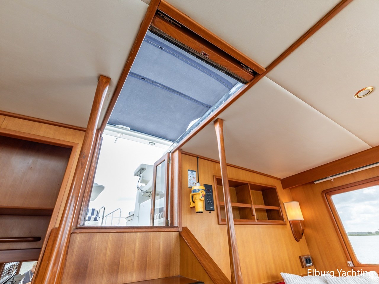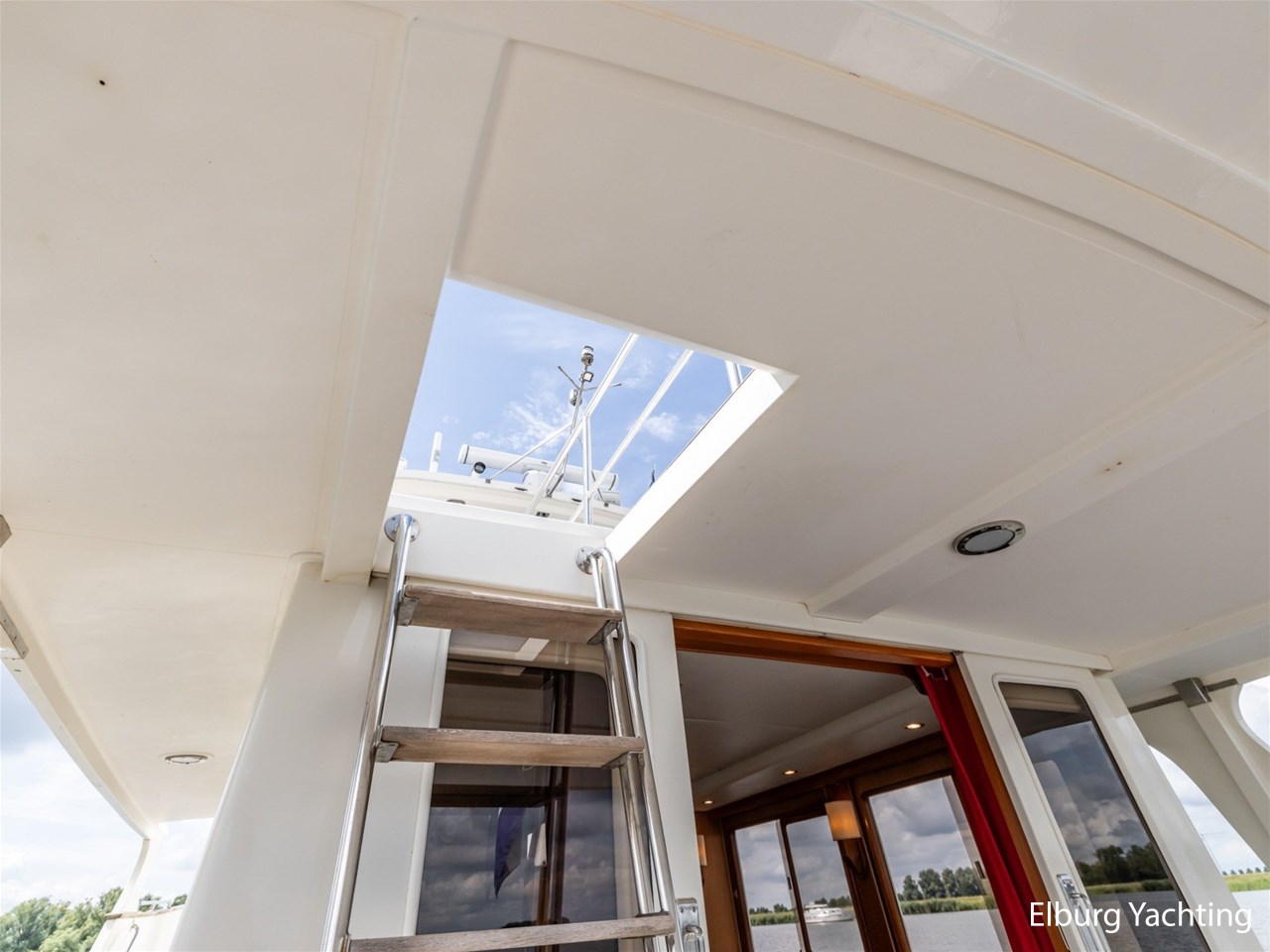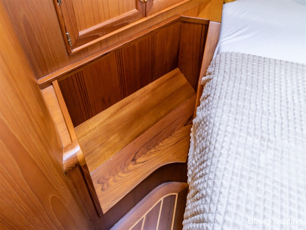 De indeling biedt een ruime eigenaarshut met kingsize 2 pers. bed en badkamer ensuite, twee extra slaaphutten met elk 2 x een 1 pers. bed. , drie dinette-opstellingen en een grote salon met veel daglicht. De flybridge is bereikbaar via zowel het stuurhuis als het achterdek., ruime zitgelegenheid op flybridge, bijbootsteunen op vaste dak. Het jacht is voorzien van een volledig teakdek rondom, ruime bergmogelijkheden en een separate toegang tot de machinekamer.