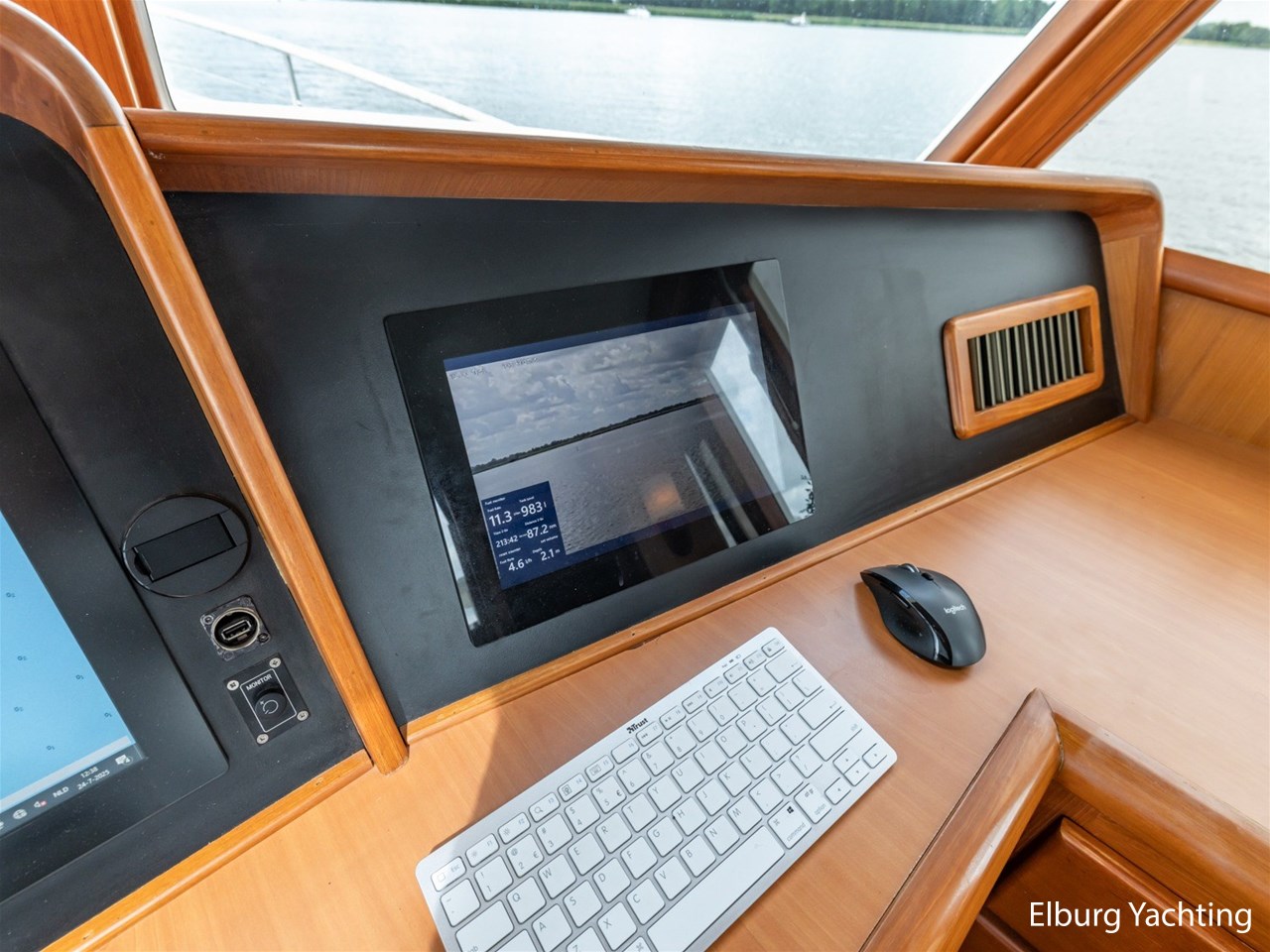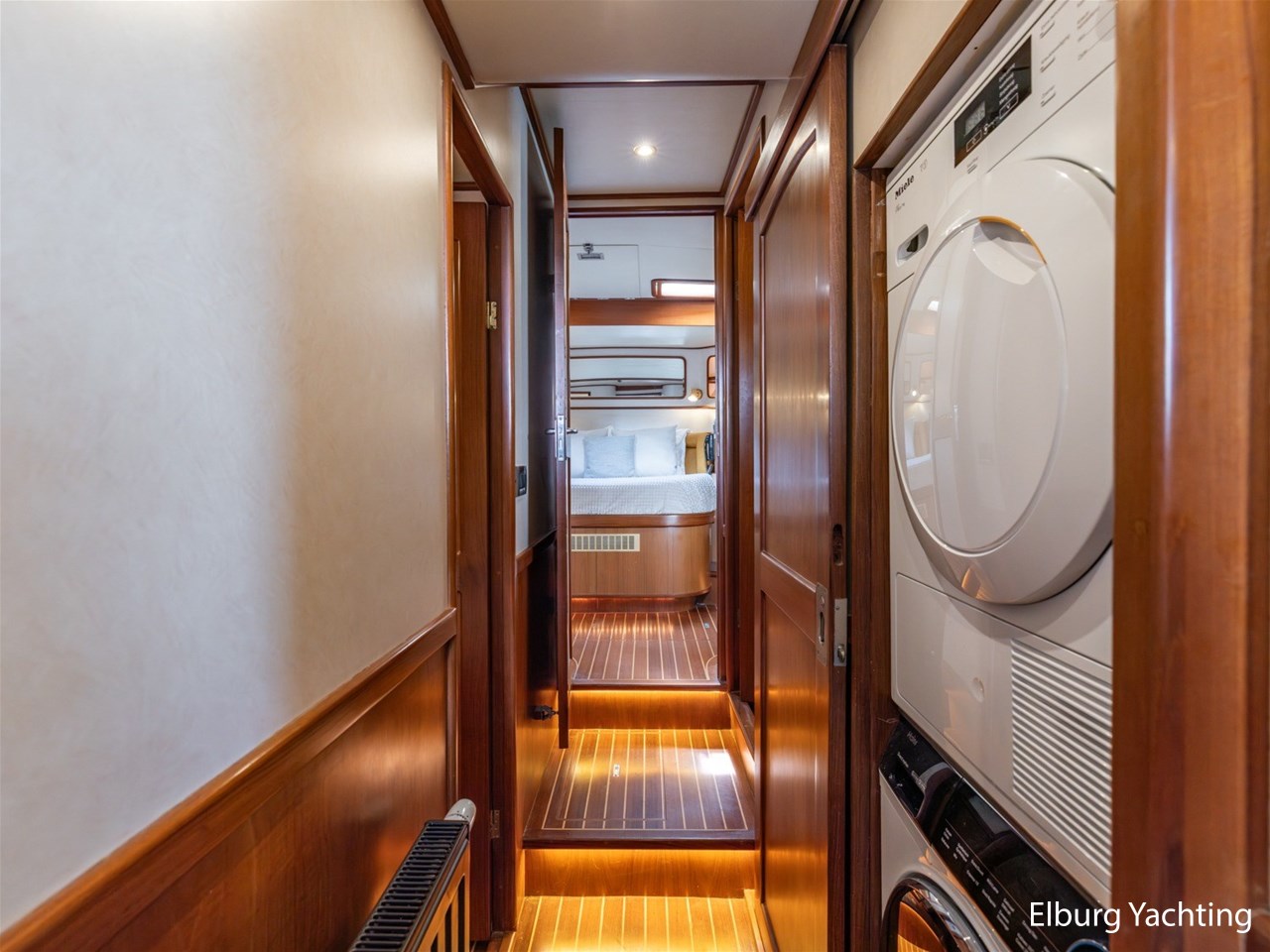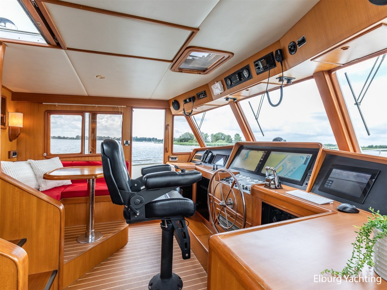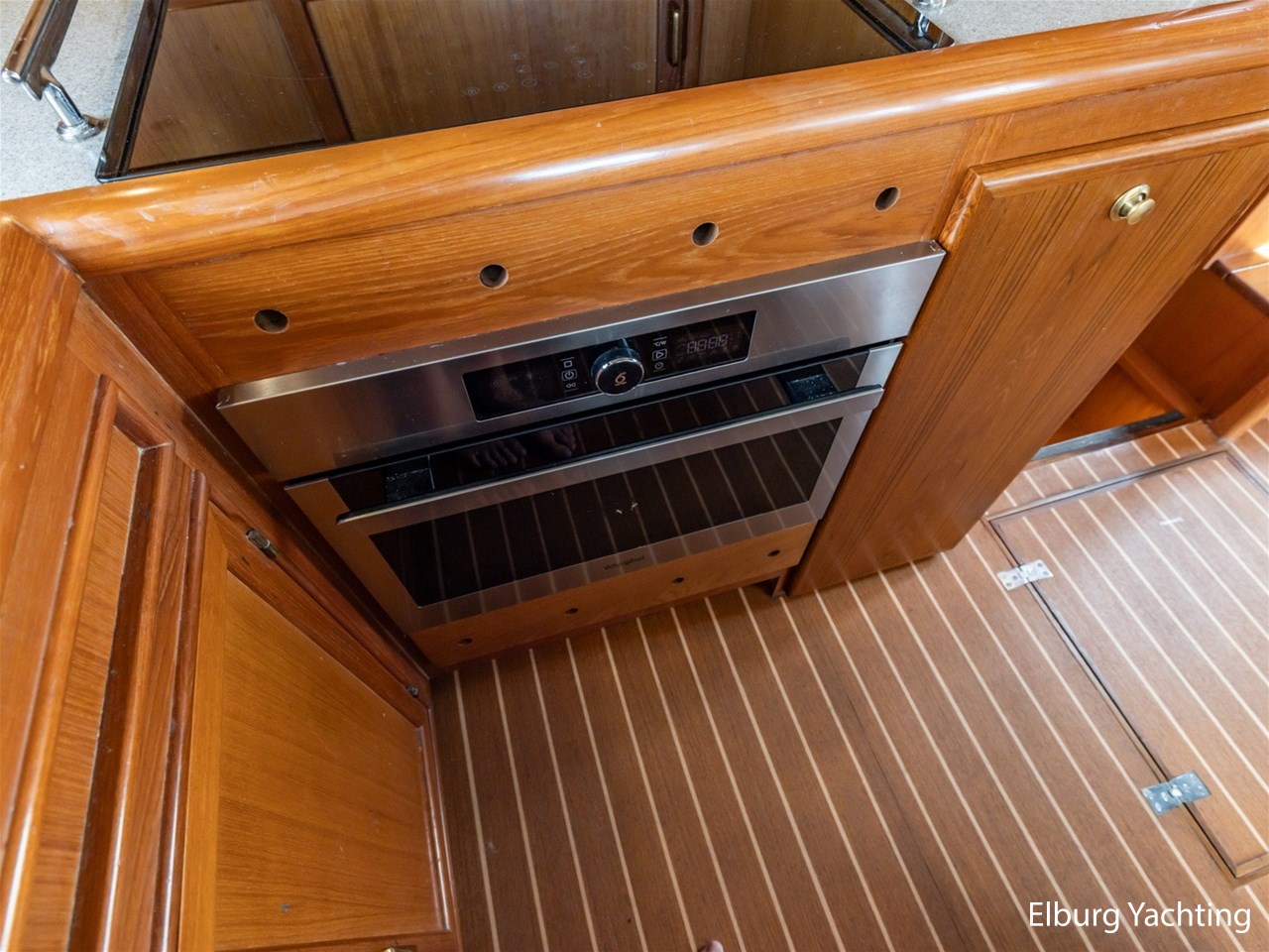 De indeling biedt een ruime eigenaarshut met kingsize 2 pers. bed en badkamer ensuite, twee extra slaaphutten met elk 2 x een 1 pers. bed. , drie dinette-opstellingen en een grote salon met veel daglicht. De flybridge is bereikbaar via zowel het stuurhuis als het achterdek., ruime zitgelegenheid op flybridge, bijbootsteunen op vaste dak. Het jacht is voorzien van een volledig teakdek rondom, ruime bergmogelijkheden en een separate toegang tot de machinekamer.