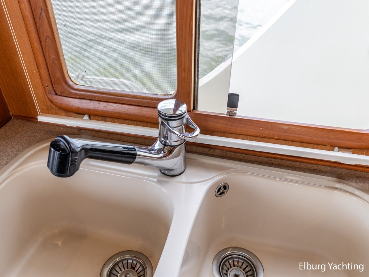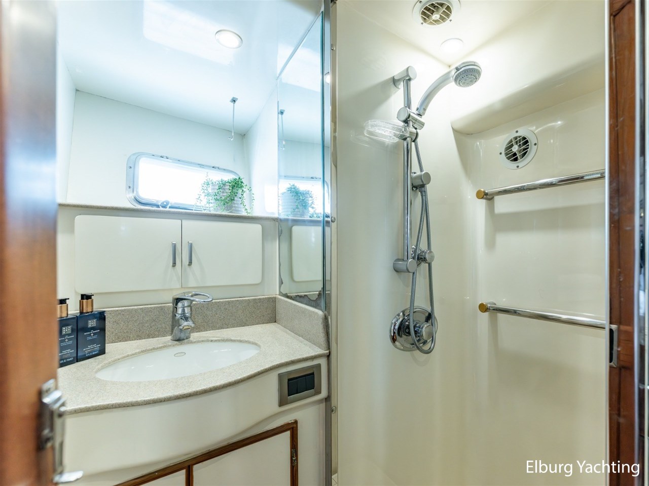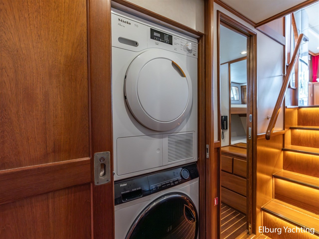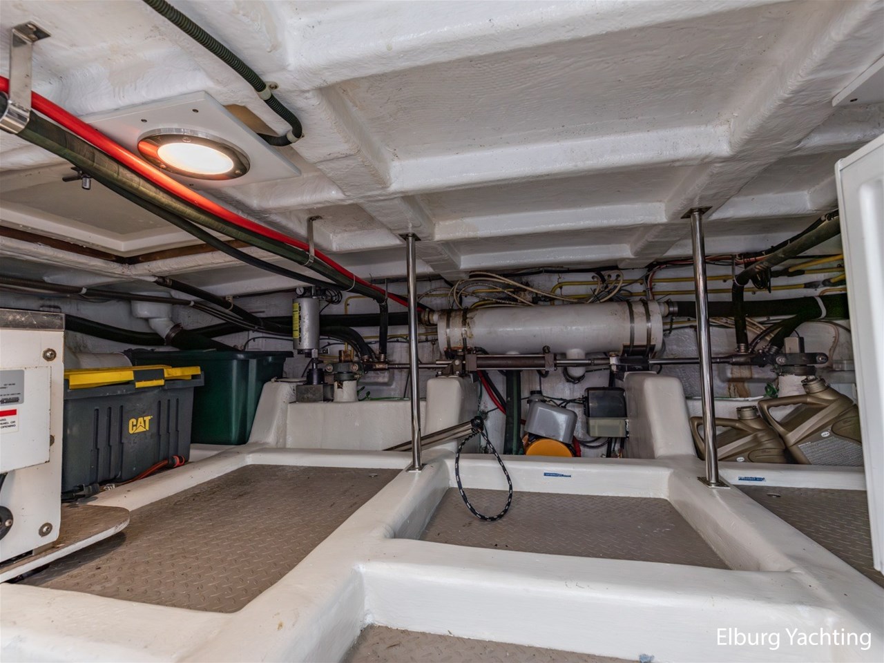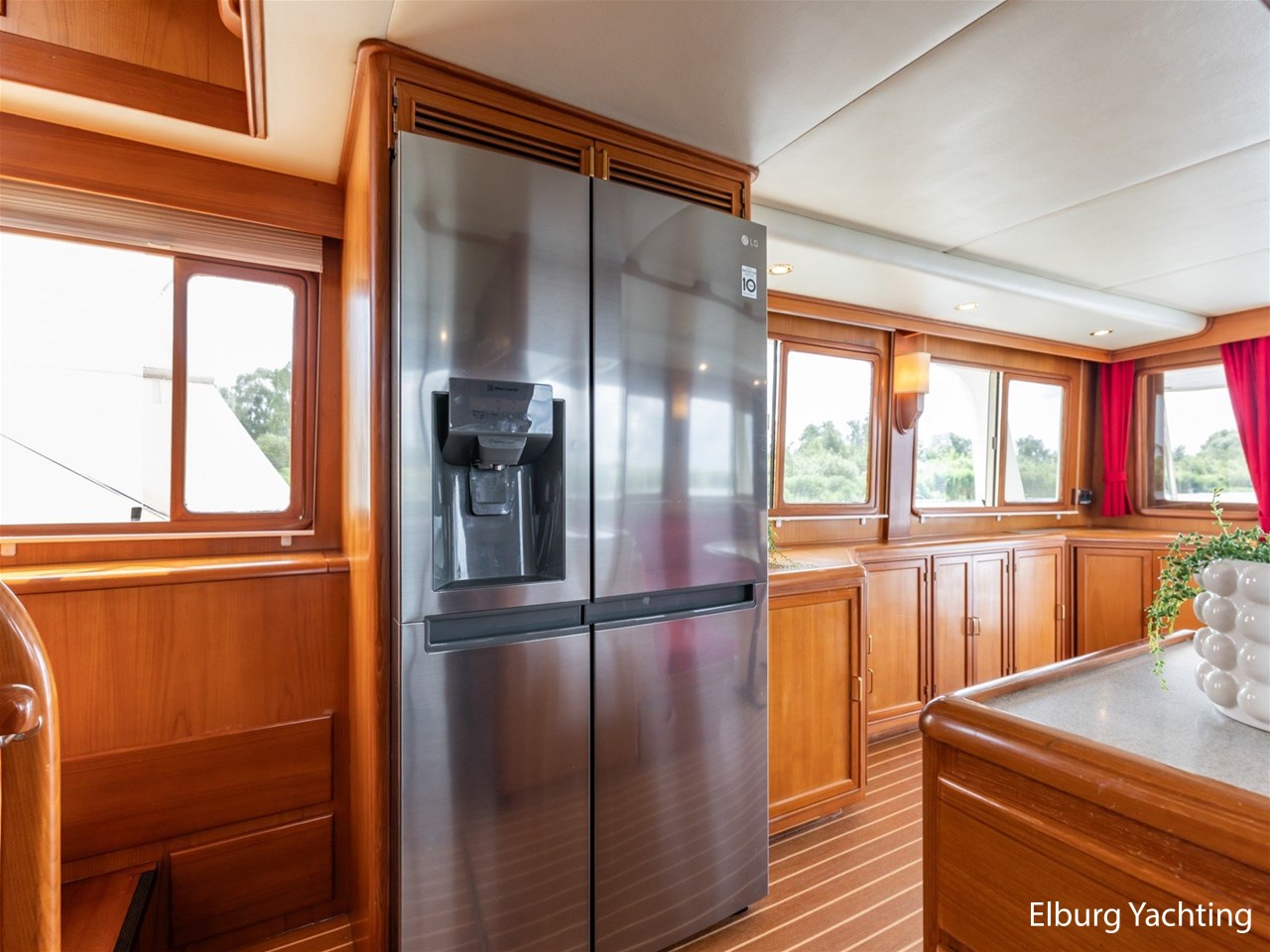 De indeling biedt een ruime eigenaarshut met kingsize 2 pers. bed en badkamer ensuite, twee extra slaaphutten met elk 2 x een 1 pers. bed. , drie dinette-opstellingen en een grote salon met veel daglicht. De flybridge is bereikbaar via zowel het stuurhuis als het achterdek., ruime zitgelegenheid op flybridge, bijbootsteunen op vaste dak. Het jacht is voorzien van een volledig teakdek rondom, ruime bergmogelijkheden en een separate toegang tot de machinekamer.