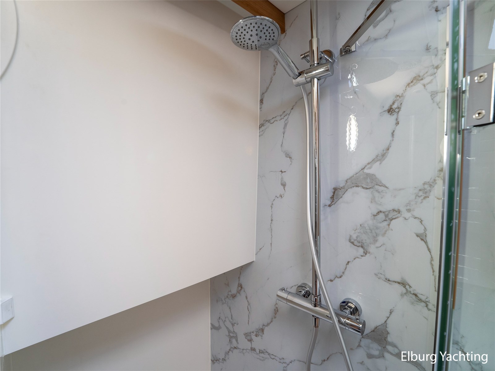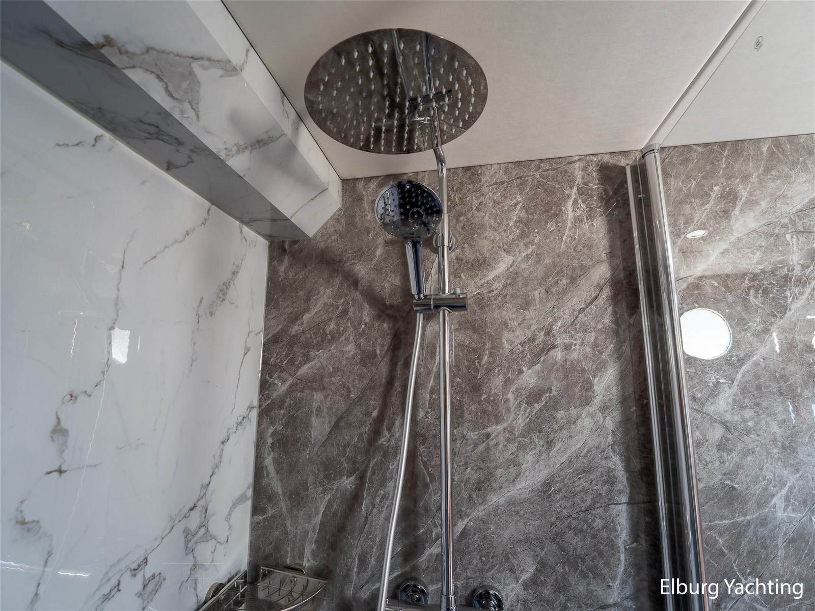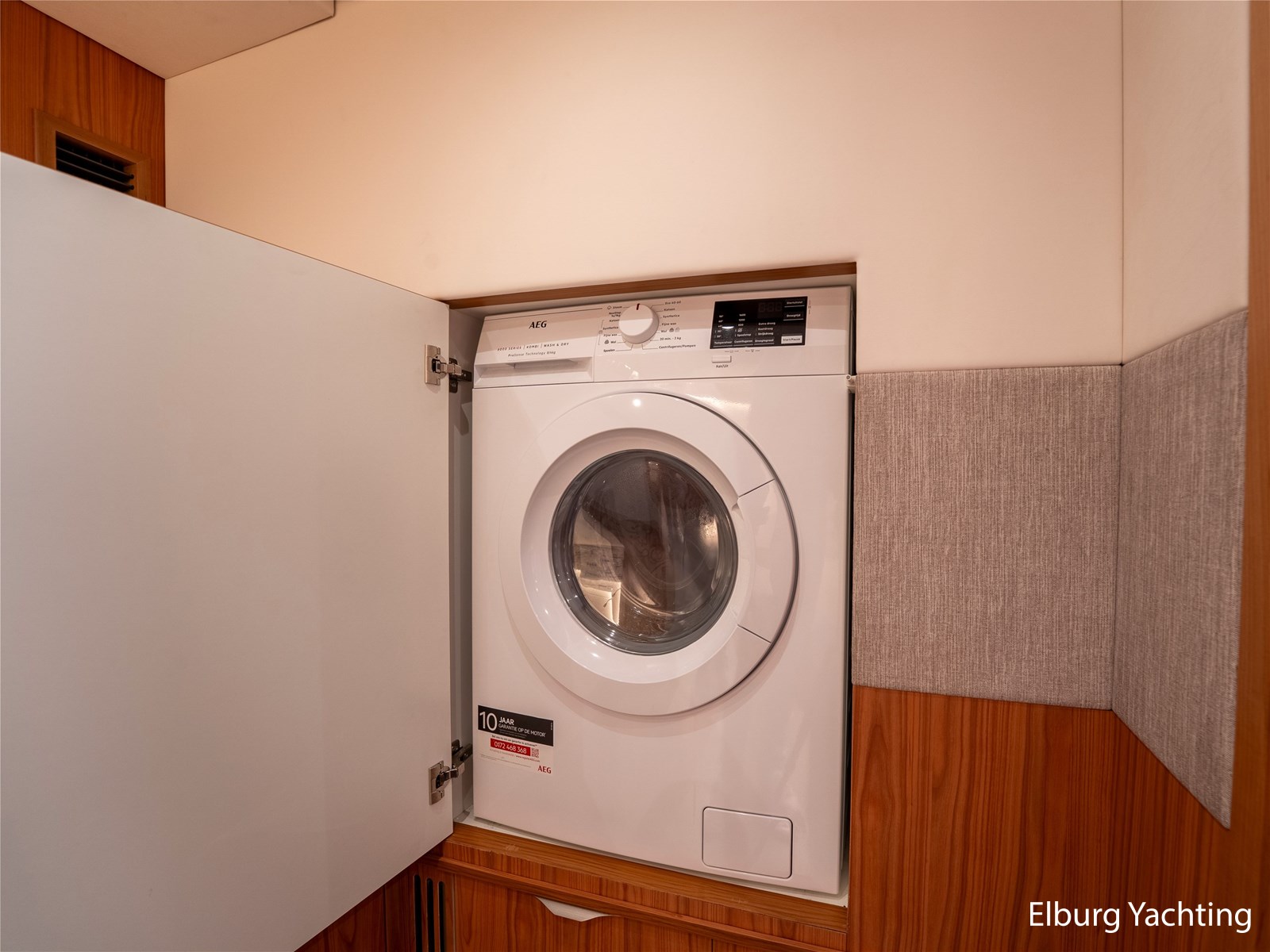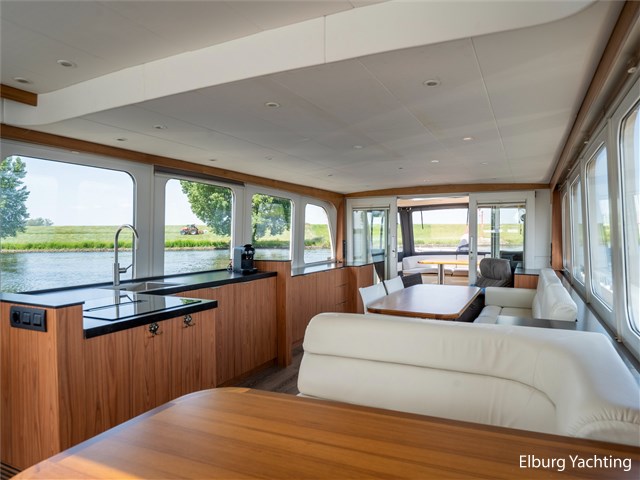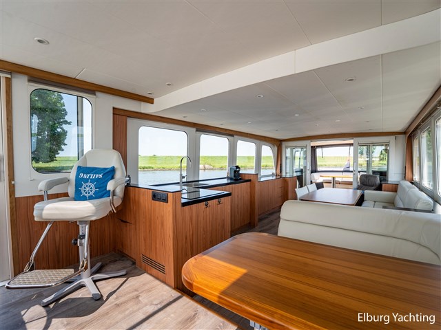 Binnen vind je een strak afgewerkte keuken met een Corian blad, r.v.s. spoelbak, Siemens vaatwasser en een kokendwaterkraan. Er is een AEG was-/droogcombinatie aanwezig. In de salon én de eigenaarshut hangen TVs, en met het Fusion audiosysteem inclusief kuipspeakers geniet je ook buiten van je favoriete muziek.