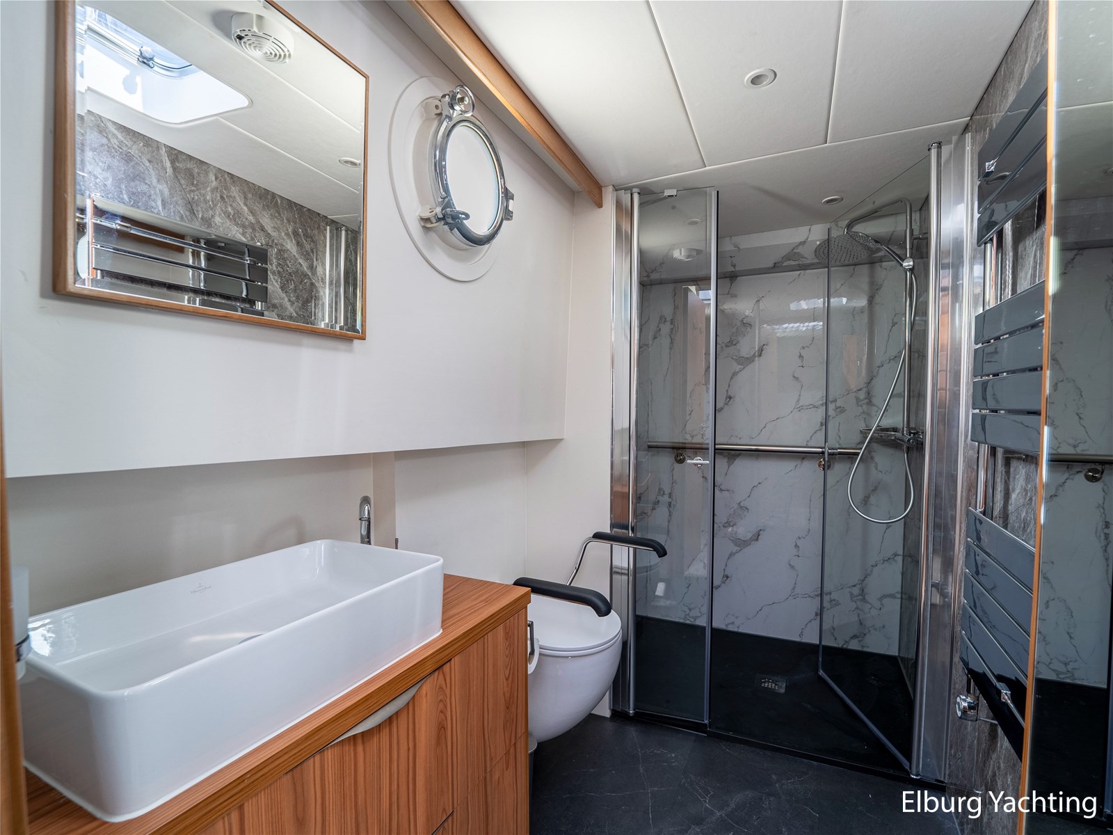 Dit jacht is bovendien zeer energie-efficiënt dankzij zes krachtige SunPower zonnepanelen (totaal 2520 Wp) en een 7000W scheidingstrafo. Ook aan veiligheid en verbinding is gedacht: er is een wifi-antenne en een camerasysteem aan boord. Navigatieverlichting en meerdere zoeklichten zorgen voor zicht en veiligheid, dag en nacht.