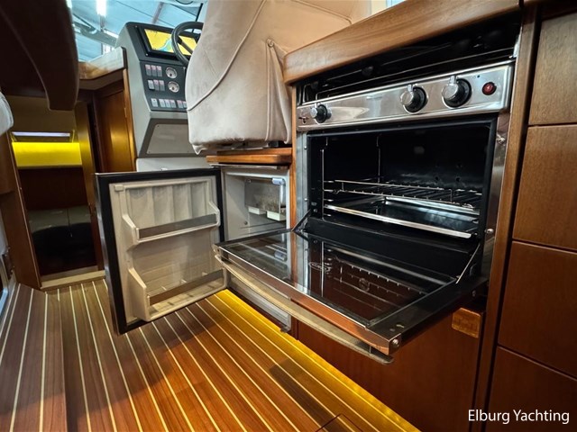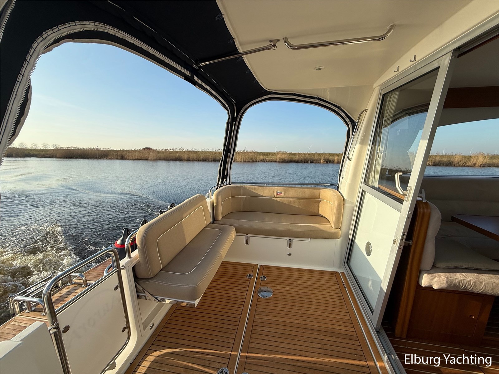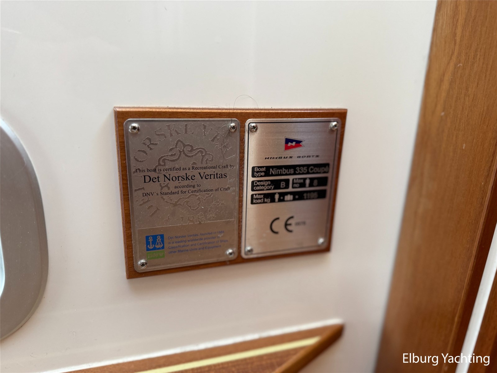 The Nimbus 335 features a spacious and well-maintained cockpit where comfort and functionality come together beautifully. The bench with cushions invites relaxing moments on board, while the deep storage locker offers practical space. Thanks to the fully closable cockpit tent, this outdoor area remains a pleasant place to stay even in less favorable weather. A convenient passage leads to the swim platform. The saloon is accessible via a sliding door and offers, on the starboard side, the galley and helm station. The helm station includes a practical side door to the side deck. To port, there's a comfortable dinette with a height-adjustable table. Forward, opposite the helm, is a foldable co-pilot seat with a retractable TV. The combination of mahogany woodwork and light upholstery creates a warm, stylish Scandinavian atmosphere. In 2025, several items were renewed, including the toilet, radar, inverter, VHF radio, Fusion stereo, and mattresses. The heat exchanger was overhauled. The yacht received new antifouling and a thorough cleaning and polishing in 2025. The engine was serviced in 2025, and the plotter was replaced in 2023. Large hatches in the cockpit floor provide excellent access to the engine compartment, storage space, and technical installations. Average fuel consumption at 5–6 knots was approximately 3 liters per hour.