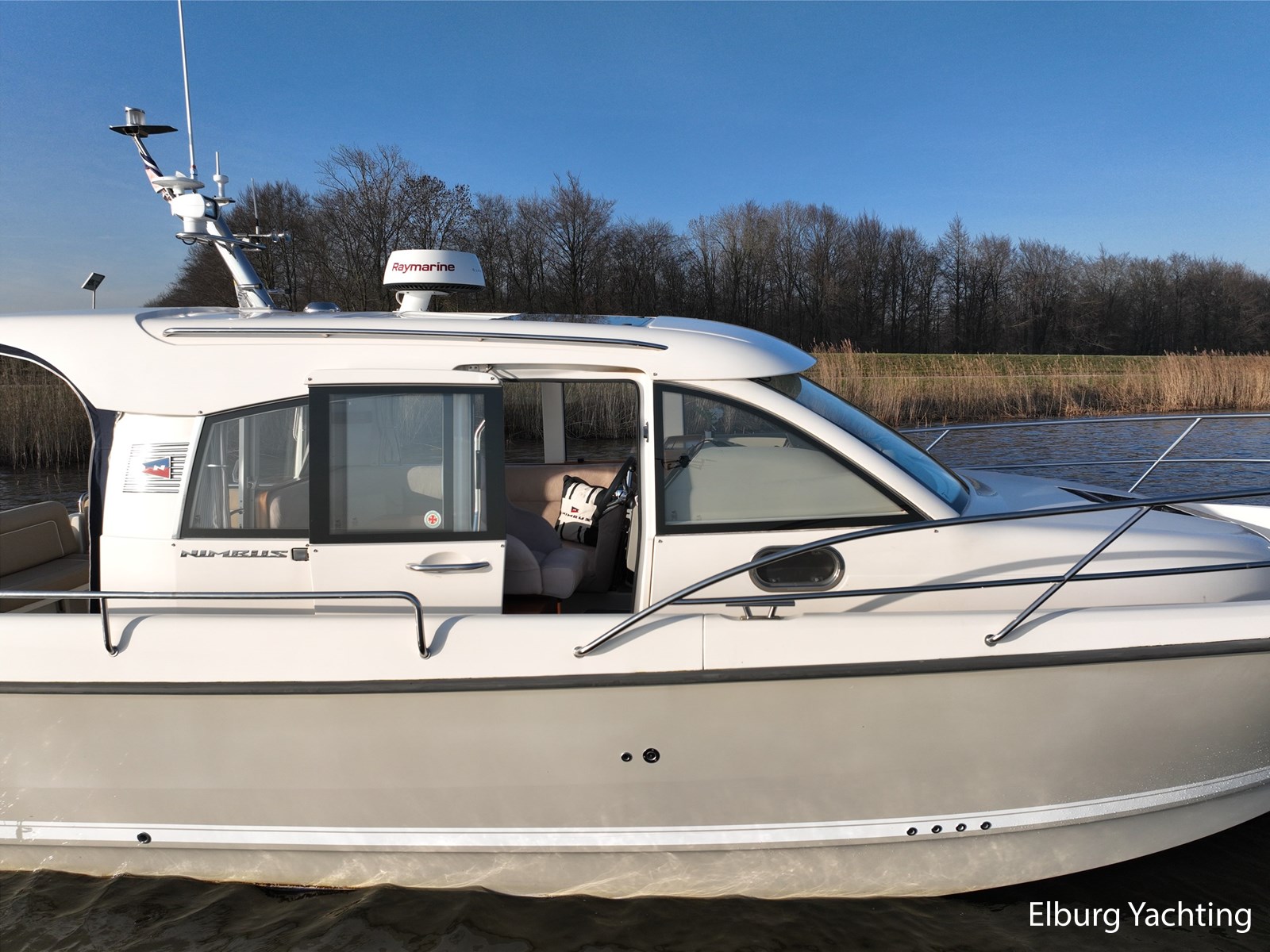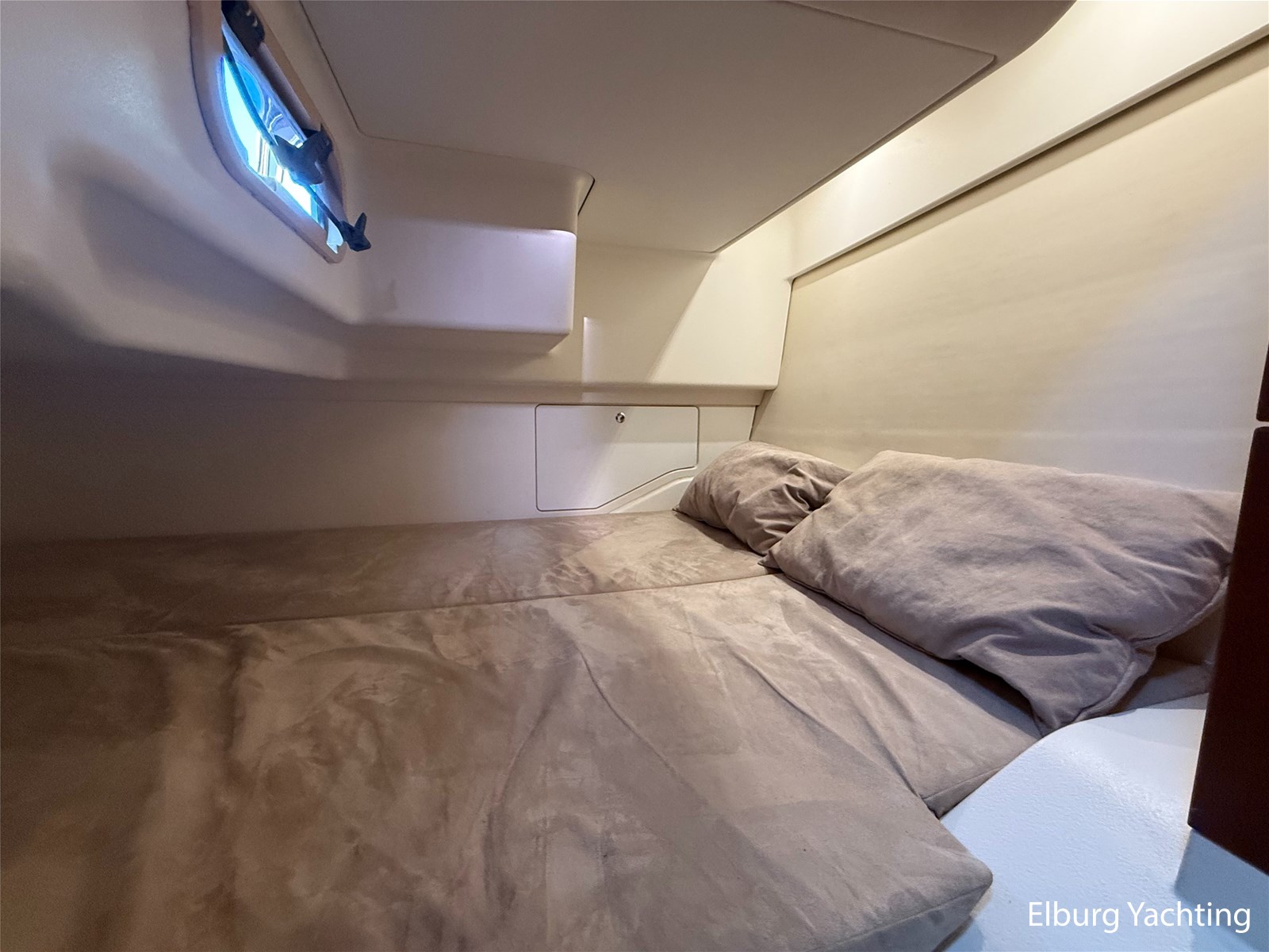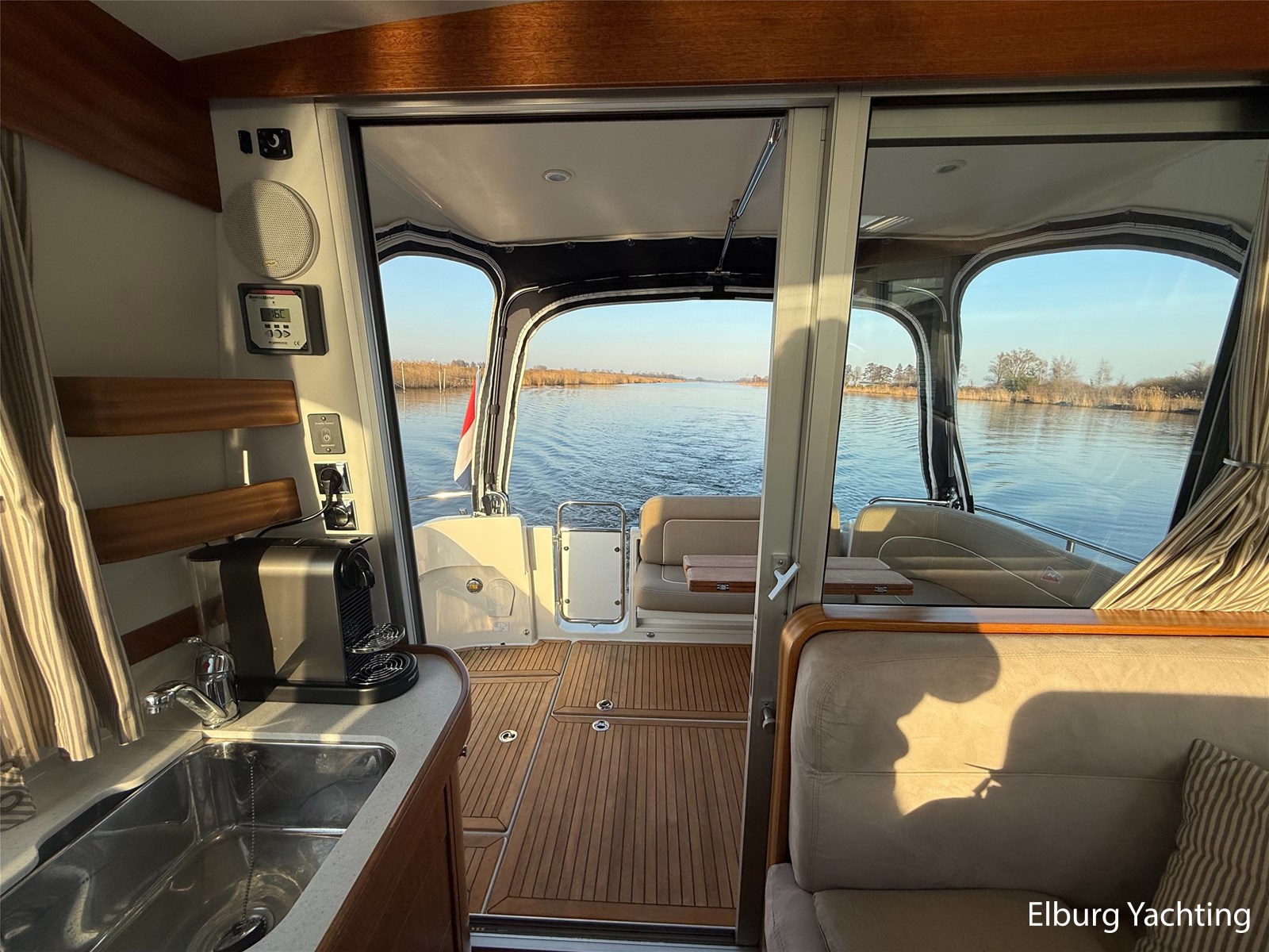 The Nimbus 335 features a spacious and well-maintained cockpit where comfort and functionality come together beautifully. The bench with cushions invites relaxing moments on board, while the deep storage locker offers practical space. Thanks to the fully closable cockpit tent, this outdoor area remains a pleasant place to stay even in less favorable weather. A convenient passage leads to the swim platform. The saloon is accessible via a sliding door and offers, on the starboard side, the galley and helm station. The helm station includes a practical side door to the side deck. To port, there's a comfortable dinette with a height-adjustable table. Forward, opposite the helm, is a foldable co-pilot seat with a retractable TV. The combination of mahogany woodwork and light upholstery creates a warm, stylish Scandinavian atmosphere. In 2025, several items were renewed, including the toilet, radar, inverter, VHF radio, Fusion stereo, and mattresses. The heat exchanger was overhauled. The yacht received new antifouling and a thorough cleaning and polishing in 2025. The engine was serviced in 2025, and the plotter was replaced in 2023. Large hatches in the cockpit floor provide excellent access to the engine compartment, storage space, and technical installations. Average fuel consumption at 5–6 knots was approximately 3 liters per hour.