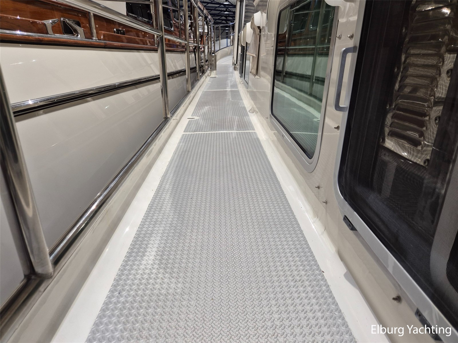 - Alu Antislip materiaal (2012) in gang boorden, teak op achterdek en flexiteak op zwemplateau