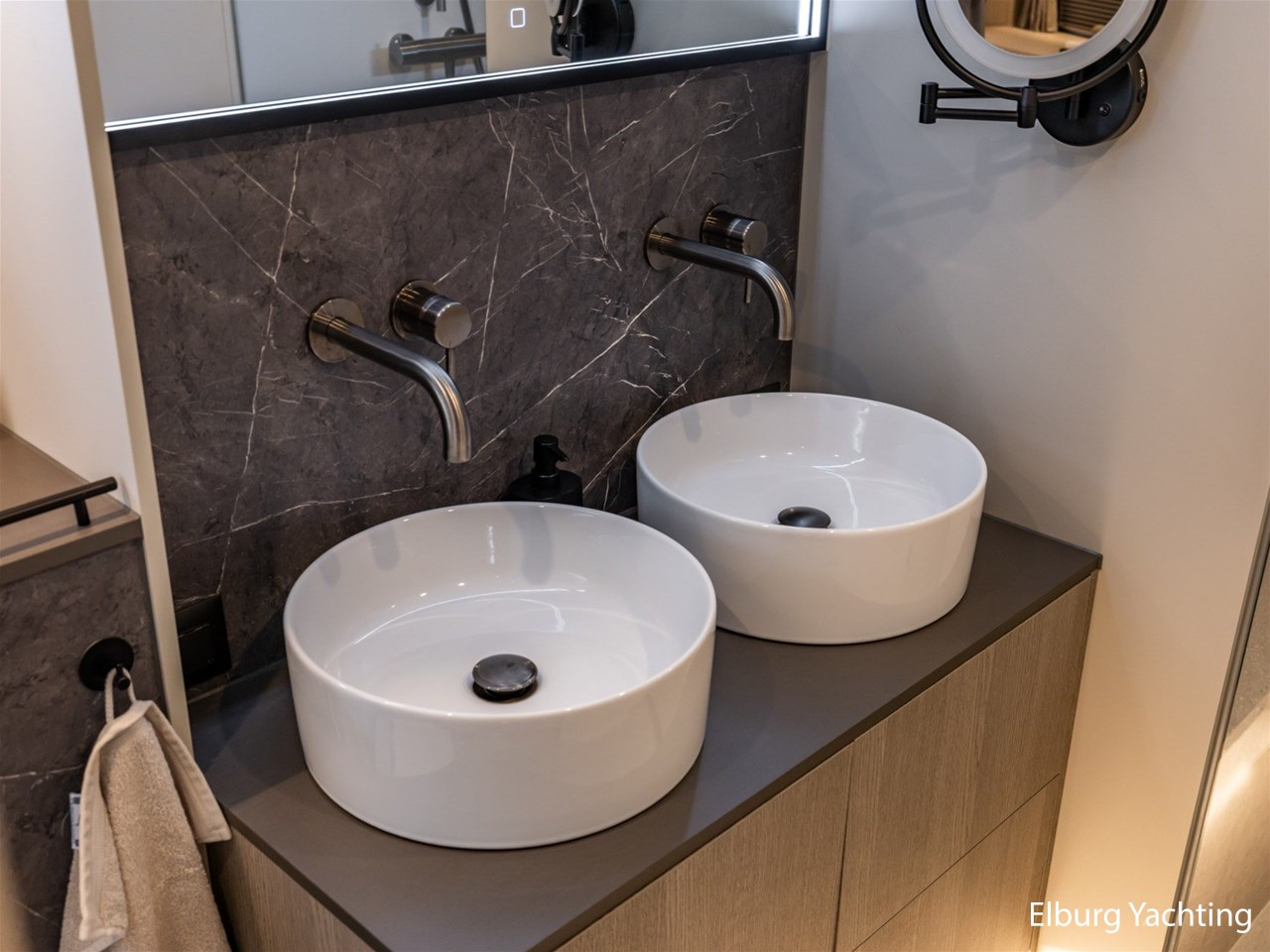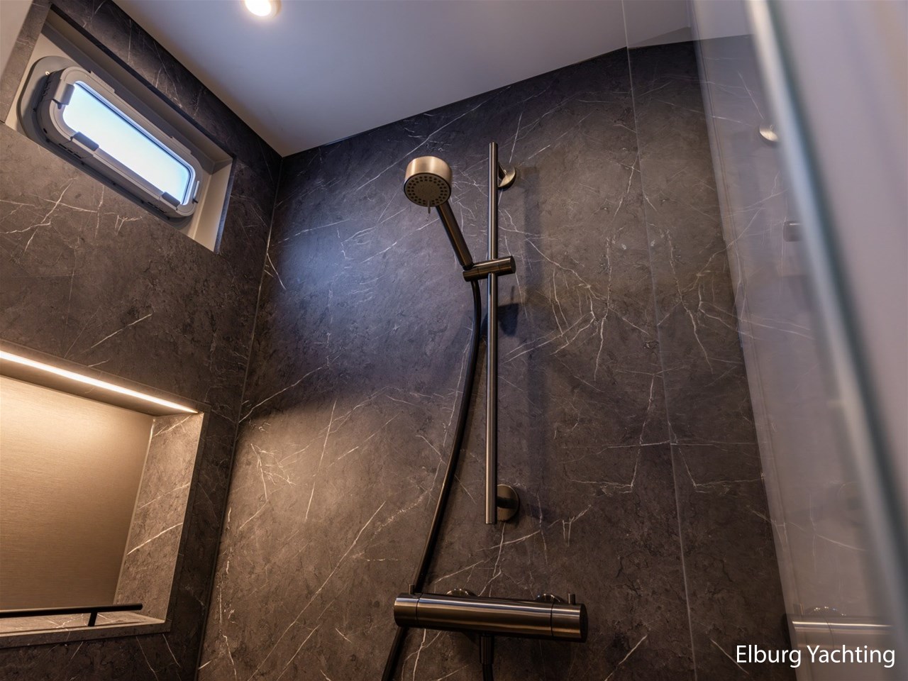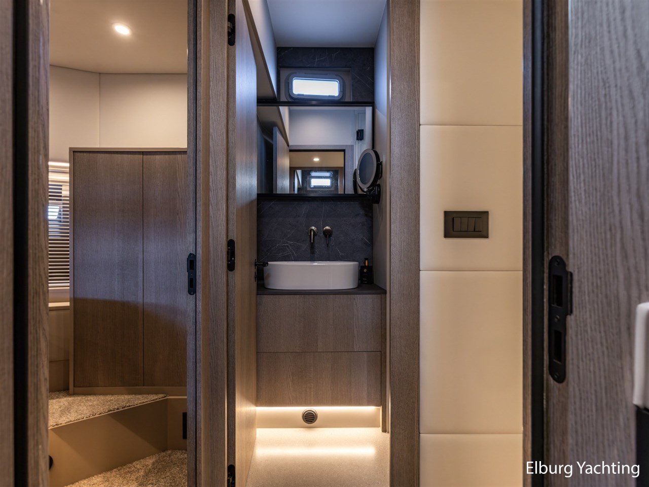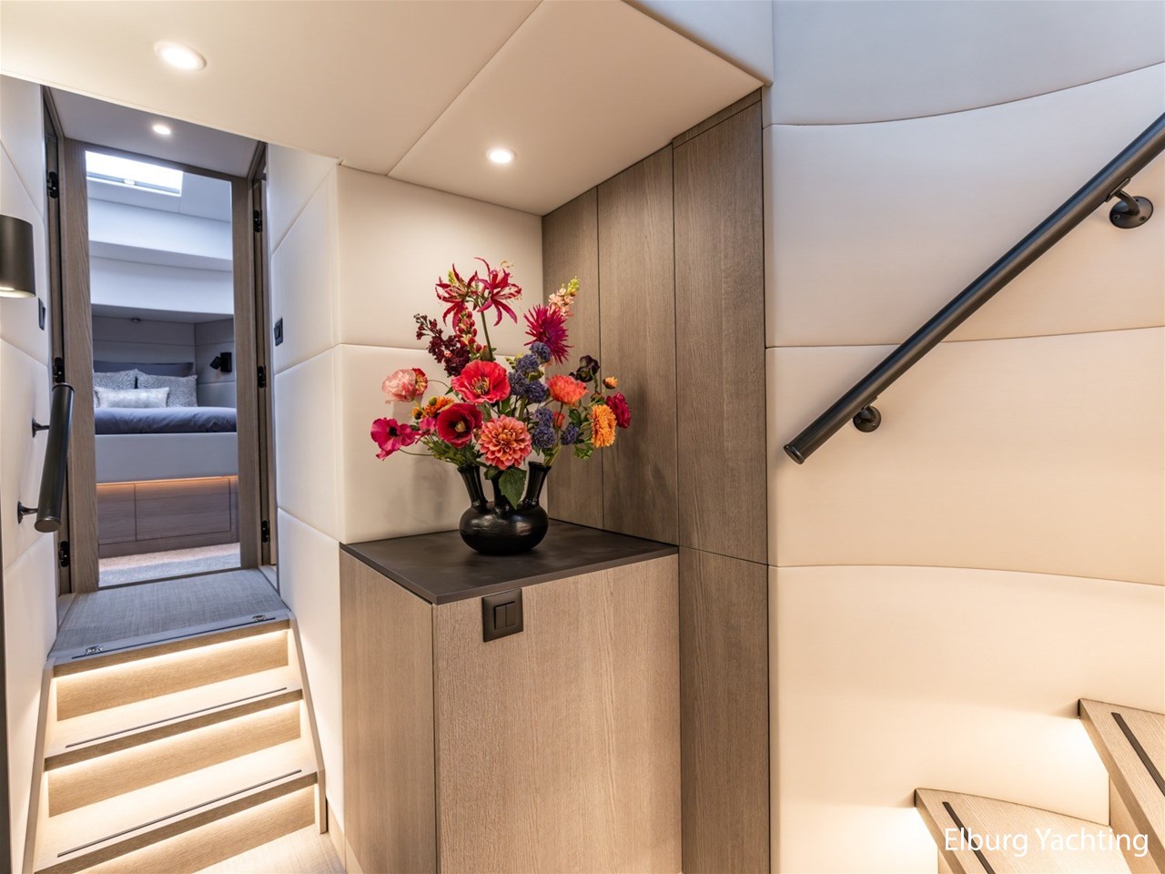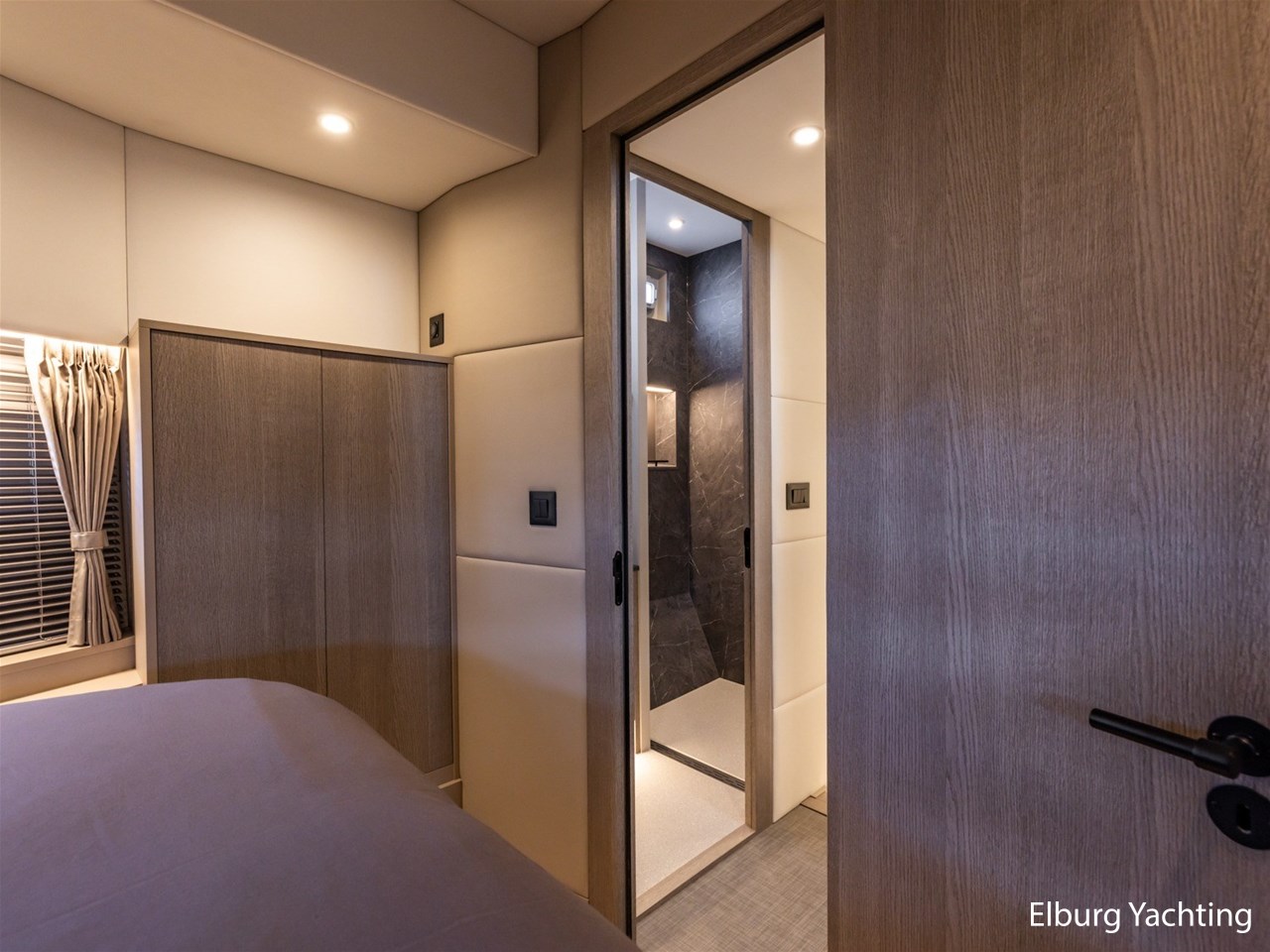 Via een elegante wenteltrap met geïntegreerde verlichting en wandbekleding bereikt u de eigenaarshut met kingsize bed, luxe afwerking en eigen badkamer en-suite. Voorin bevindt zich de gastenhut, voorzien van een eigen badkamer, een apart toilet en een dubbel tegenovergesteld vluchtluik. Beide badkamers en toilet zijn voorzien van Getacore vloeren. Op het voordek bevindt zich een royaal zonnedek met twee verstelbare zonnebedden en twee r.v.s. opbergvakken voor fenders. Daarvoor is een comfortabele zitgelegenheid gecreëerd, waar tevens de mogelijkheid bestaat om buiten te varen. De buitenstuurstand is uitgerust met roerbediening en Volvo Penta EVC-gashendels. Aanvullend is er een Dockmate-afstandsbediening aanwezig, waarmee niet alleen de boeg- en hekschroef maar ook de motoren kunnen worden bediend, ideaal voor comfortabel en nauwkeurig manoeuvreren.