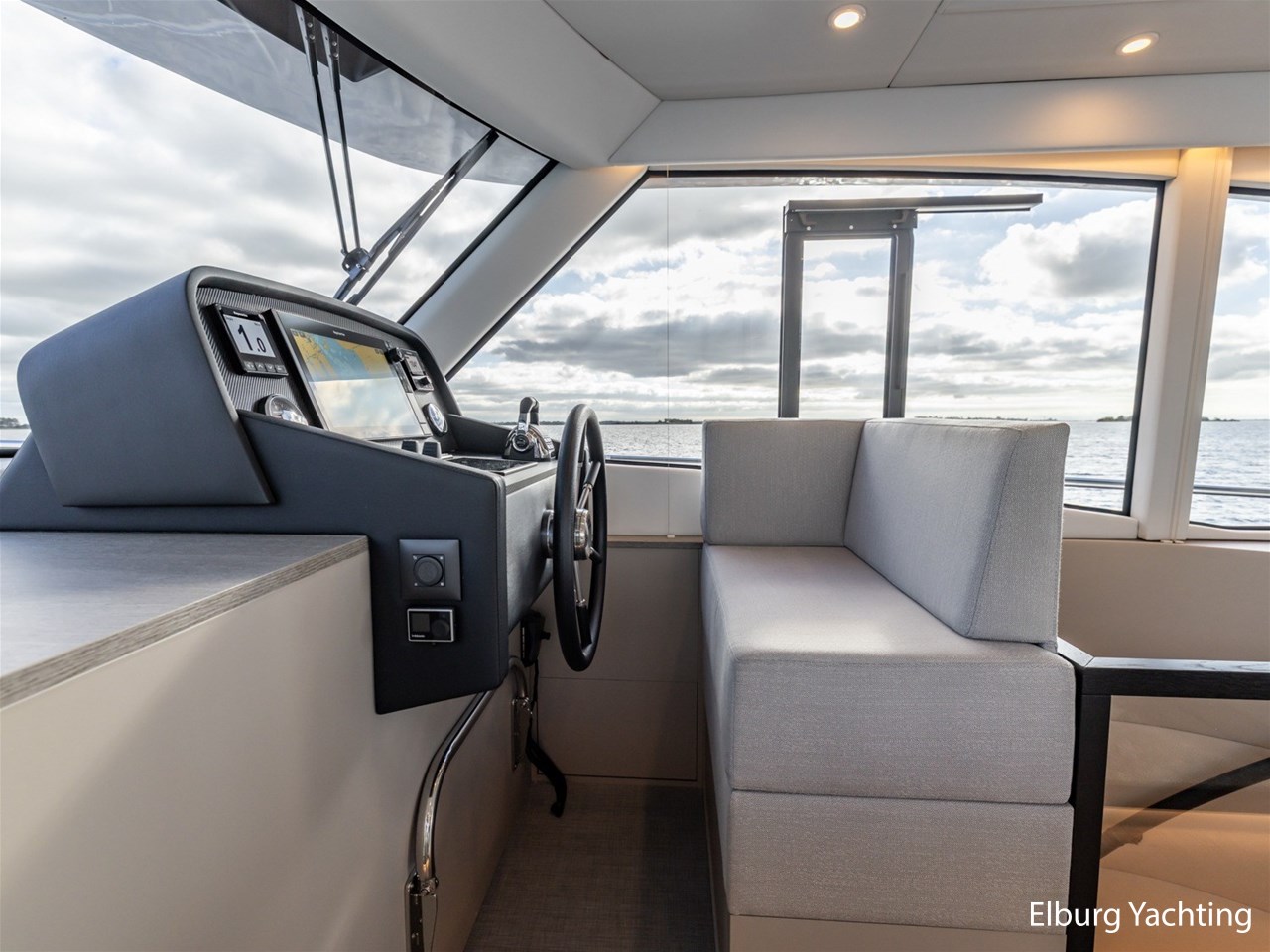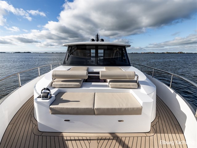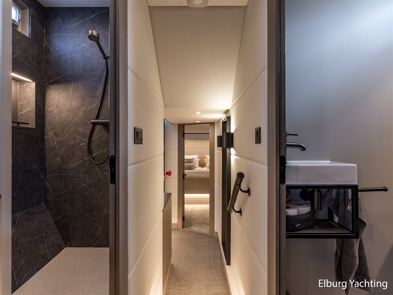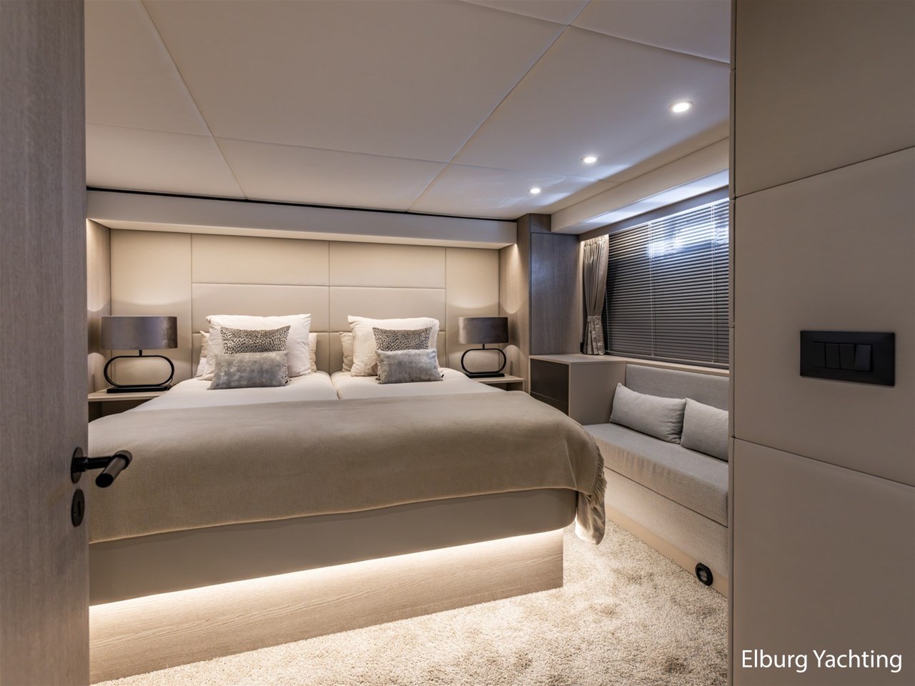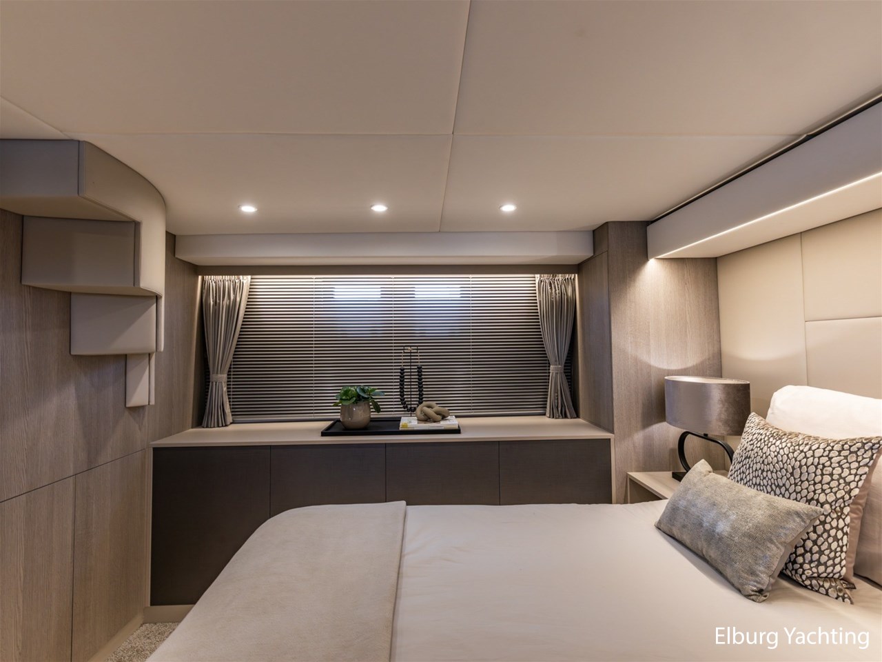 Via een elegante wenteltrap met geïntegreerde verlichting en wandbekleding bereikt u de eigenaarshut met kingsize bed, luxe afwerking en eigen badkamer en-suite. Voorin bevindt zich de gastenhut, voorzien van een eigen badkamer, een apart toilet en een dubbel tegenovergesteld vluchtluik. Beide badkamers en toilet zijn voorzien van Getacore vloeren. Op het voordek bevindt zich een royaal zonnedek met twee verstelbare zonnebedden en twee r.v.s. opbergvakken voor fenders. Daarvoor is een comfortabele zitgelegenheid gecreëerd, waar tevens de mogelijkheid bestaat om buiten te varen. De buitenstuurstand is uitgerust met roerbediening en Volvo Penta EVC-gashendels. Aanvullend is er een Dockmate-afstandsbediening aanwezig, waarmee niet alleen de boeg- en hekschroef maar ook de motoren kunnen worden bediend, ideaal voor comfortabel en nauwkeurig manoeuvreren.