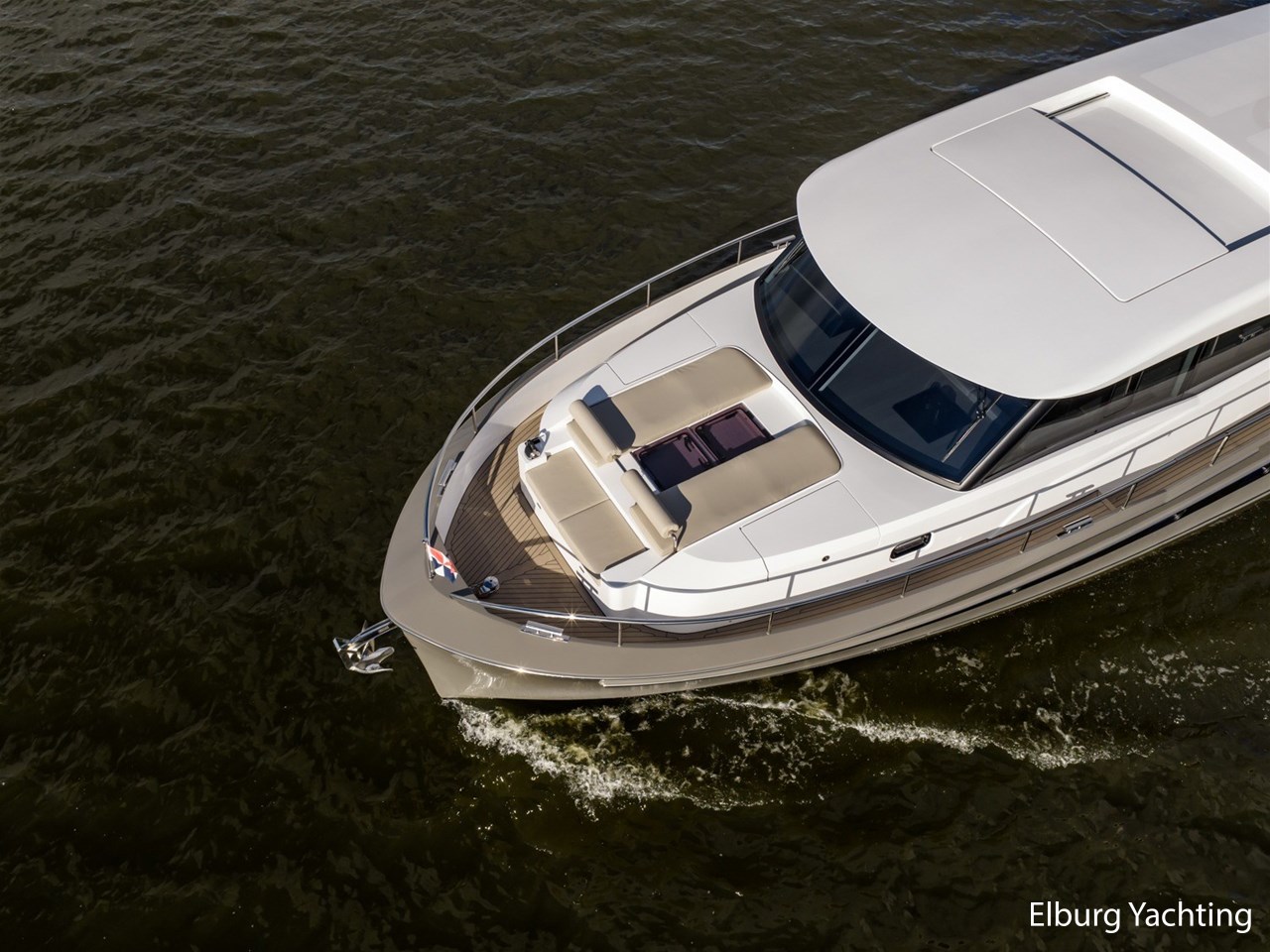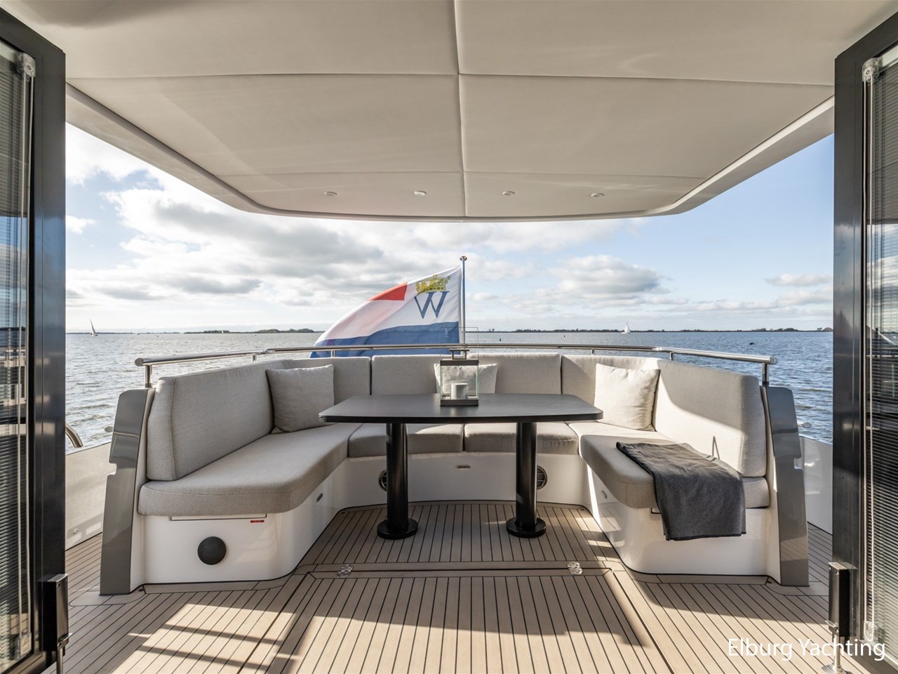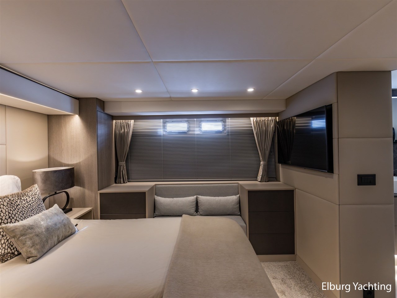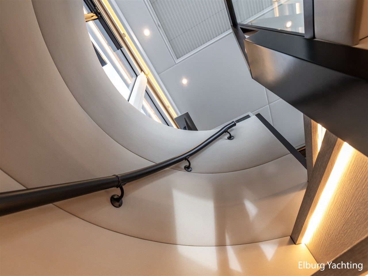 Via een elegante wenteltrap met geïntegreerde verlichting en wandbekleding bereikt u de eigenaarshut met kingsize bed, luxe afwerking en eigen badkamer en-suite. Voorin bevindt zich de gastenhut, voorzien van een eigen badkamer, een apart toilet en een dubbel tegenovergesteld vluchtluik. Beide badkamers en toilet zijn voorzien van Getacore vloeren. Op het voordek bevindt zich een royaal zonnedek met twee verstelbare zonnebedden en twee r.v.s. opbergvakken voor fenders. Daarvoor is een comfortabele zitgelegenheid gecreëerd, waar tevens de mogelijkheid bestaat om buiten te varen. De buitenstuurstand is uitgerust met roerbediening en Volvo Penta EVC-gashendels. Aanvullend is er een Dockmate-afstandsbediening aanwezig, waarmee niet alleen de boeg- en hekschroef maar ook de motoren kunnen worden bediend, ideaal voor comfortabel en nauwkeurig manoeuvreren.