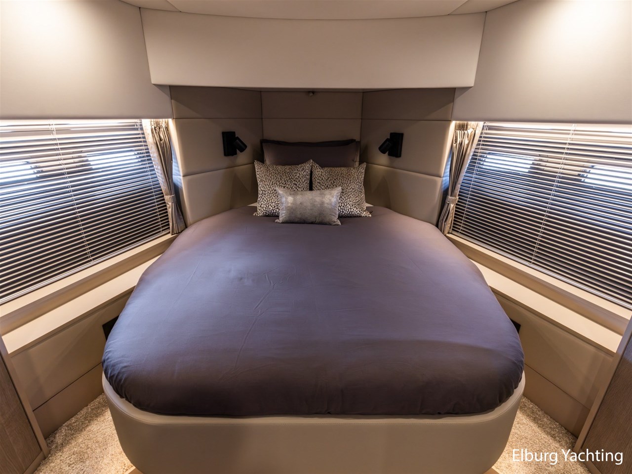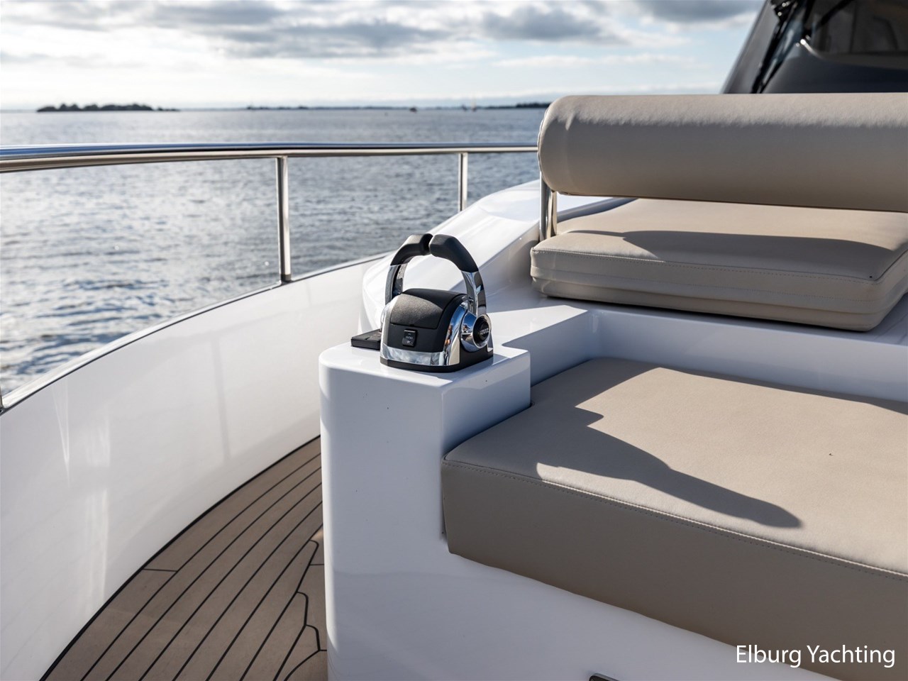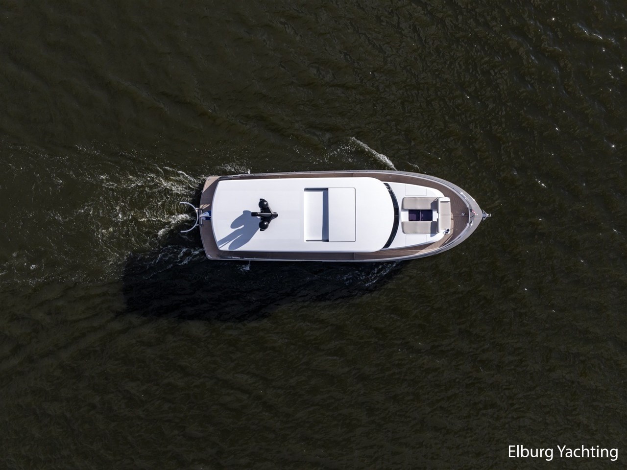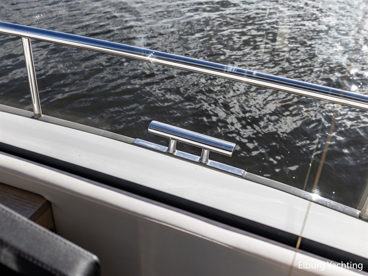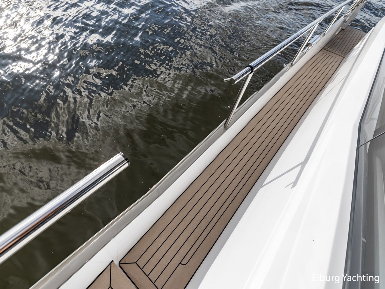 Via een elegante wenteltrap met geïntegreerde verlichting en wandbekleding bereikt u de eigenaarshut met kingsize bed, luxe afwerking en eigen badkamer en-suite. Voorin bevindt zich de gastenhut, voorzien van een eigen badkamer, een apart toilet en een dubbel tegenovergesteld vluchtluik. Beide badkamers en toilet zijn voorzien van Getacore vloeren. Op het voordek bevindt zich een royaal zonnedek met twee verstelbare zonnebedden en twee r.v.s. opbergvakken voor fenders. Daarvoor is een comfortabele zitgelegenheid gecreëerd, waar tevens de mogelijkheid bestaat om buiten te varen. De buitenstuurstand is uitgerust met roerbediening en Volvo Penta EVC-gashendels. Aanvullend is er een Dockmate-afstandsbediening aanwezig, waarmee niet alleen de boeg- en hekschroef maar ook de motoren kunnen worden bediend, ideaal voor comfortabel en nauwkeurig manoeuvreren.