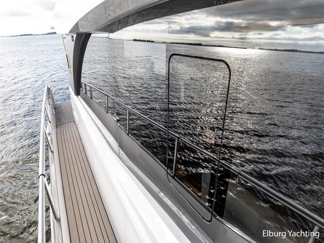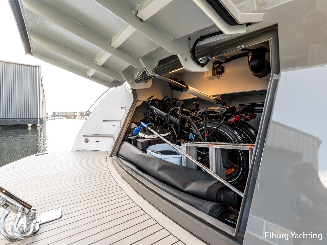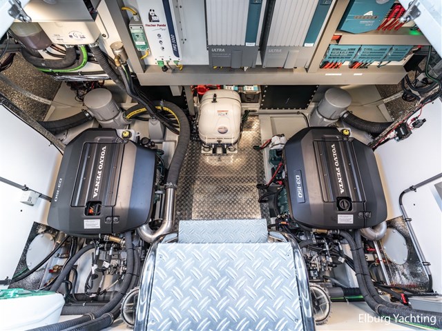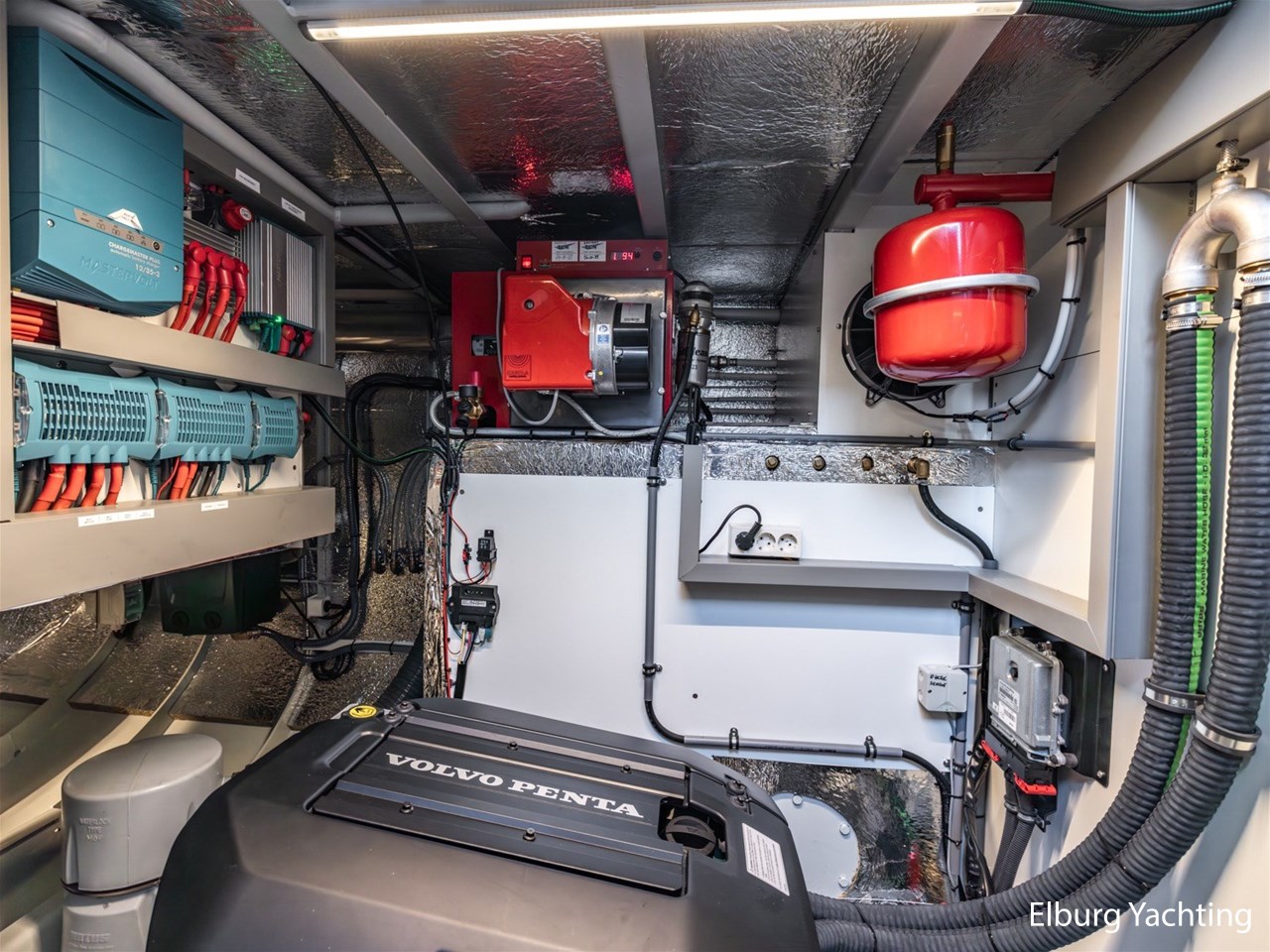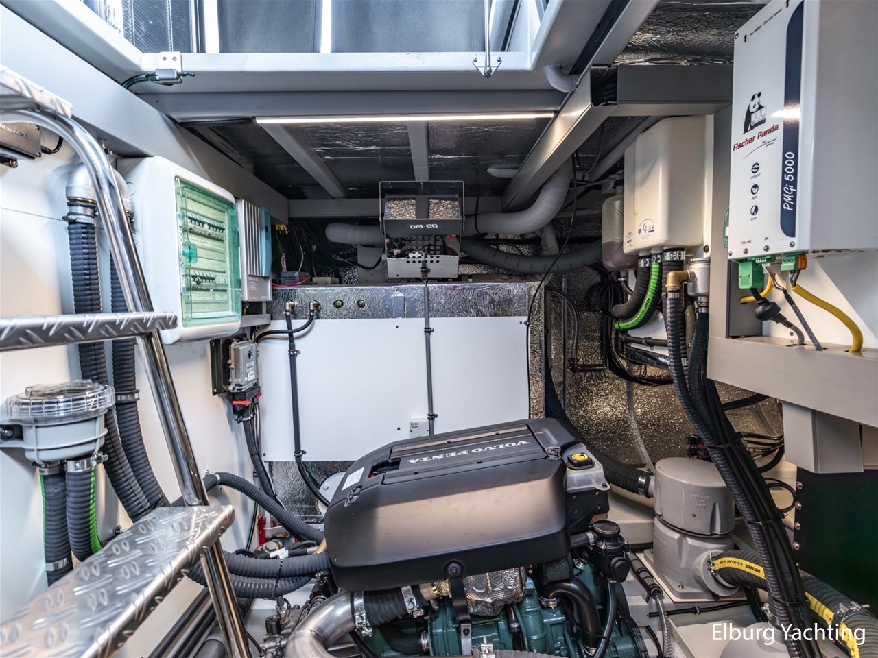 Achterin bevindt zich een ruime garage, hydraulisch te openen via een spiegeldeur, met directe doorgang naar de goed georganiseerde motorkamer. Deze blijft bruikbaar zonder dat de kuip wordt verstoord. De aandrijving komt van twee krachtige Volvo Penta motoren met vaste schroefassen, indirecte koeling, flexibele stuwdragers, watergesmeerde assen en 4-blads schroeven. Voor extra veiligheid is er een FirePro brandblussysteem in de motorkamer. Tot slot is het jacht voorzien van een centraal stofzuigsysteem, een verlengd zwemplateau van ca. 40 cm, gangboord en embleem verlichting, een dekwaspomp, sunscreens voor voorraam, zijkanten en in de kuip in 4 delen, een Miele was-/droogmachine, horizontale jaloezieën in beide hutten, een r.v.s. elektro-hydraulisch klapbare mast en veel gepolijste r.v.s. railingdelen en bolders. De doorvaarthoogte met gestreken mast bedraagt circa 4,05 meter. Motoronderhoud en Kabola-service zijn recent uitgevoerd in 2025.