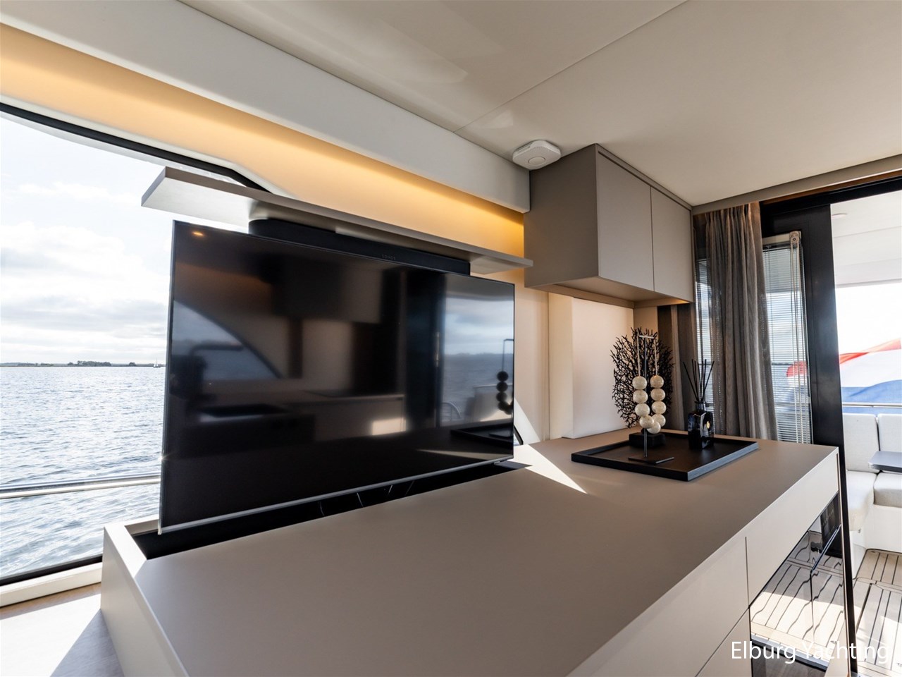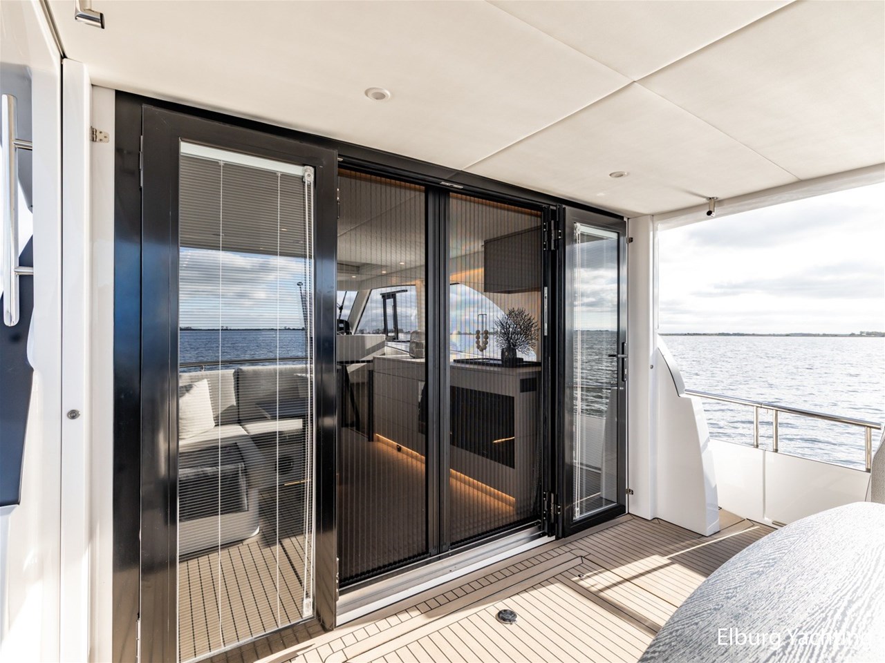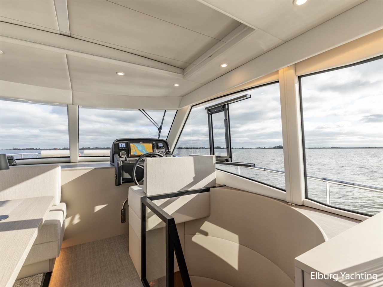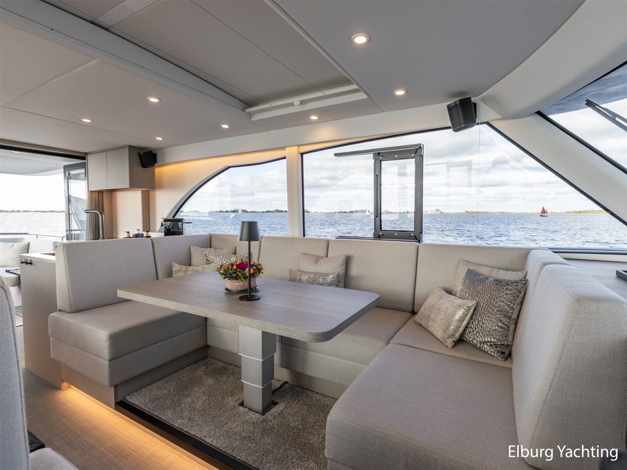 Als u aan boord stapt, komt u in de royale open kuip, overkapt met een verlengd stalen dak en uitgerust met een hoogwaardige kuiptent, voorzien van geïntegreerde berging (CanopEasy). Vanuit de kuip loopt u gelijkvloers naar binnen via vier openslaande deuren, voorzien van een geïntegreerde plisséhordeur. Aan boord geniet u van vloerverwarming en hete lucht verwarming, twee te openen zijramen en een groot elektrisch schuifdak. De gehele vloer is afgewerkt met een stijlvolle Bolon kunststofvloer. De salon is licht en ruim opgezet, met sfeerverlichting, veel kastruimte, een wijnkoeler, vaatwasser, koelkast, Sonos muzieksysteem, Samsung TV op een lift en een stijlvolle dinette met elektrisch verstelbare tafel die tevens als extra slaapplaats kan dienen. De hoge afwerkingskwaliteit wordt doorgetrokken in details zoals het Getacore werkblad met verzonken keramische kookplaat en de plissé gordijnen in de salon.