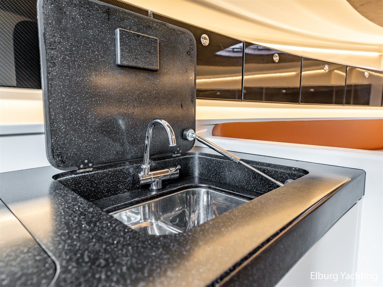- Wit gelakt met alcantara plafond bekleding en kunstteak vloeren