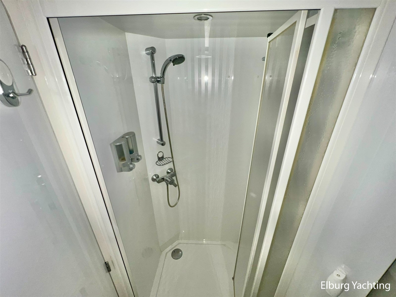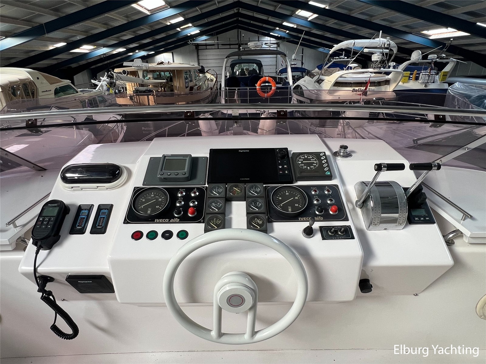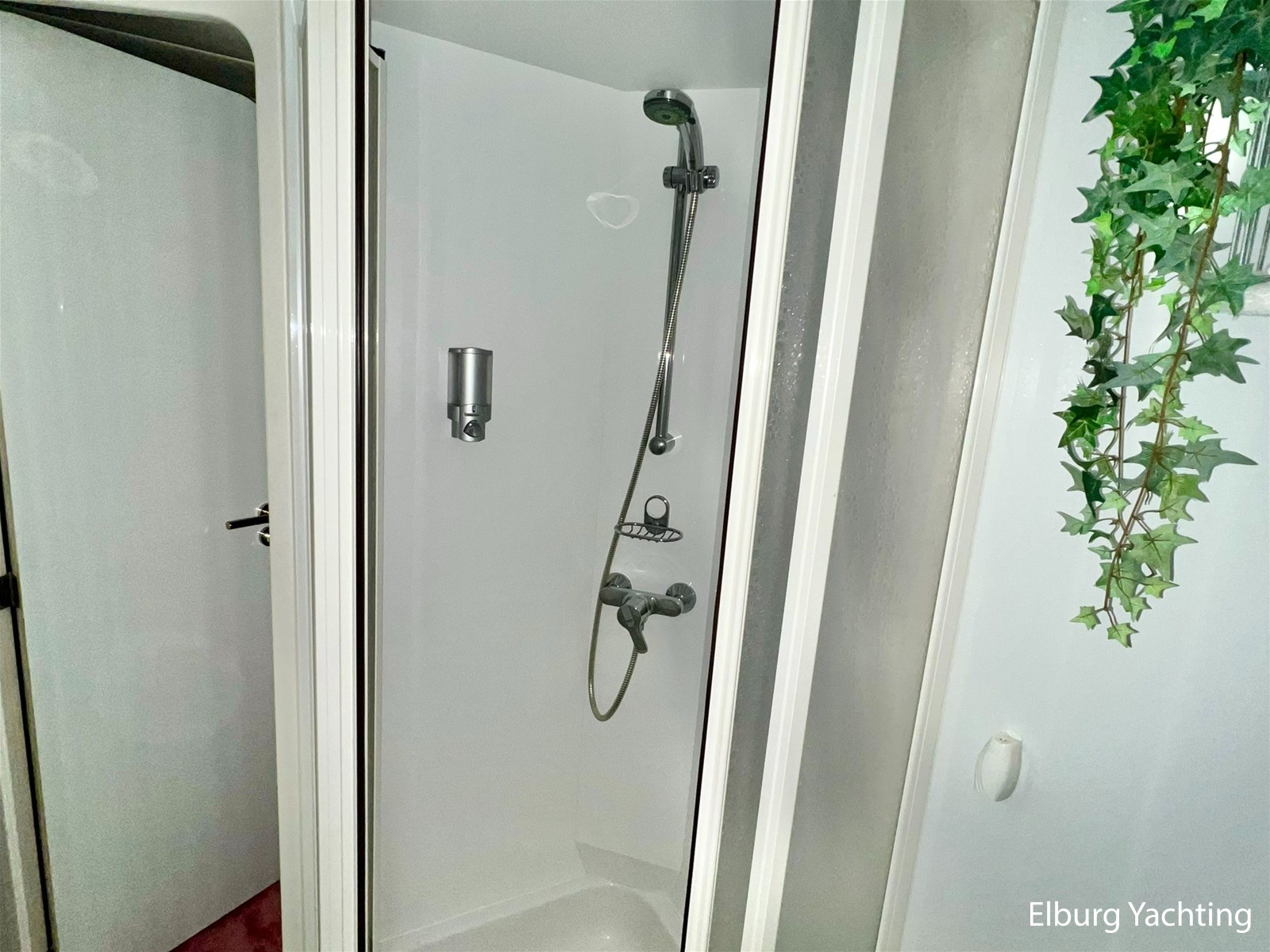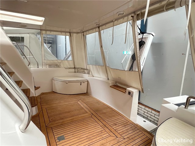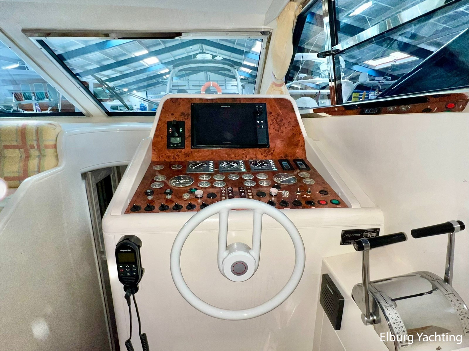 This spacious and sporty Neptunus 156 is in good condition for its age and is being sold by its first owner. The yacht features three cabins for at least six passengers and has two separate bathrooms. The open cockpit and saloon are connected on the same level. A full canopy covers the open cockpit with large viewing windows. An integrated staircase in the cockpit provides access to the spacious flybridge with a U-shaped seating area. The helm station has a two-person pilot seat and offers a well-organized dashboard with all the necessary equipment, including a new Raymarine Axiom plotter. The saloon can be accessed through a stainless steel sliding door. A spacious L-shaped bench and two integrated chairs offers excellent seating comfort. There is ample storage space in the benches and cabinets. The dinette is located opposite the helm station, allowing the entire crew to watch the sailing at a comfortable level. Below deck is the galley with a refrigerator/freezer/microwave/dishwasher/stovetop and sink. On the starboard side, there are two single guest cabins, and on the port side, a double cabin with a French bed. The guest bathroom is located amidships and is freely accessible. Forward is the owner's cabin with a double bed and en-suite bathroom. Ample storage is located under the forward cabin bed. The aft section is accessed through a wide hatch in the cockpit floor. The aft section contains storage space, a washer and dryer, the generator, and other technical equipment. The engine room is accessible from the aft section. The port engine was replaced in the winter of 2023-2024; invoices for this work are available. This Neptunus 156 is also equipped with: removable cushions for the aft deck, flybridge and foredeck, a bimini top over the flybridge, flybridge sections with covers, stainless steel fender holders, lockable cockpit with a door to the bathing platform, exterior lighting, four sliding windows in the saloon for ventilation and two mosquito screens, mosquito screens for the portholes, a removable sunshade on the windshield, and a side ladder. Interior headroom is approximately 2 meter.
