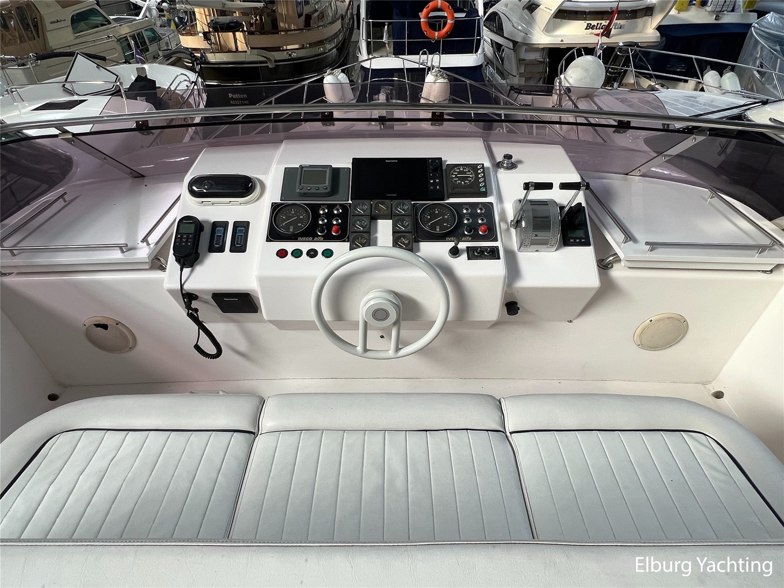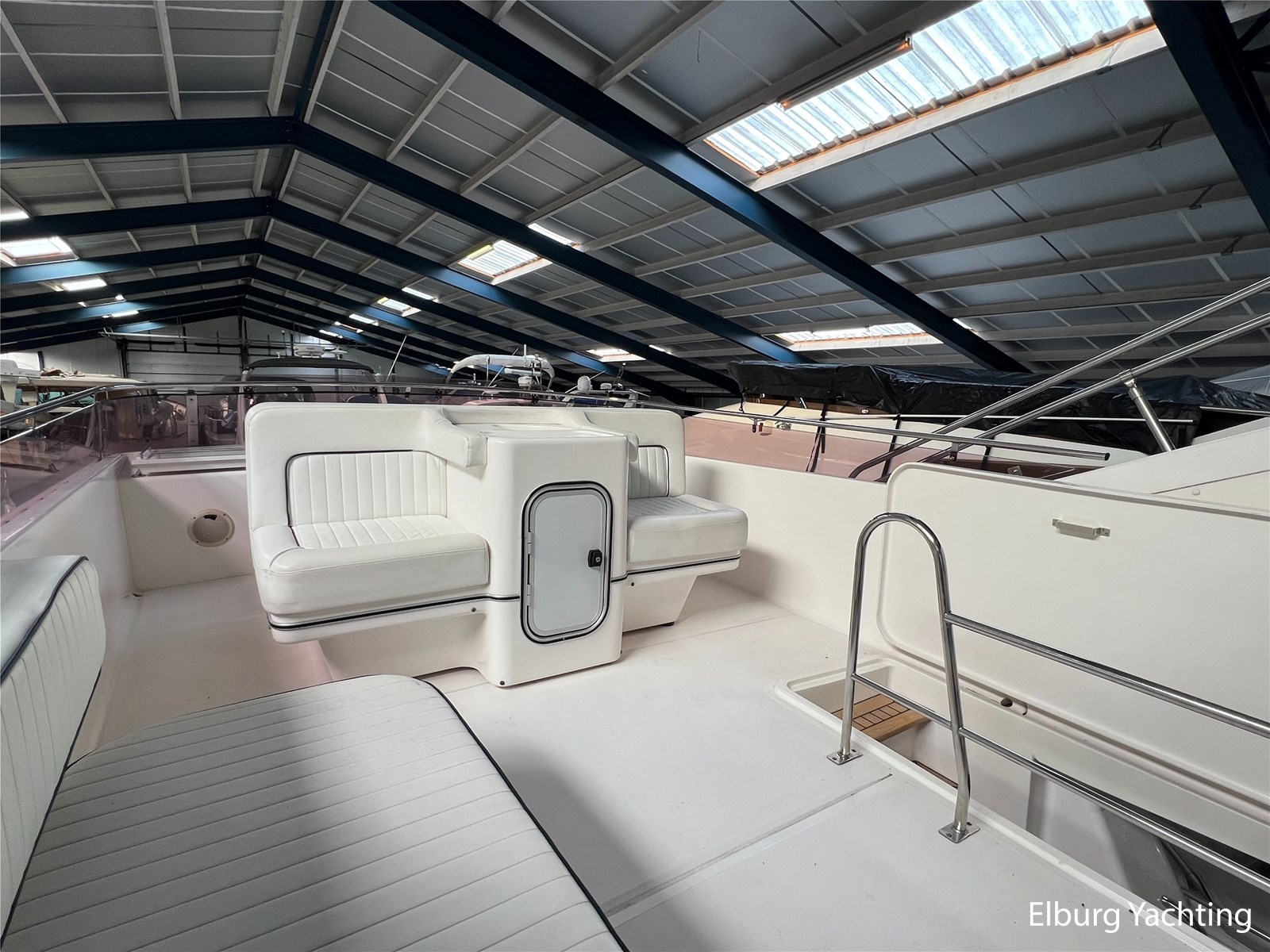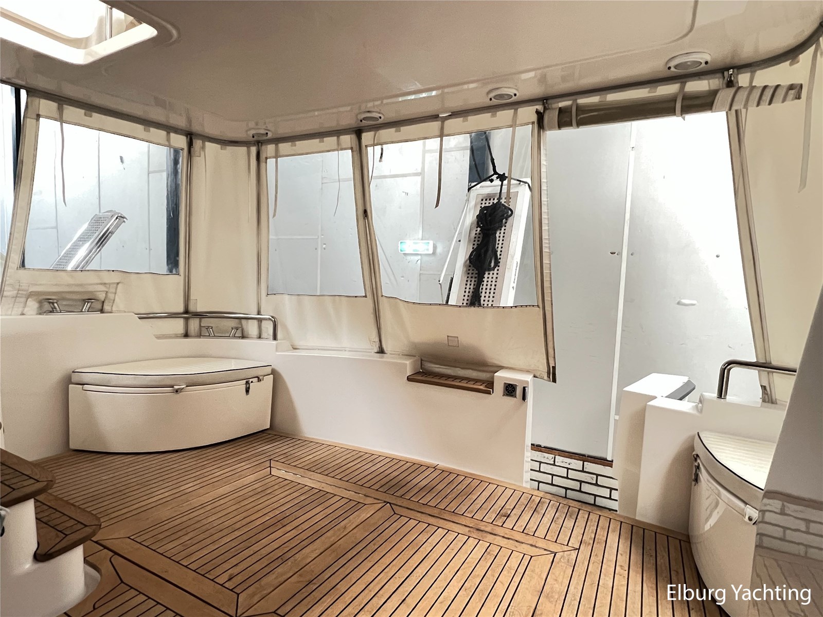 This spacious and sporty Neptunus 156 is in good condition for its age and is being sold by its first owner. The yacht features three cabins for at least six passengers and has two separate bathrooms. The open cockpit and saloon are connected on the same level. A full canopy covers the open cockpit with large viewing windows. An integrated staircase in the cockpit provides access to the spacious flybridge with a U-shaped seating area. The helm station has a two-person pilot seat and offers a well-organized dashboard with all the necessary equipment, including a new Raymarine Axiom plotter. The saloon can be accessed through a stainless steel sliding door. A spacious L-shaped bench and two integrated chairs offers excellent seating comfort. There is ample storage space in the benches and cabinets. The dinette is located opposite the helm station, allowing the entire crew to watch the sailing at a comfortable level. Below deck is the galley with a refrigerator/freezer/microwave/dishwasher/stovetop and sink. On the starboard side, there are two single guest cabins, and on the port side, a double cabin with a French bed. The guest bathroom is located amidships and is freely accessible. Forward is the owner's cabin with a double bed and en-suite bathroom. Ample storage is located under the forward cabin bed. The aft section is accessed through a wide hatch in the cockpit floor. The aft section contains storage space, a washer and dryer, the generator, and other technical equipment. The engine room is accessible from the aft section. The port engine was replaced in the winter of 2023-2024; invoices for this work are available. This Neptunus 156 is also equipped with: removable cushions for the aft deck, flybridge and foredeck, a bimini top over the flybridge, flybridge sections with covers, stainless steel fender holders, lockable cockpit with a door to the bathing platform, exterior lighting, four sliding windows in the saloon for ventilation and two mosquito screens, mosquito screens for the portholes, a removable sunshade on the windshield, and a side ladder. Interior headroom is approximately 2 meter.