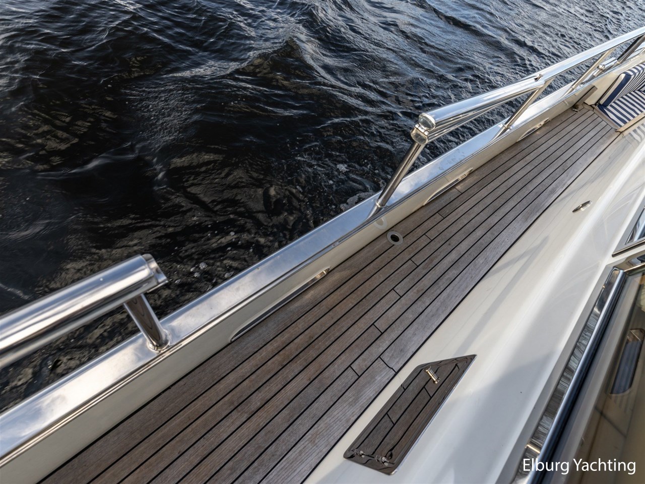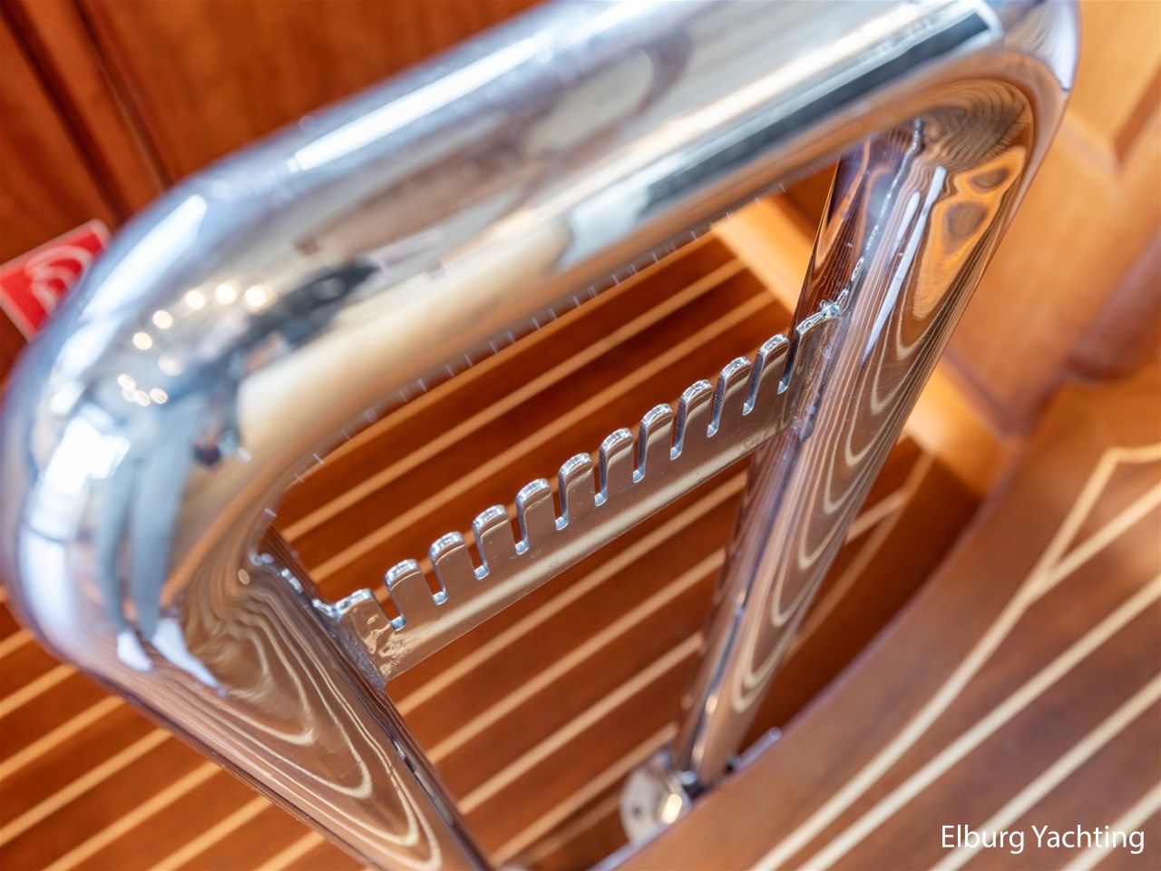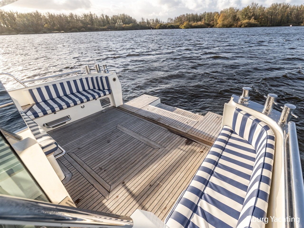 Het jacht beschikt over een hydraulisch uitklapbaar zwemplateau, waardoor deze wordt verlengt en de open kuip nog meer ruimte geeft, ze heeft daarnaast ook een luxe geïntegreerde zitbank op voordek, 4 x RVS sorades voor goede ventilatie in de boot, hydraulisch klapbare mast, 2 x zijdeur (ingang) + 1 x achteringang, luxe stuurstoel, meevaar-dinette naast stuurstand, RVS reling + RVS 'berghout rondom, 3 x dakluik, alle patrijspoorten kunnen open, Alcantrara plafonds, camerasysteem, veel bergruimte buiten, SB +BB elektrische kaapstander, buitenentree machinekamer, ook CV in machinekamer + opbergluik, groot opbergluik in open kuip.