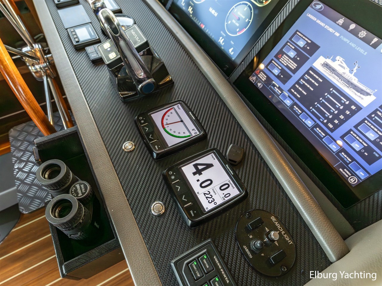 Deze Linssen Grand Stury 590 Variotop is uitgevoerd met: 2 x Spudpalen tot maximaal 4.20m onder het schip, Opacmare hydraulische kraan om bijboot te liften, Xenta dynamic positioning voor het behoud van zijn positie tijdens het stil liggen/wachten op het water, trolling valves, MagnusMaster stabilisatiesysteem, muggenhorren rondom, stahoogte door gehele boot ca. 2.00 m een extra kinderbed in 3e hut, 2 x TV met elektrische lift en DVB-T en DVB-S ontvanger, Raymarine STV60 satellietsysteem, Fusion audio installatie met afstandsbediening en buitenspeakers ook te bedienen via Raymarine plotter, AEG was-droog combinatie, Siemens vaatwasser, indirecte verlichting op achterdek, dubbele Alpha pro 24/75A dynamo's. Het Canbus elektra systeem is te bedienen via de Yachtcontrol bedieningsschermen in de salon / kombuis / stuurhuis en tevens via een app op de tablet of smartphone, dimverlichting door het gehele jacht, Xenta motorbediening met toerental synchronisatie, Xenta joystick bediening voor eenvoudig afmeren (bedient beide motoren, roeren en boeg- en hekschroef), op iedere motor dubbele omschakelbare brandstoffilters, elektrische kogelkranen voor koelwater, Raymarine i70 windmeter met Airmar 150 WX weerstation, Raymarine roerstandaanwijzer, Raymarine AIS, 5x camera's rondom de boot met afstandsbediening, zoeklicht, WIFI antenne met router, elektrisch verstelbare tafel op achterdek, zijtrap om makkelijk aan/van boord te gaan bij zijsteigers, boegdoorgang in reling, wegklapbare fenderkorven voor en achter, elektrische verhaallieren op achterdek met voetbediening. De minimale doorvaarthoogte is 4,70m.