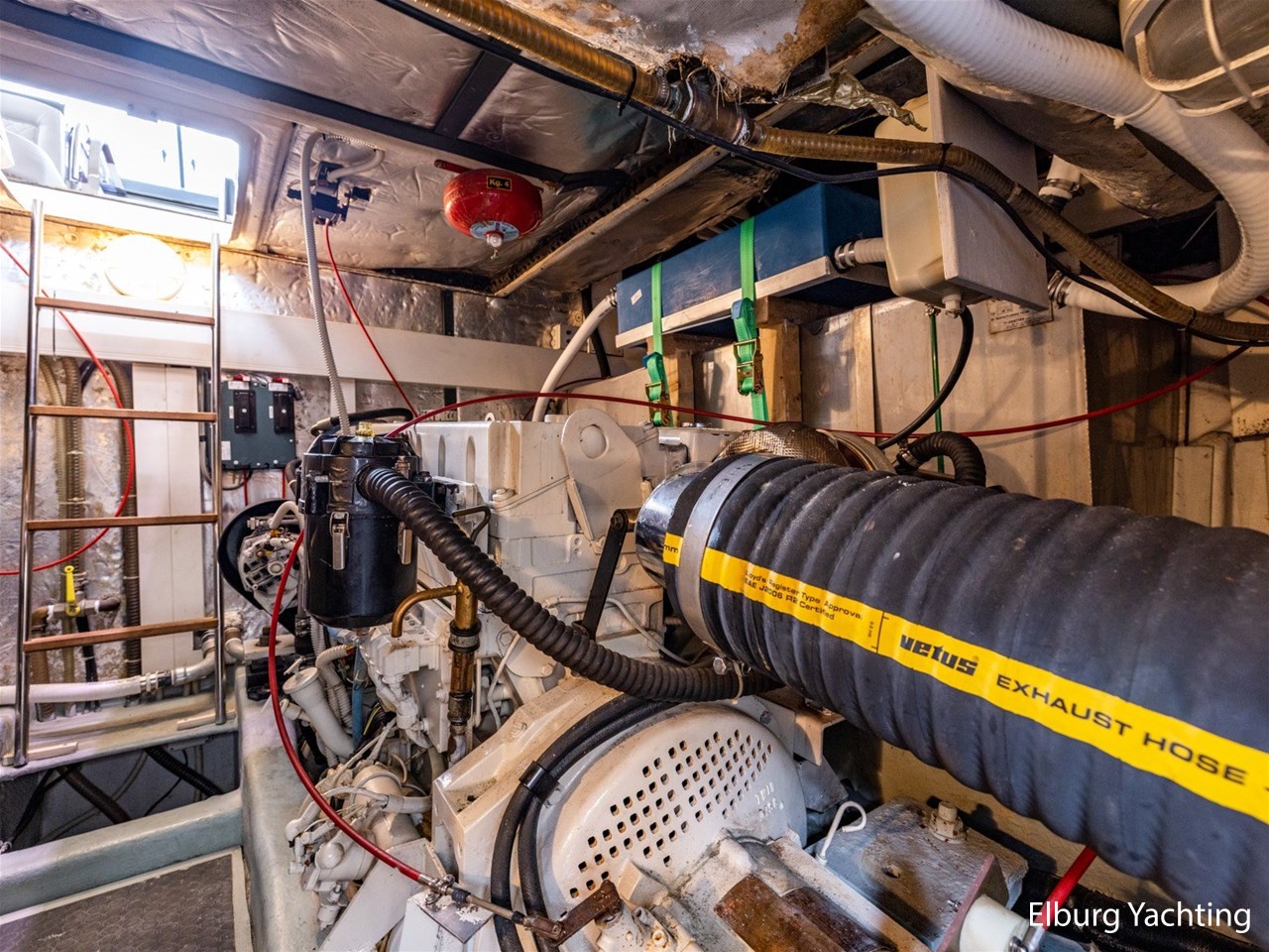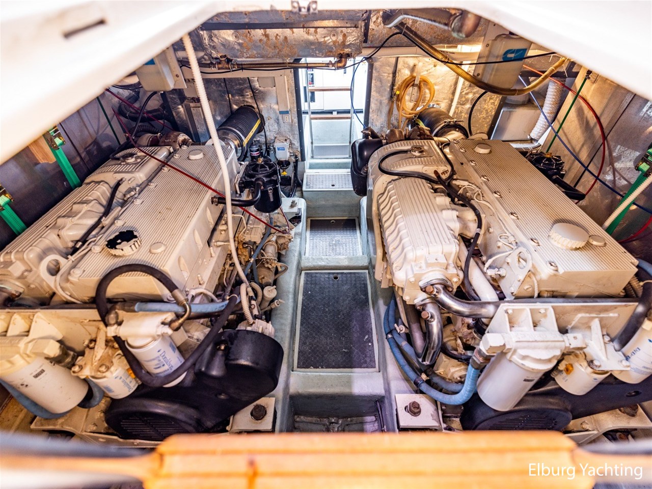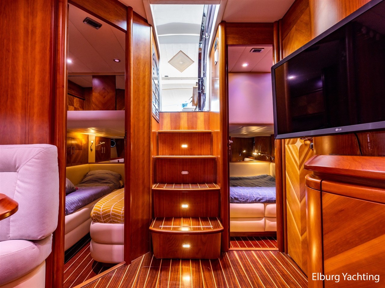 The Cayman 52 Hardtop is a truly sporty all-rounder. The wheelhouse can be fully enclosed with a canopy or insect screen. The helm station, wet bar with sink, grill and fridge, and the spacious U-shaped seating area are all located on a single level. The large electric sliding roof brings the outdoor feeling inside. The open cockpit is generously laid out with a fixed bench and matching cushions. A cockpit hatch provides access to the technical area with additional storage space. Below deck, there are no fewer than three cabins offering up to six berths, along with two separate toilet and shower compartments. This Cayman 52 is equipped with features including: a hydraulically operated gangway on the aft deck, dinghy bracket and launching system, bimini top over the aft deck, cockpit lighting, stainless steel fender holders, two storage hatches in the foredeck, a large sunbed on the bow, high stainless steel guard rails all around, high-quality Italian wood interior, easily accessible technical systems, tanks with inspection hatches, trim tabs, Philips HUE interior lighting, and a trawling mode (low-speed control at idle). Furthermore, a stern thruster was recently installed, and the bilge pump, cover (2024), and service batteries have been renewed.