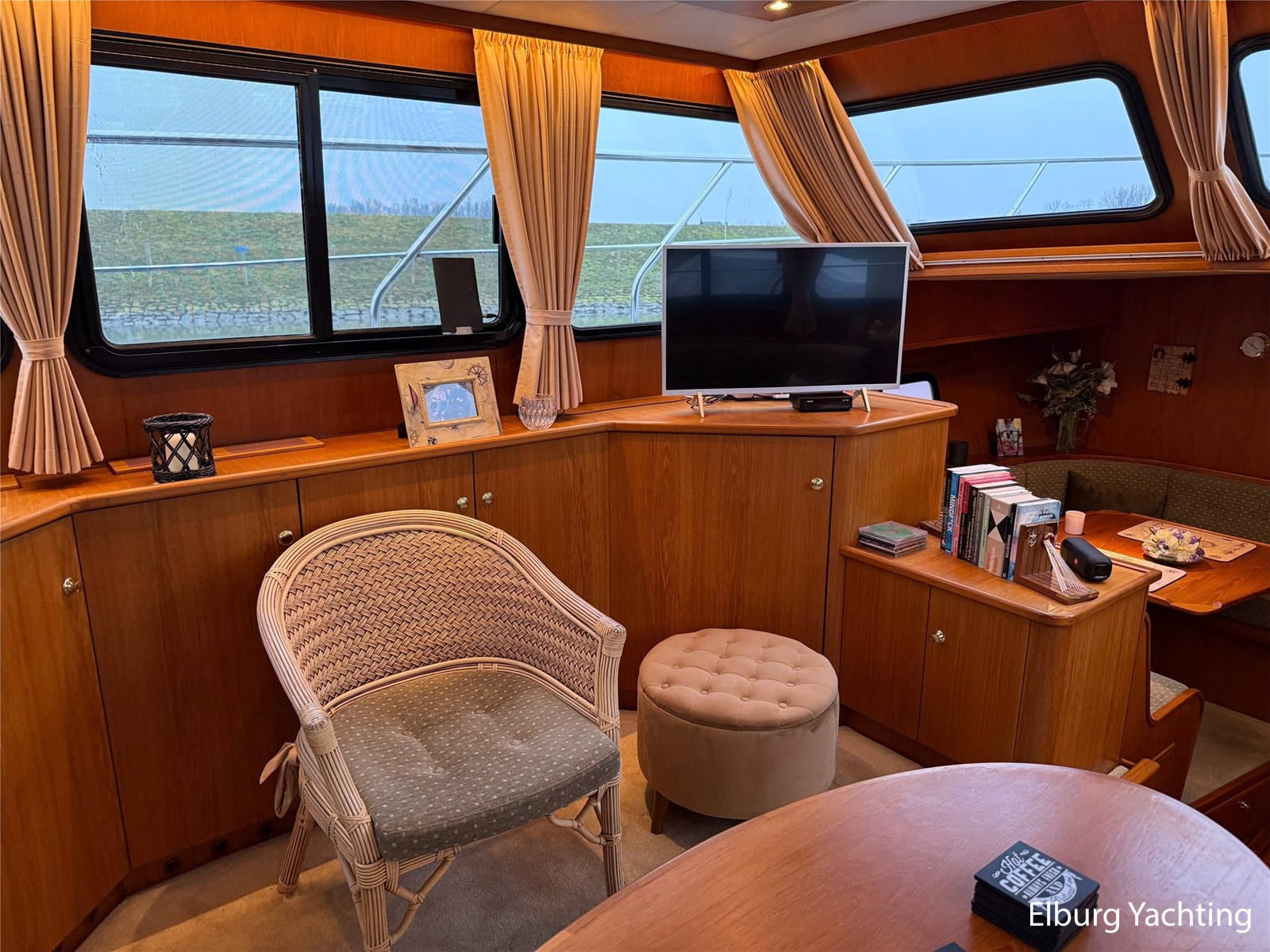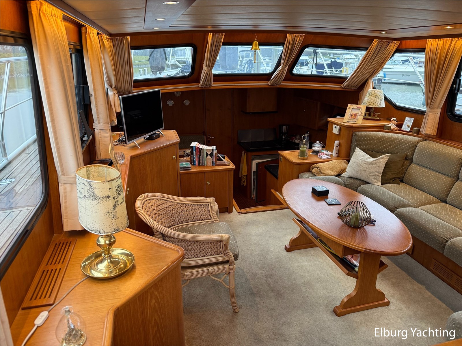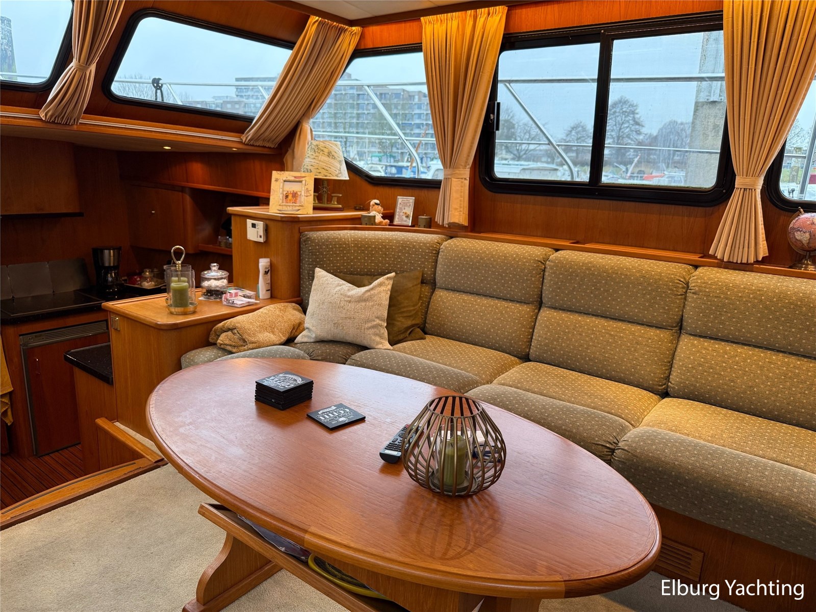 Binnen is het interieur van prachtig scheeps Teakhout in combinatie met bruine stoffen bekleding. Dit creëert een rustige ruimtelijke omgeving waar men heerlijk tot rust komt. Het jacht heeft een grote salon met comfortabele bank met tv en vloerbedekking. Verder naar voren de kombuis met daartegenover de dinette. Helemaal voorin is de voorhut met dubbel vrijstaand bed. Achter de salon via de luie trap naar beneden zijn de derde hut met stapelbed en daar tegenover de badkamer met elektrisch toilet, douche en wastafel gesitueerd en helemaal achterin zit de eigenaarshut met vrijstaand tweepersoons bed.