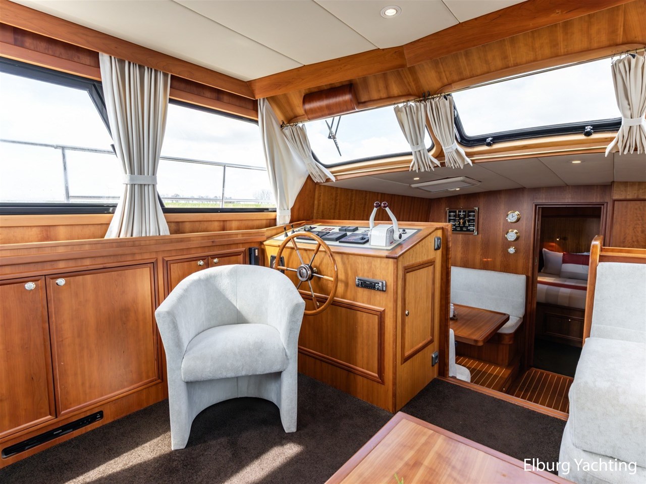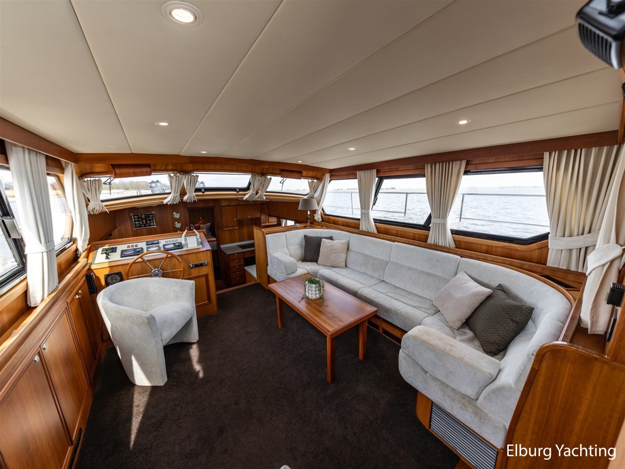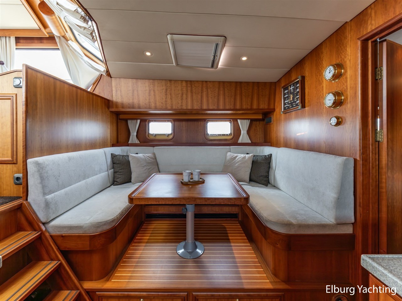 - Luxurious teak ship interior with light-colored fabric upholstery