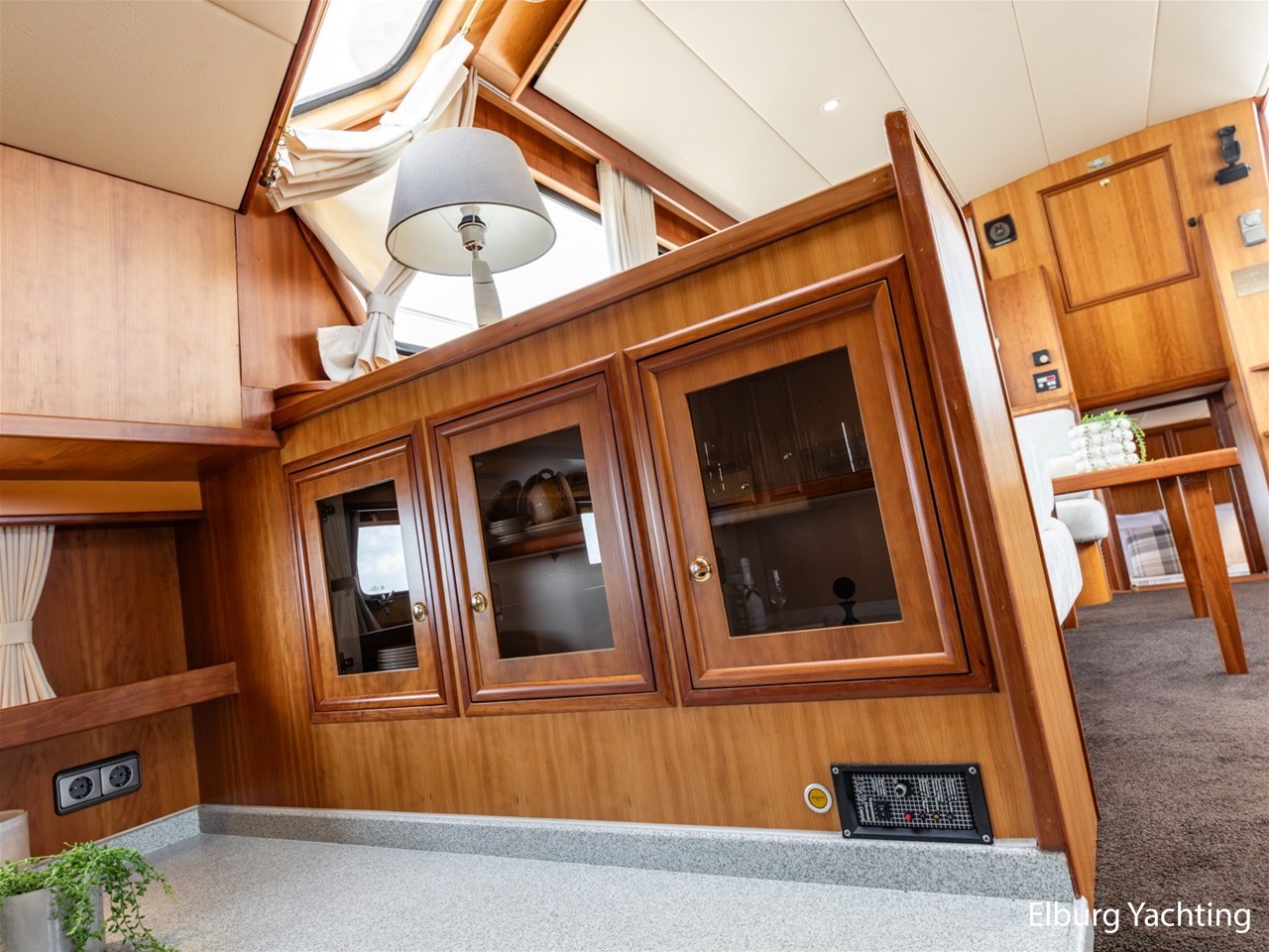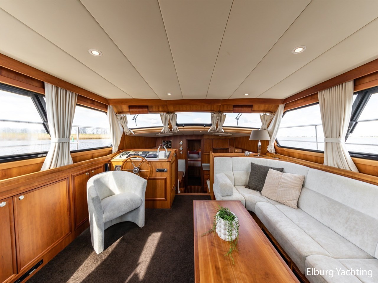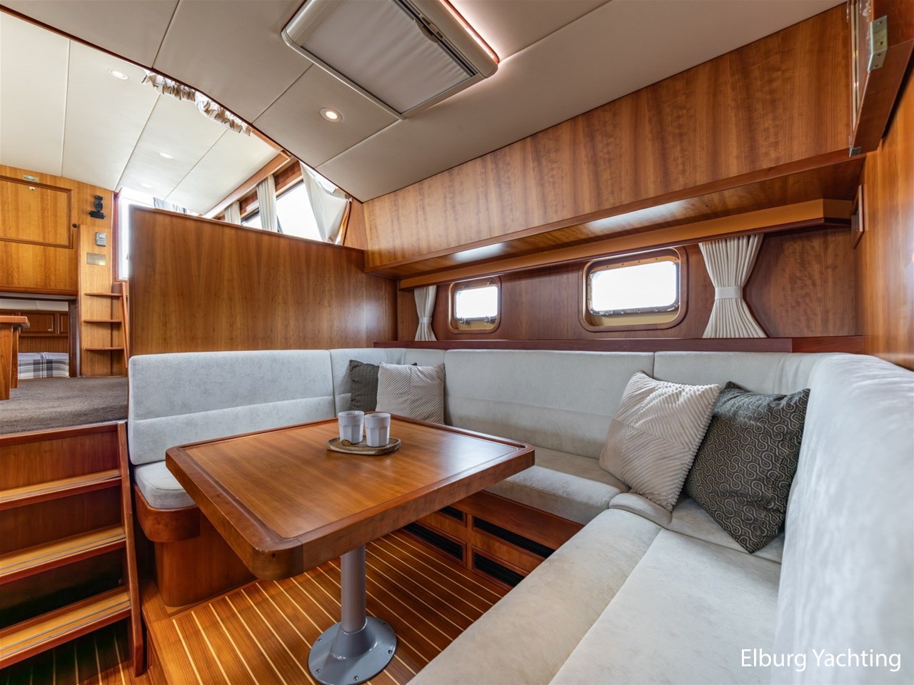 - Luxurious teak ship interior with light-colored fabric upholstery