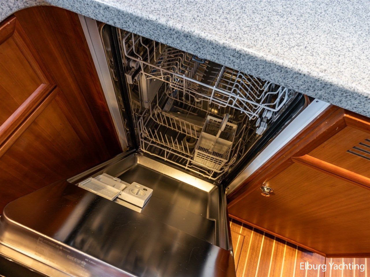 The saloon is spacious and features two sliding windows, a tilt window, and a Pioneer radio. The galley includes a Bosch dishwasher, and in the aft bathroom there is a washing machine, although its working condition is unknown.