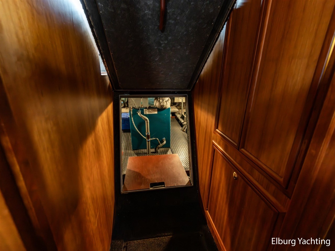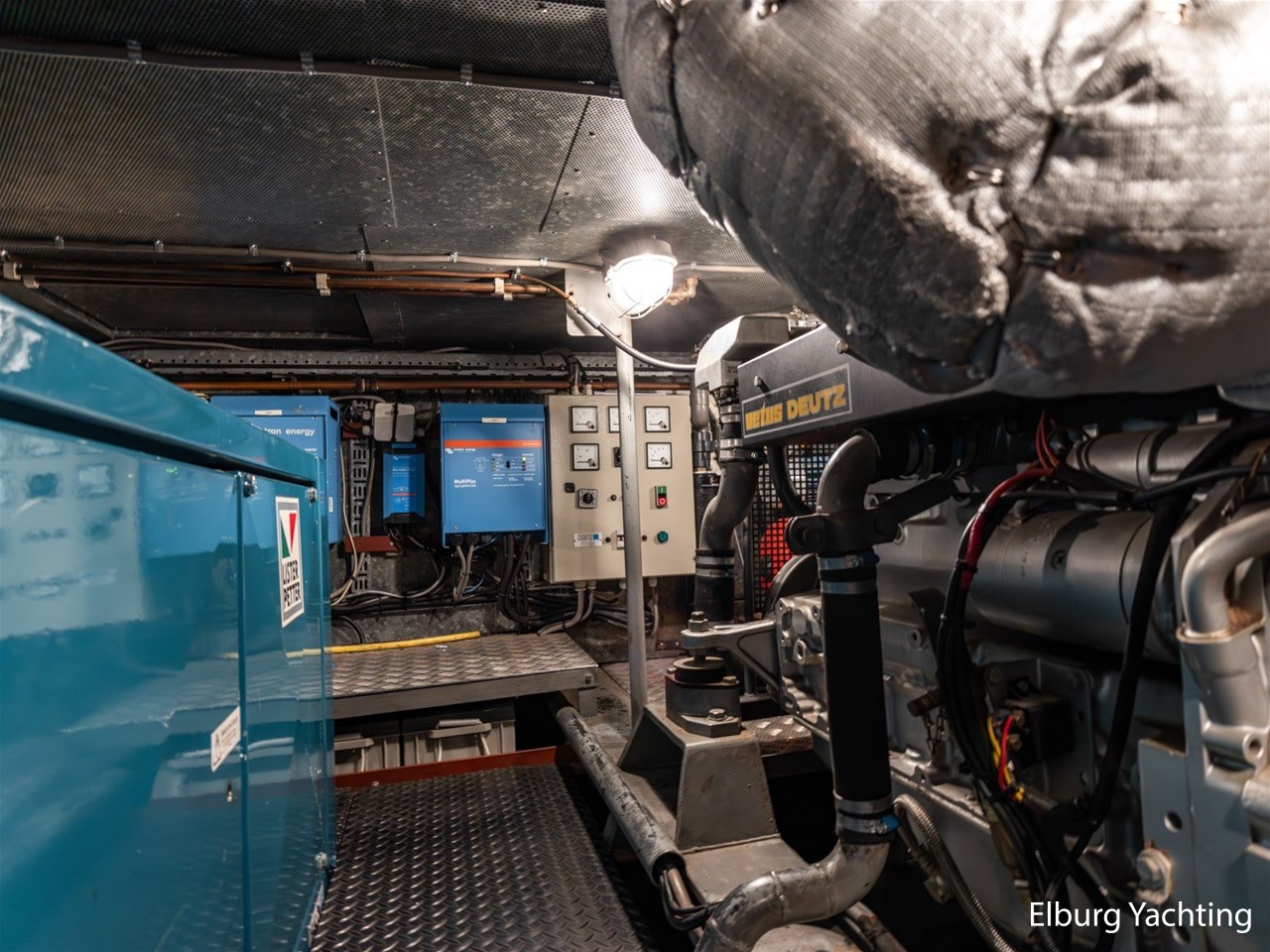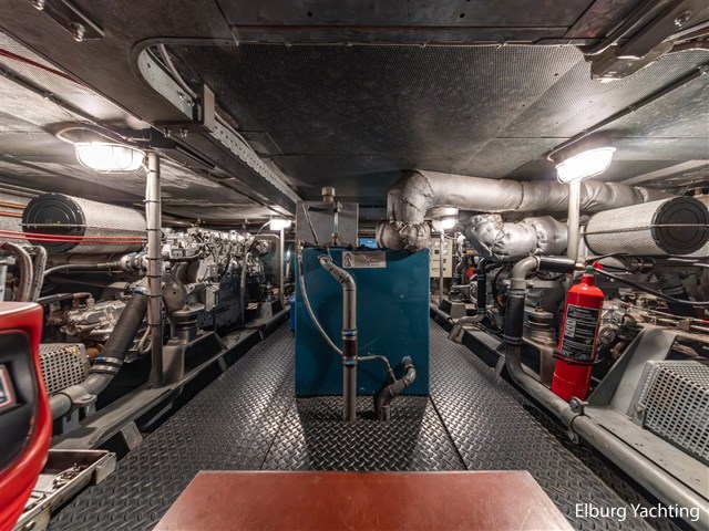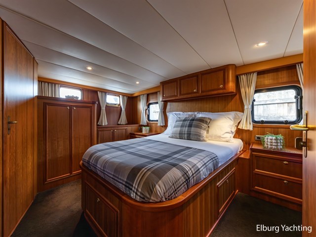 The engine room is generously sized and provides good access to all technical systems. The engines are indirectly cooled via a Blokland vlak-/beunkoeler and the ship is equipped with a VDO rudder position indicator. In addition, she has five deck hatches in the superstructure for ventilation. She can be steered both, from the saloon and from the aft deck. The side decks run level all around, ensuring safe passage on deck. In both the bow and stern, there is a steel collision bulkhead, and she is equipped with two new propellers as spares on board.