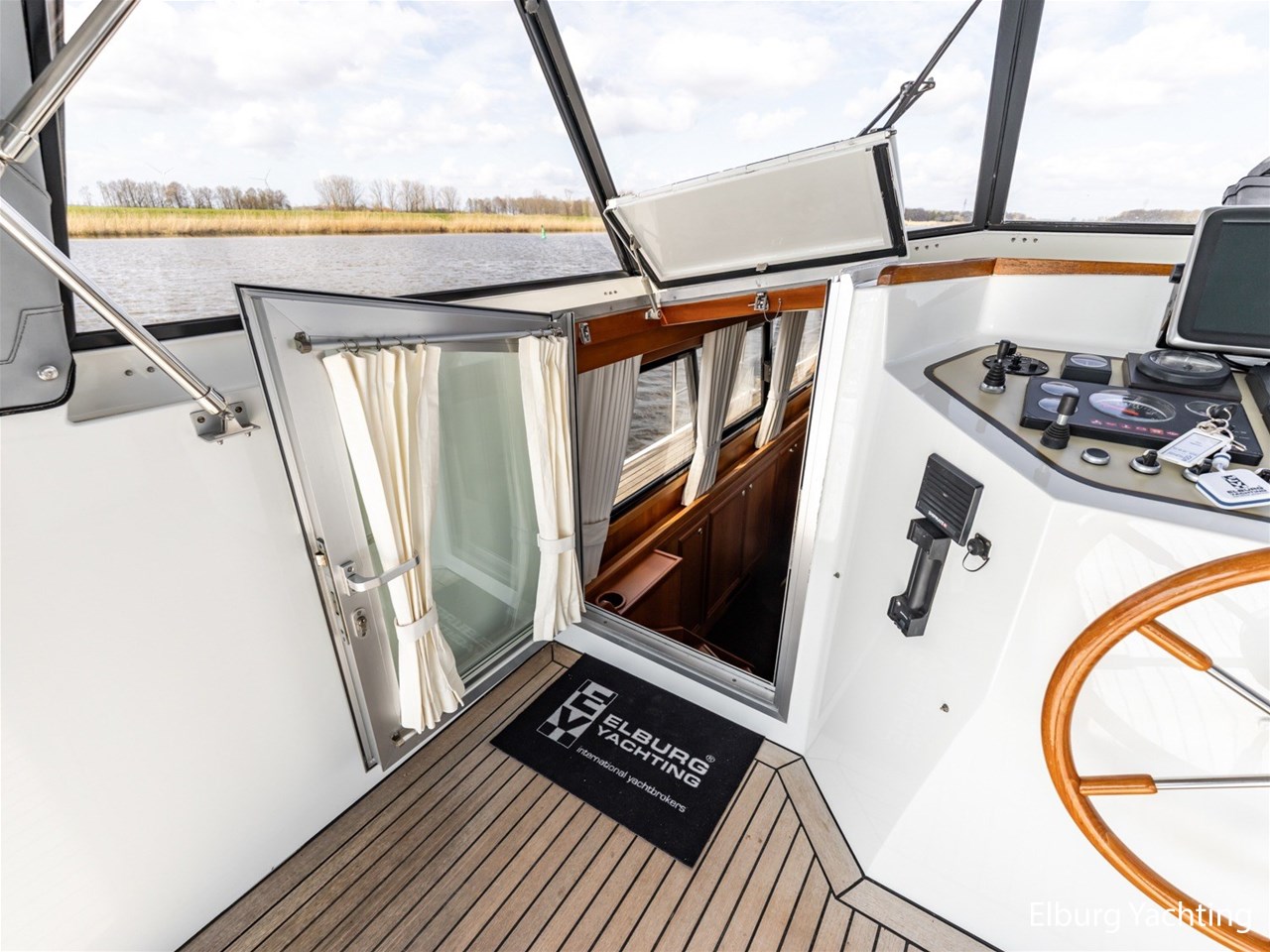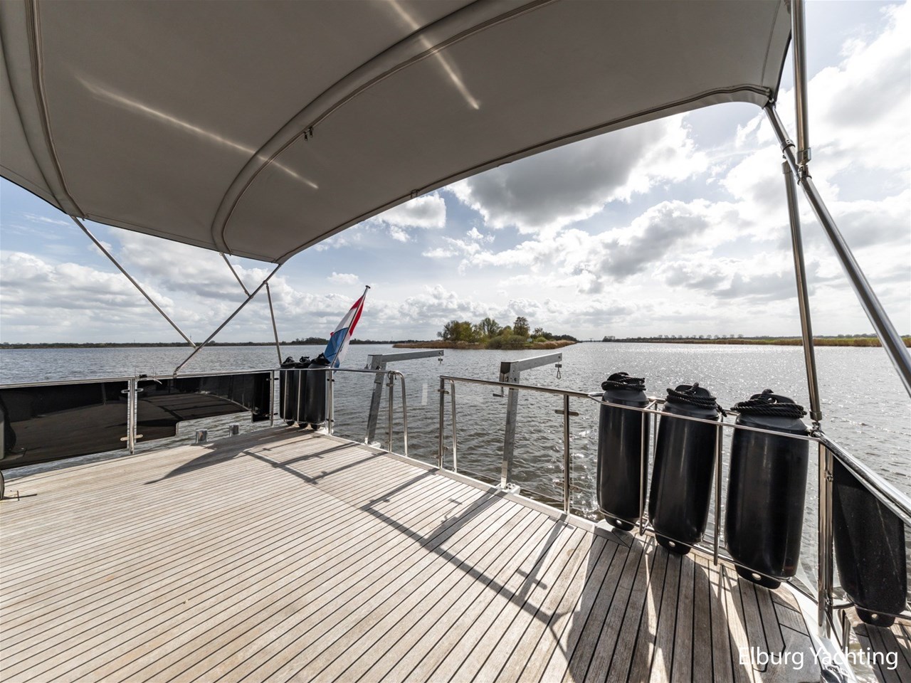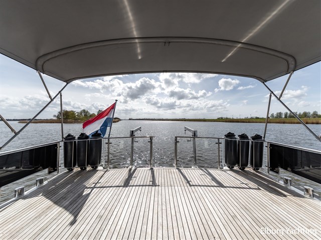 This ship, named “Lieneke”, is equipped with, among other things, a lockable enclosure around the helm position and a foldable bimini over the aft deck. The aft deck features transparent bulwark panels in the railing, a foldable radar arch, and a removable stainless-steel side ladder with good handholds, as well as a cover for the exterior steering position, a companion bench, a removable helm chair, and stainless-steel fender holders on the railing suitable for 10 fenders.