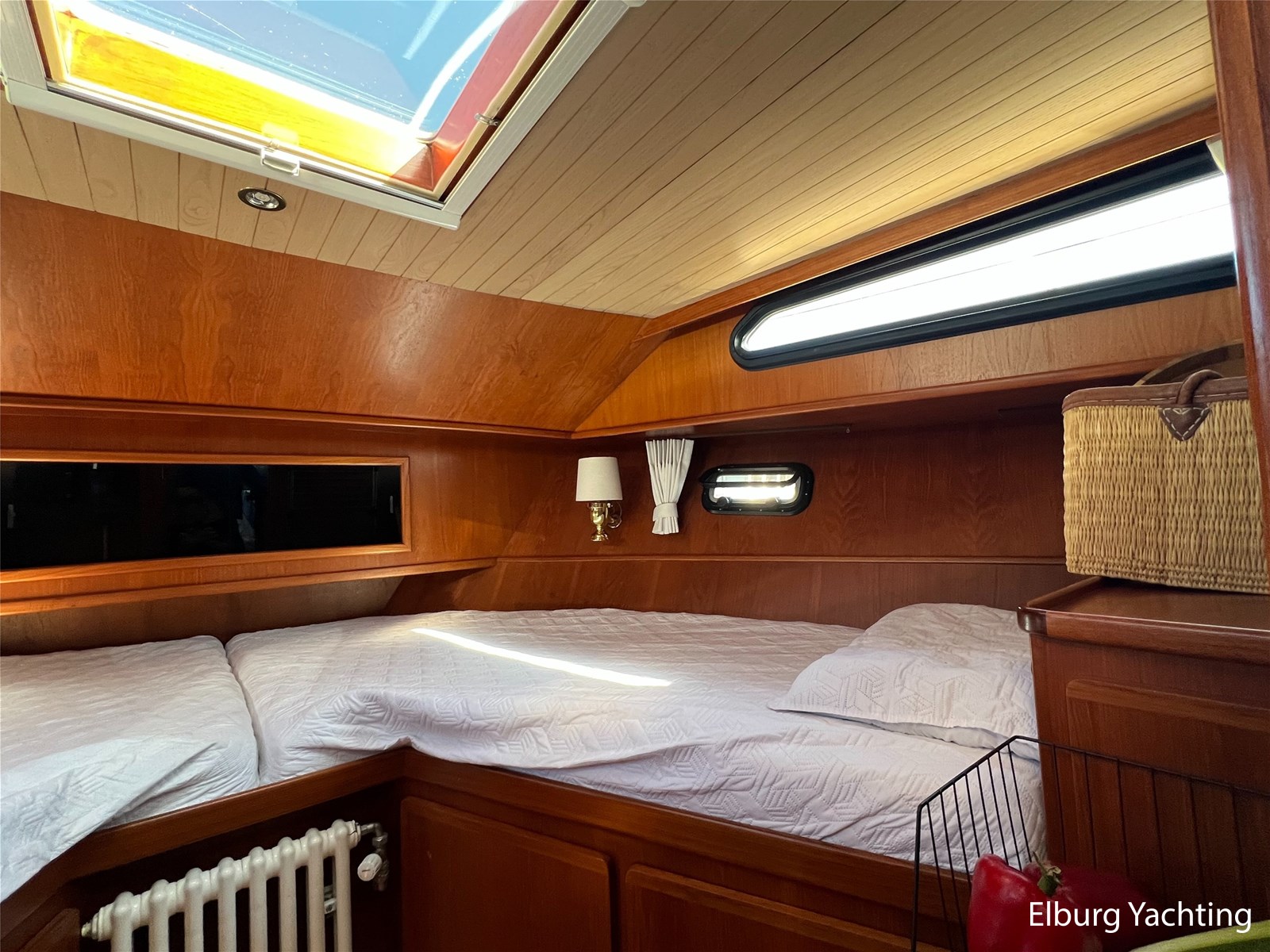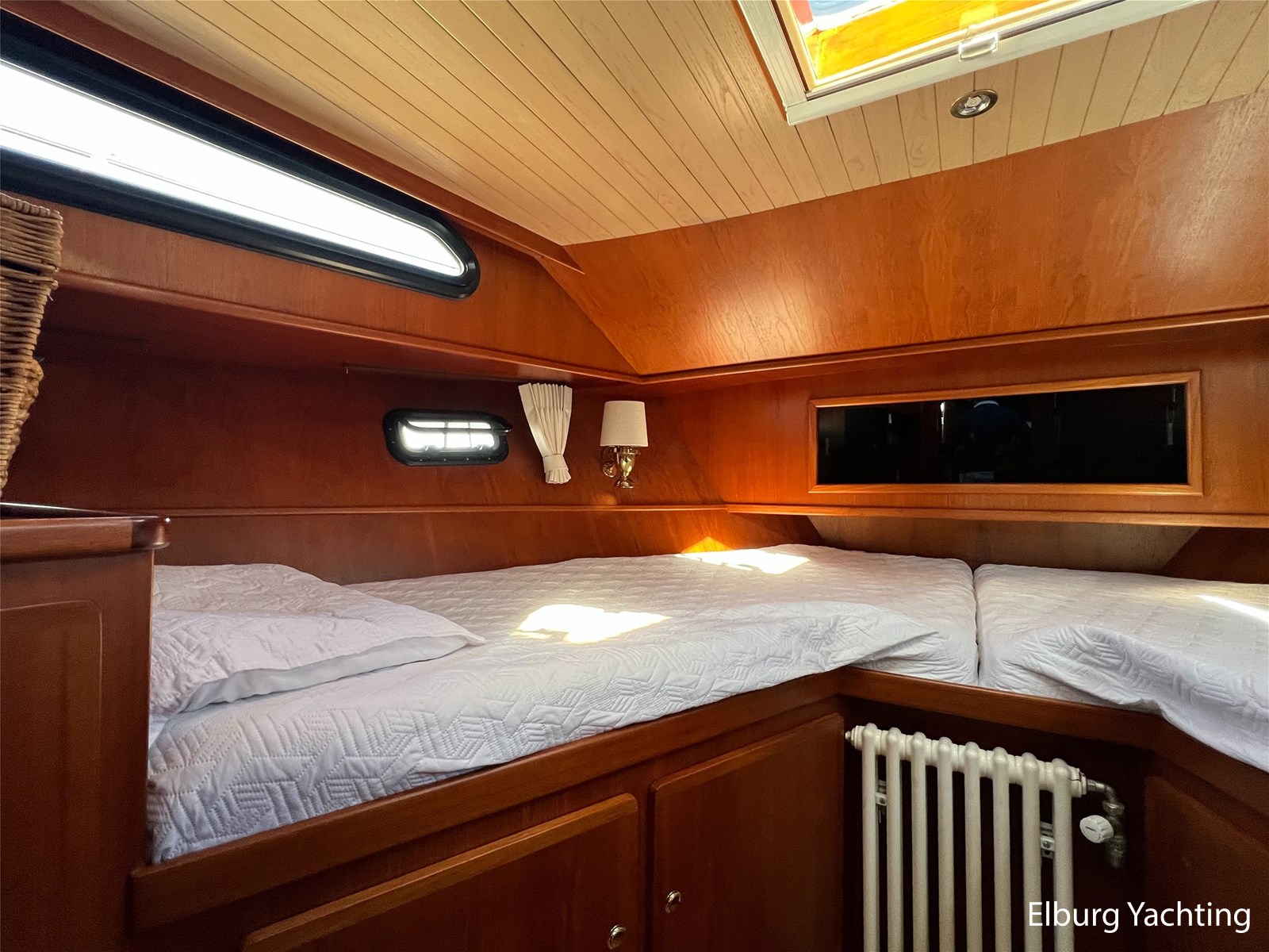 - 4 beds (1 freestanding bed in the aft cabin, 1 V-shaped bed in the forward cabin)