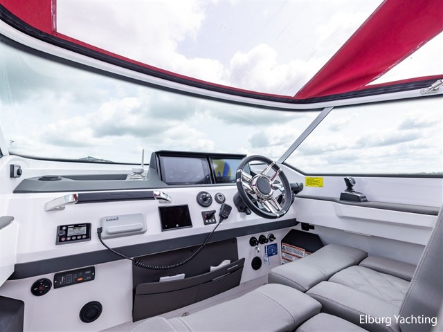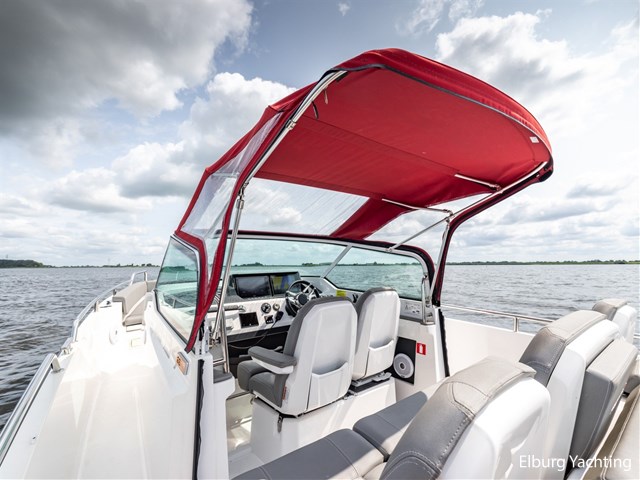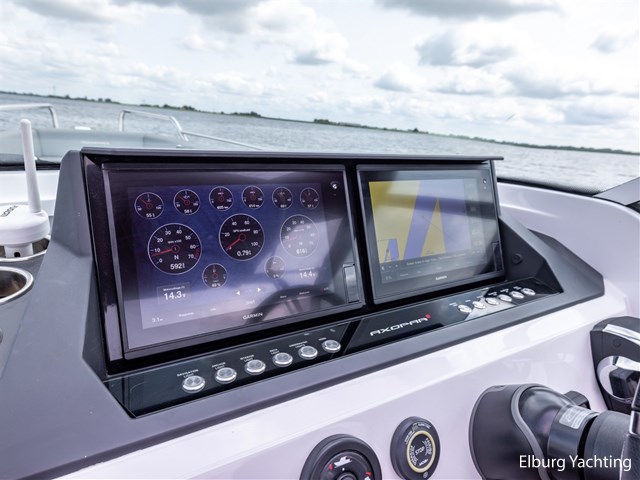 In addition to its high top speed of approx. 80 km/h, this versatile Axopar 28 open features a Seastar Optimus 360 Joystick steering system, Water ski pole, lots of storage space, Trimtabs, sink by toilet, sink under boat seat, stainless steel cup holders, swiveling helm seats, plenty of all-round visibility, rubber bumpers and a Fusion audio MS-NRX300 system.