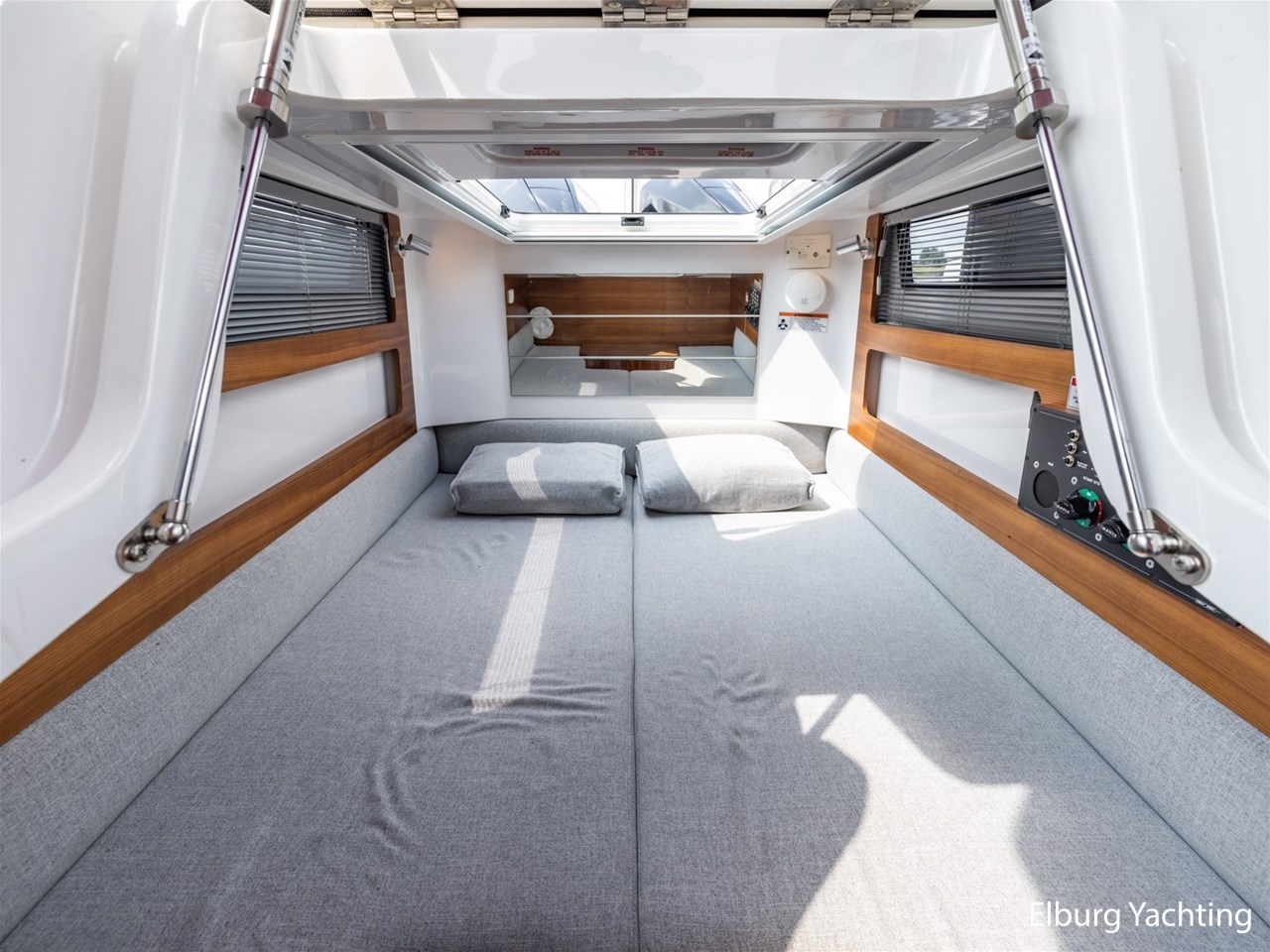 The optional aft cabin offers comfortable sleeping accommodation for two and also serves as a sun deck. The driver's seats can be flipped over creating a dining opportunity.