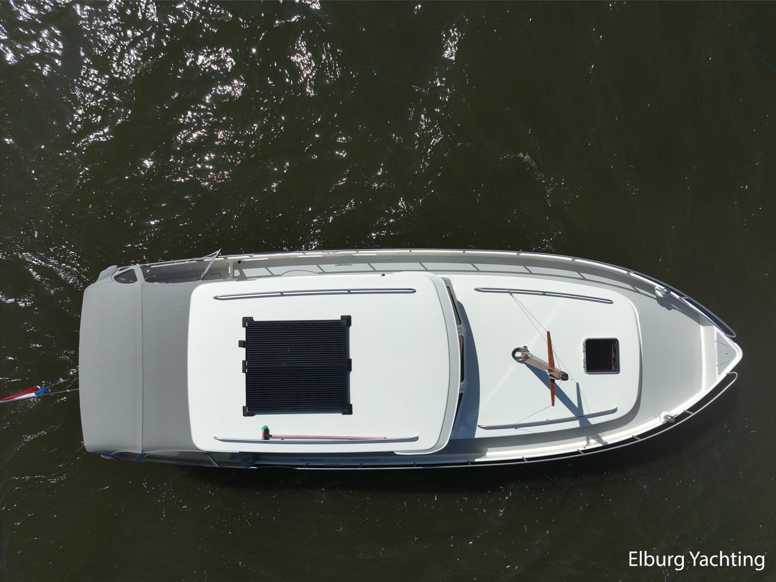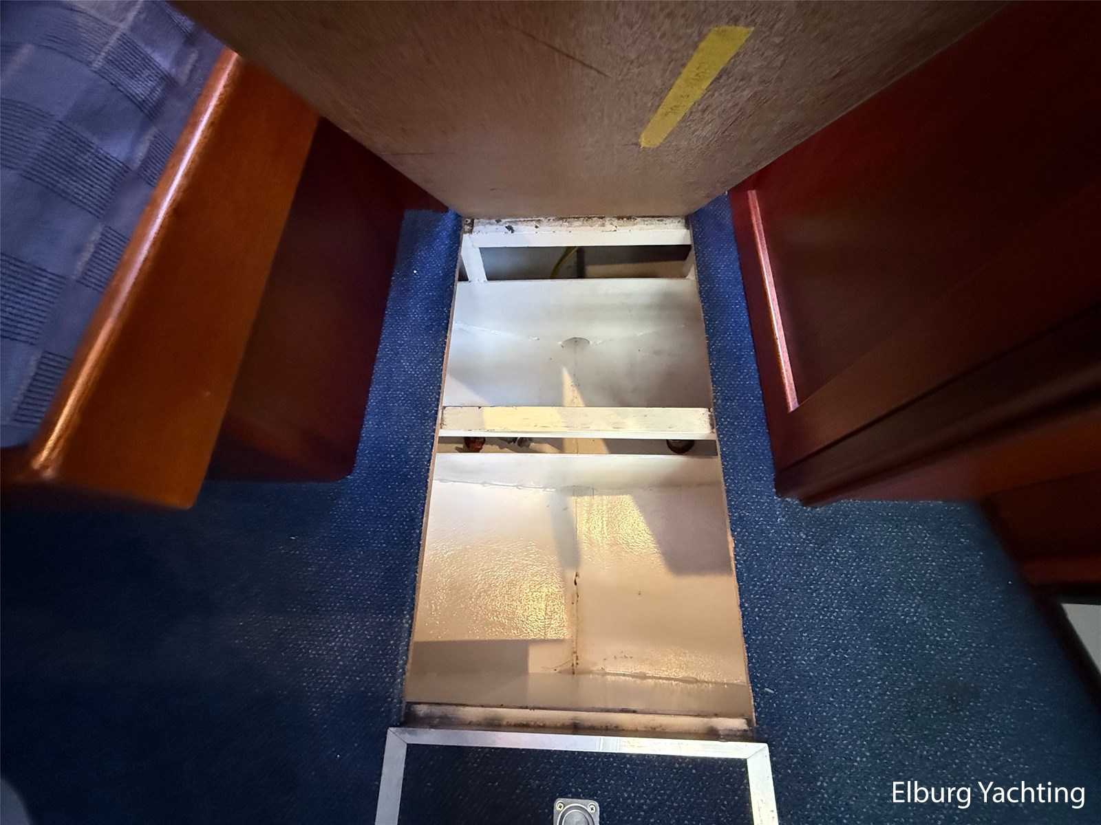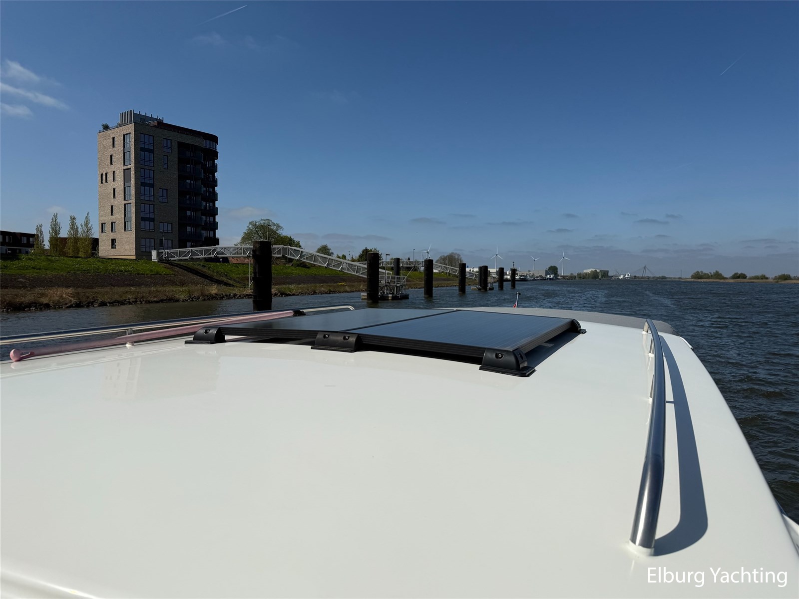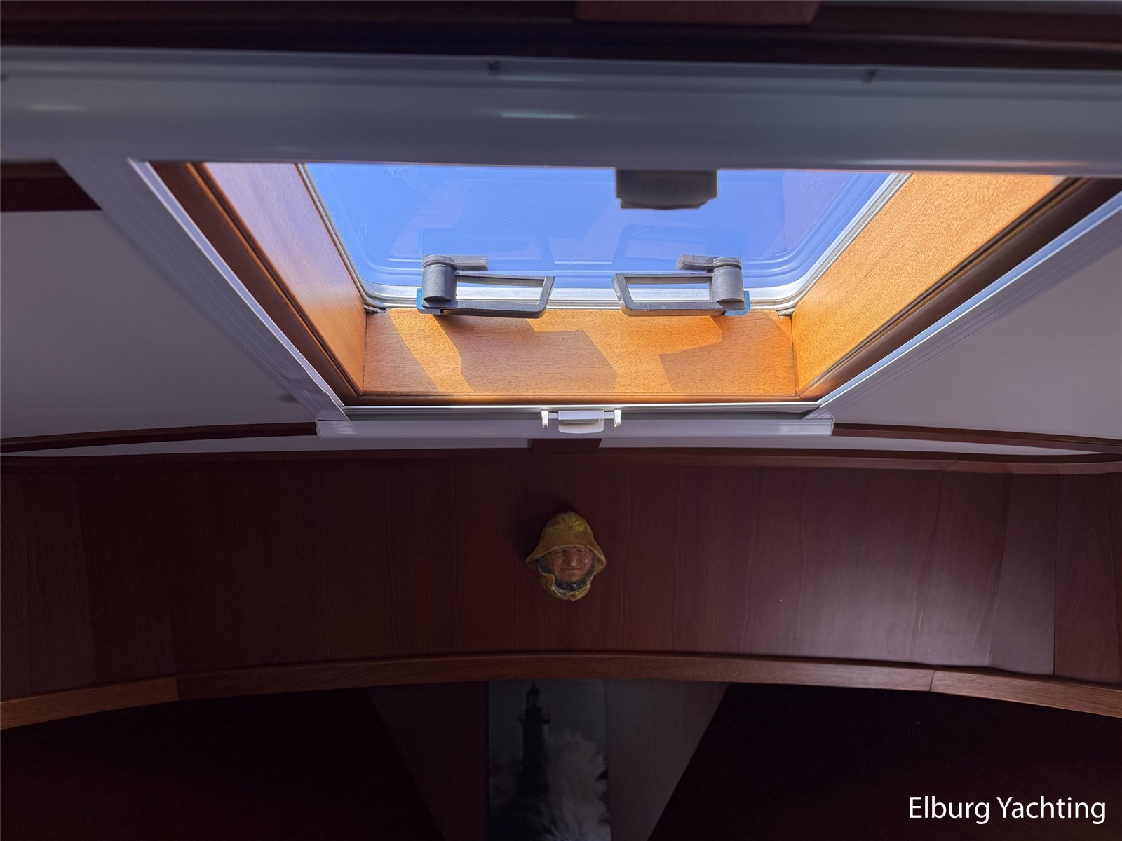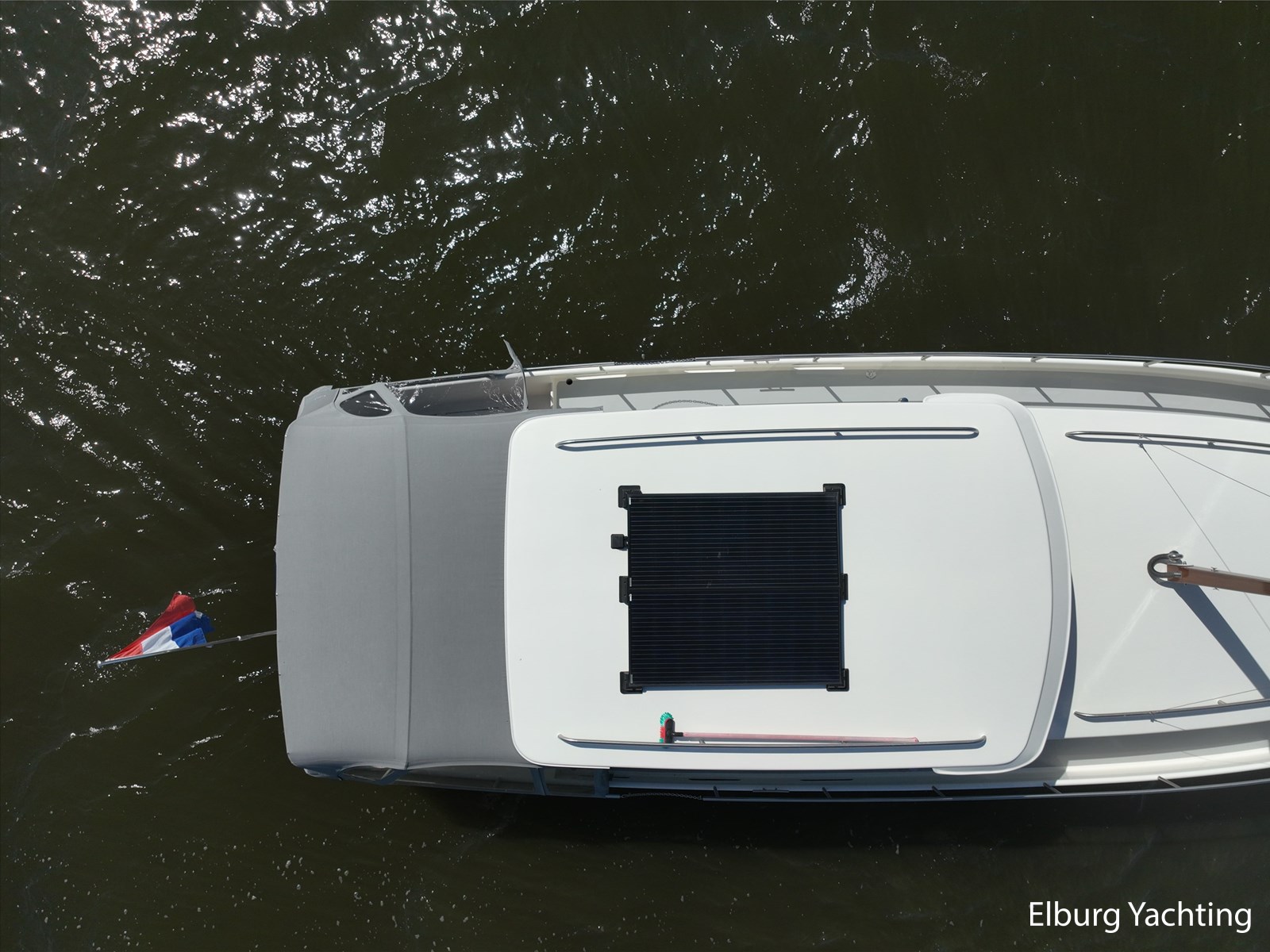 The Vroege Vogel is practically equipped and features: New cockpit cover (2025), solar panels for extra autonomy, a powerful 89 hp Mitsubishi 6-cylinder engine, electric bow thruster (95 kgf) for easy maneuvering, deck wash pump, keel fins (which keep the boat stable), a folding mast resulting in a very low clearance height, Webasto hot-air heating, a 3-burner stove, a manual anchor winch in the locker, a Victron Phoenix Multi inverter/charger, and a pull-out salon bench that creates two extra sleeping spots in a snap. The boat is also equipped with an integrated swim platform with a swim ladder and an Advansea marine radio.