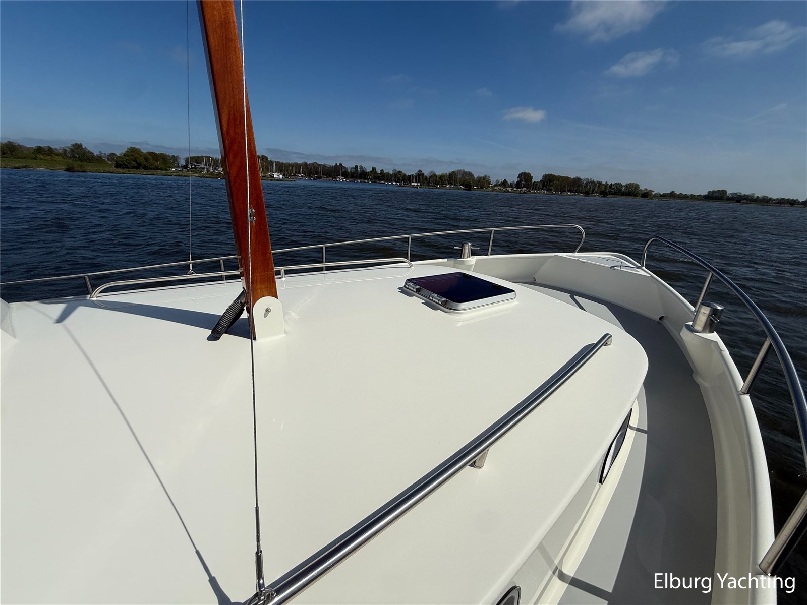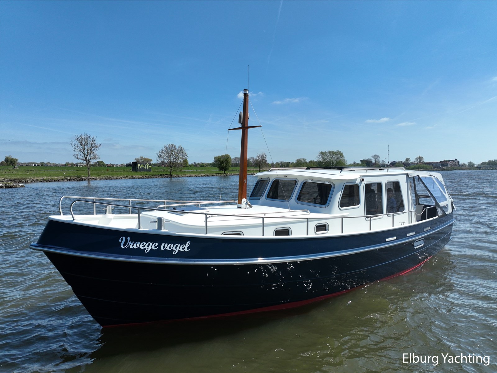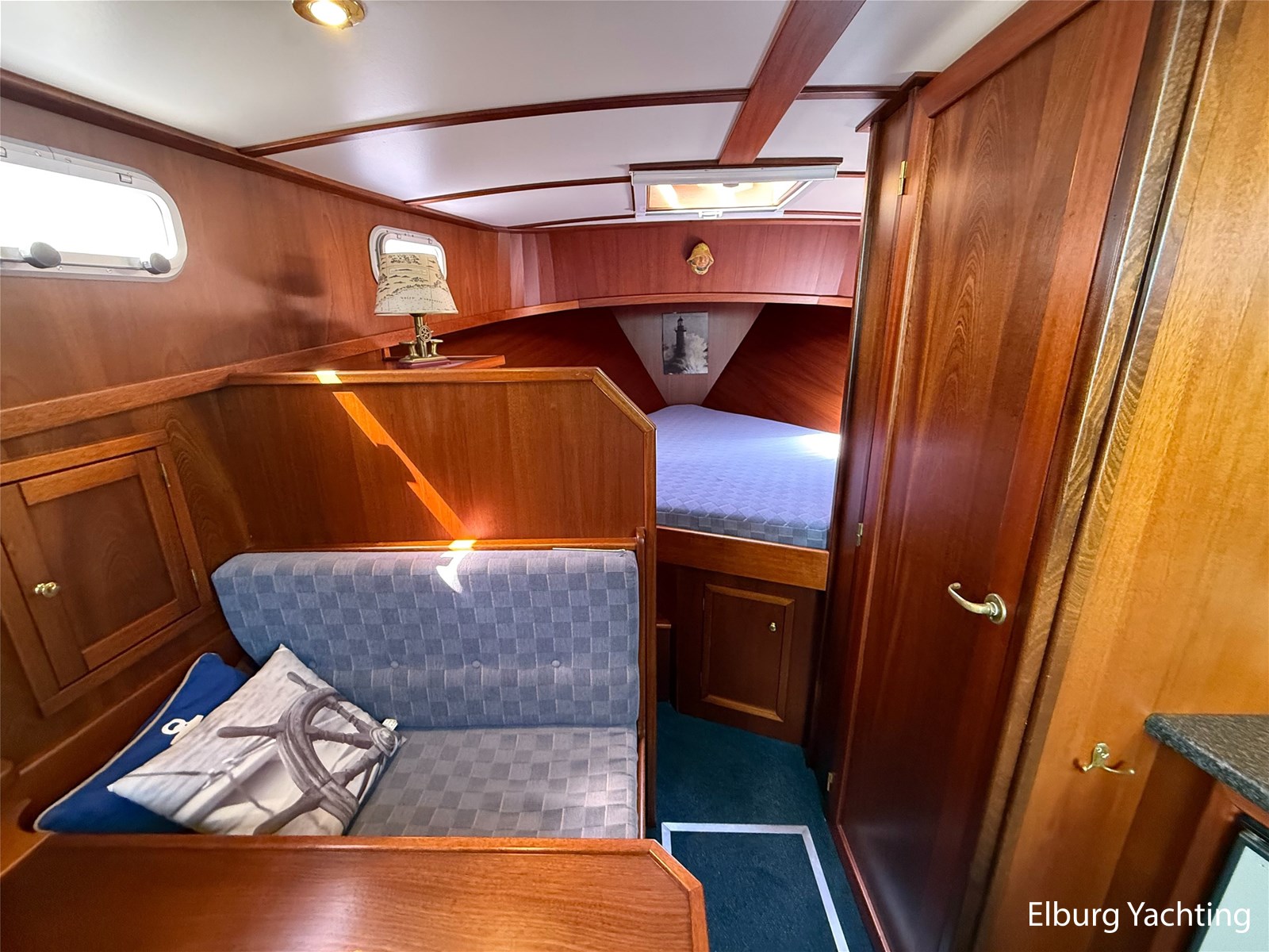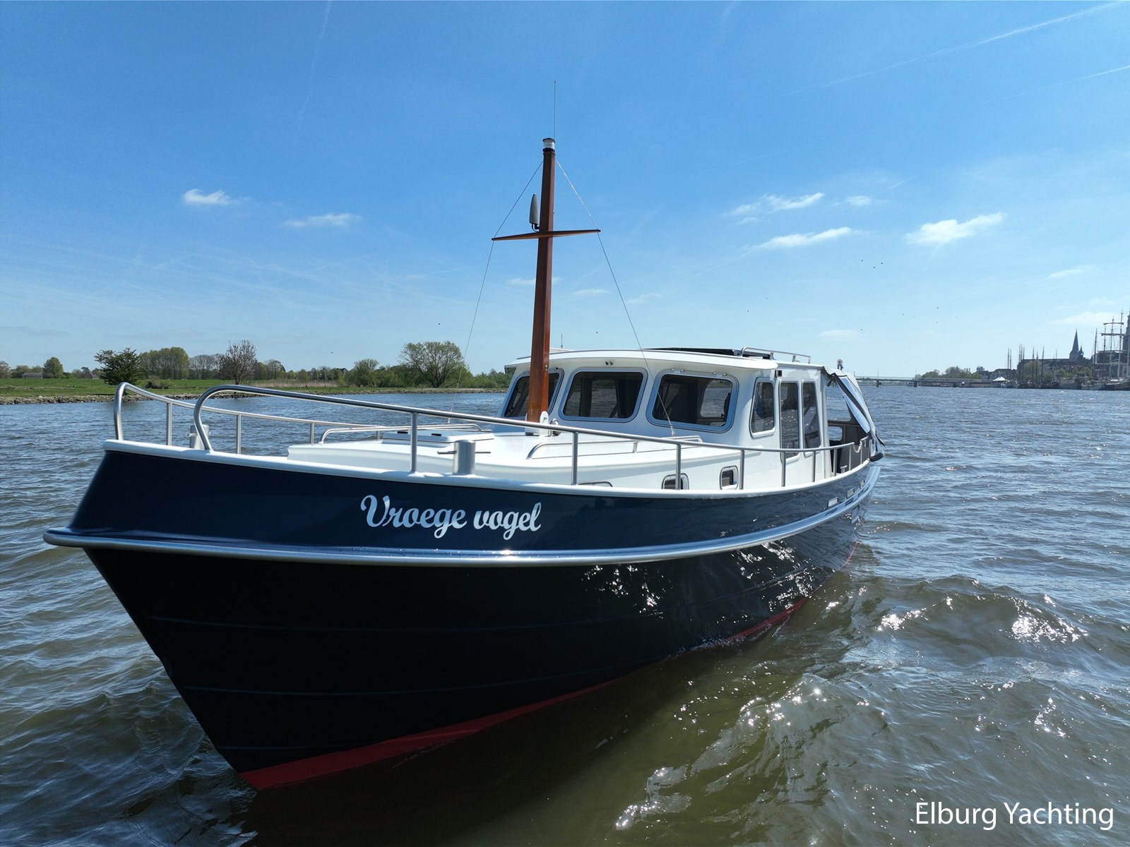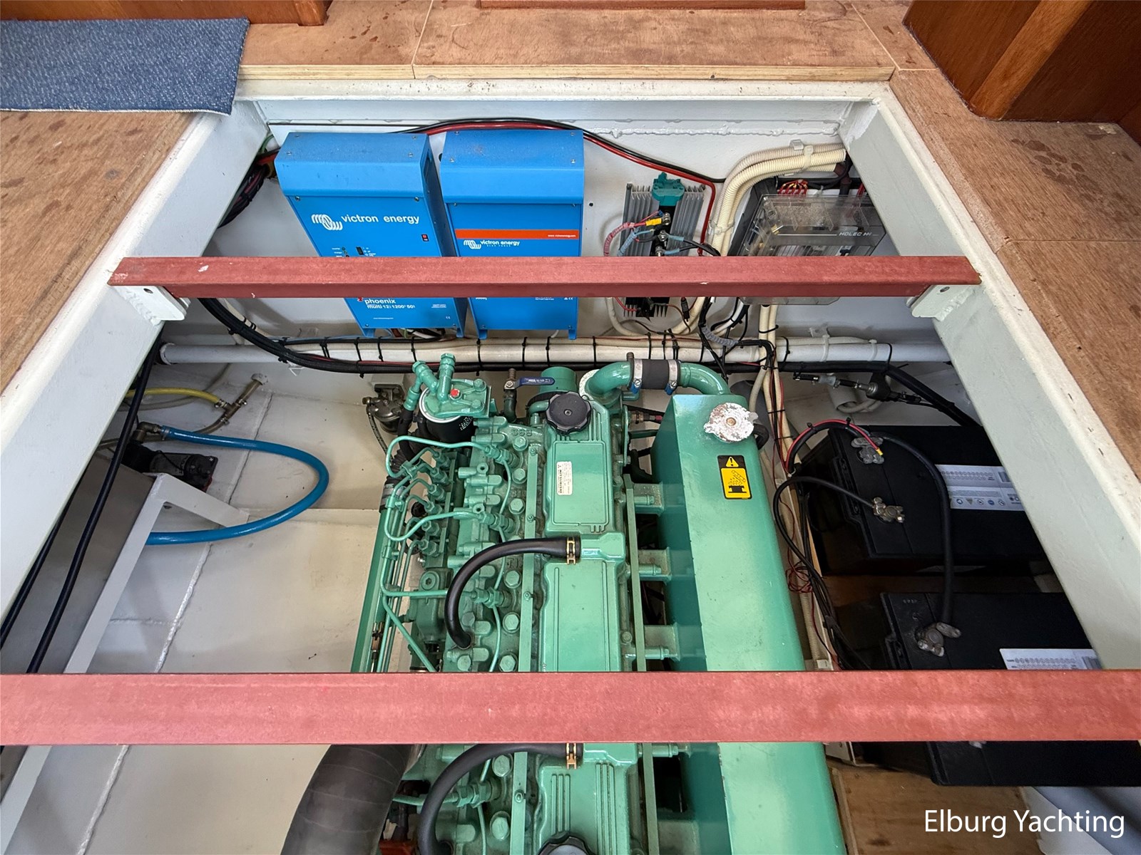 The Vroege Vogel is practically equipped and features: New cockpit cover (2025), solar panels for extra autonomy, a powerful 89 hp Mitsubishi 6-cylinder engine, electric bow thruster (95 kgf) for easy maneuvering, deck wash pump, keel fins (which keep the boat stable), a folding mast resulting in a very low clearance height, Webasto hot-air heating, a 3-burner stove, a manual anchor winch in the locker, a Victron Phoenix Multi inverter/charger, and a pull-out salon bench that creates two extra sleeping spots in a snap. The boat is also equipped with an integrated swim platform with a swim ladder and an Advansea marine radio.