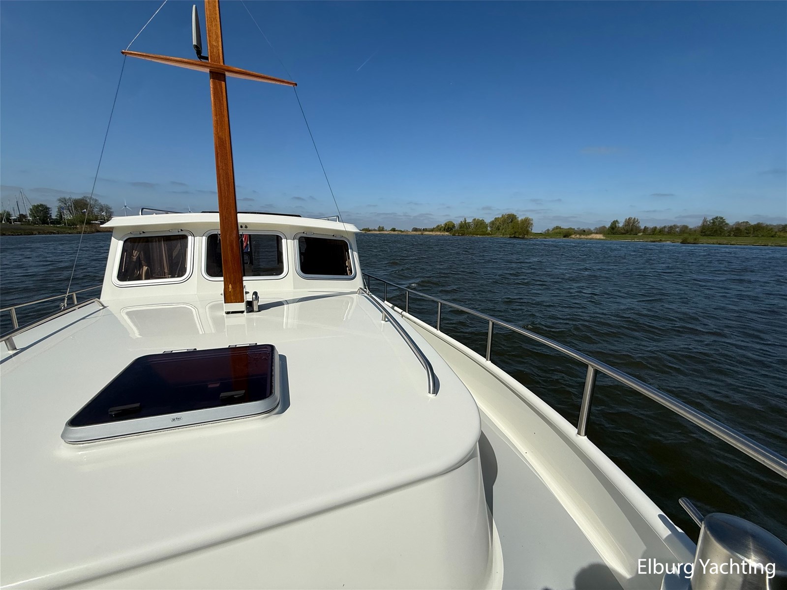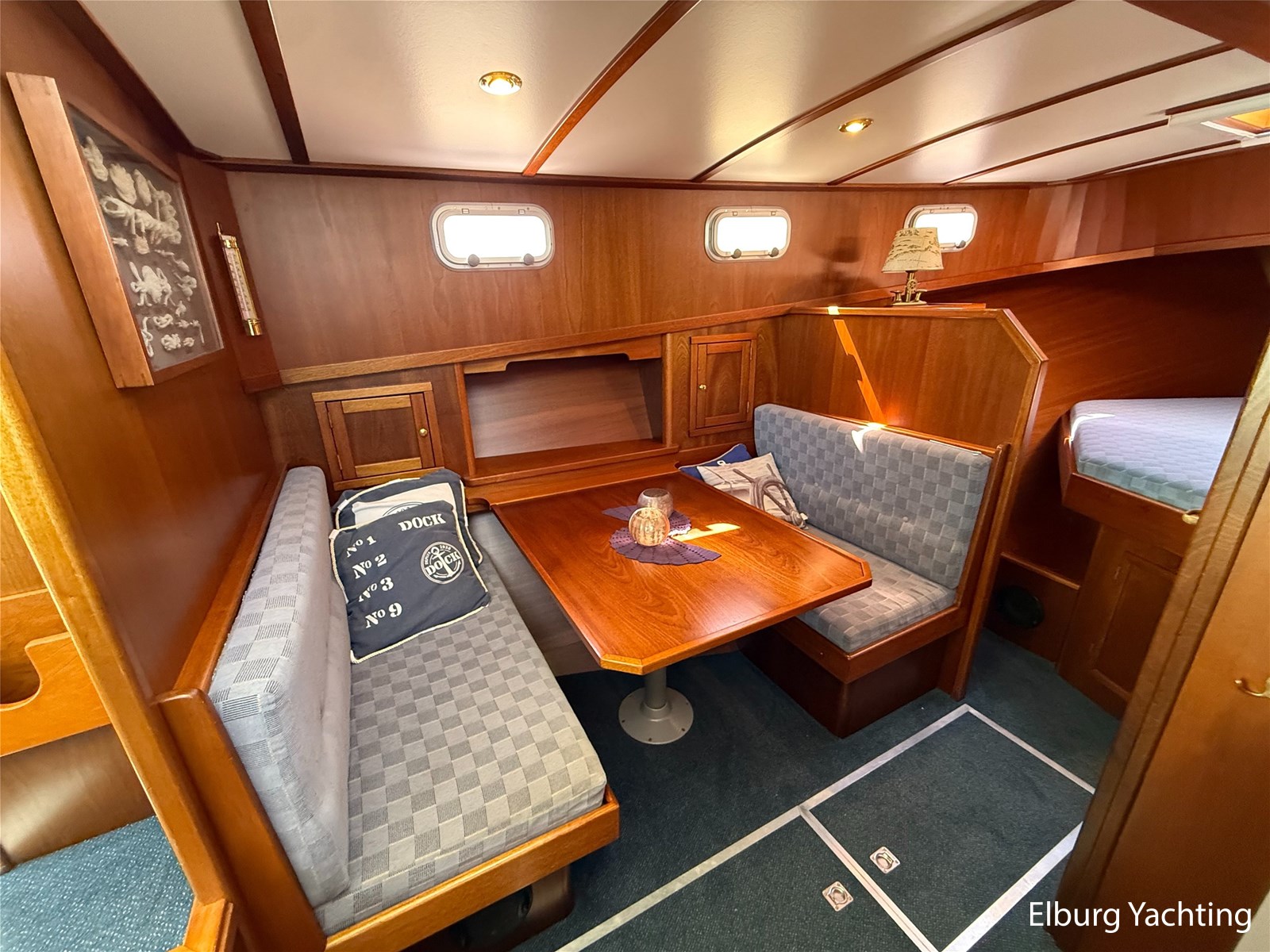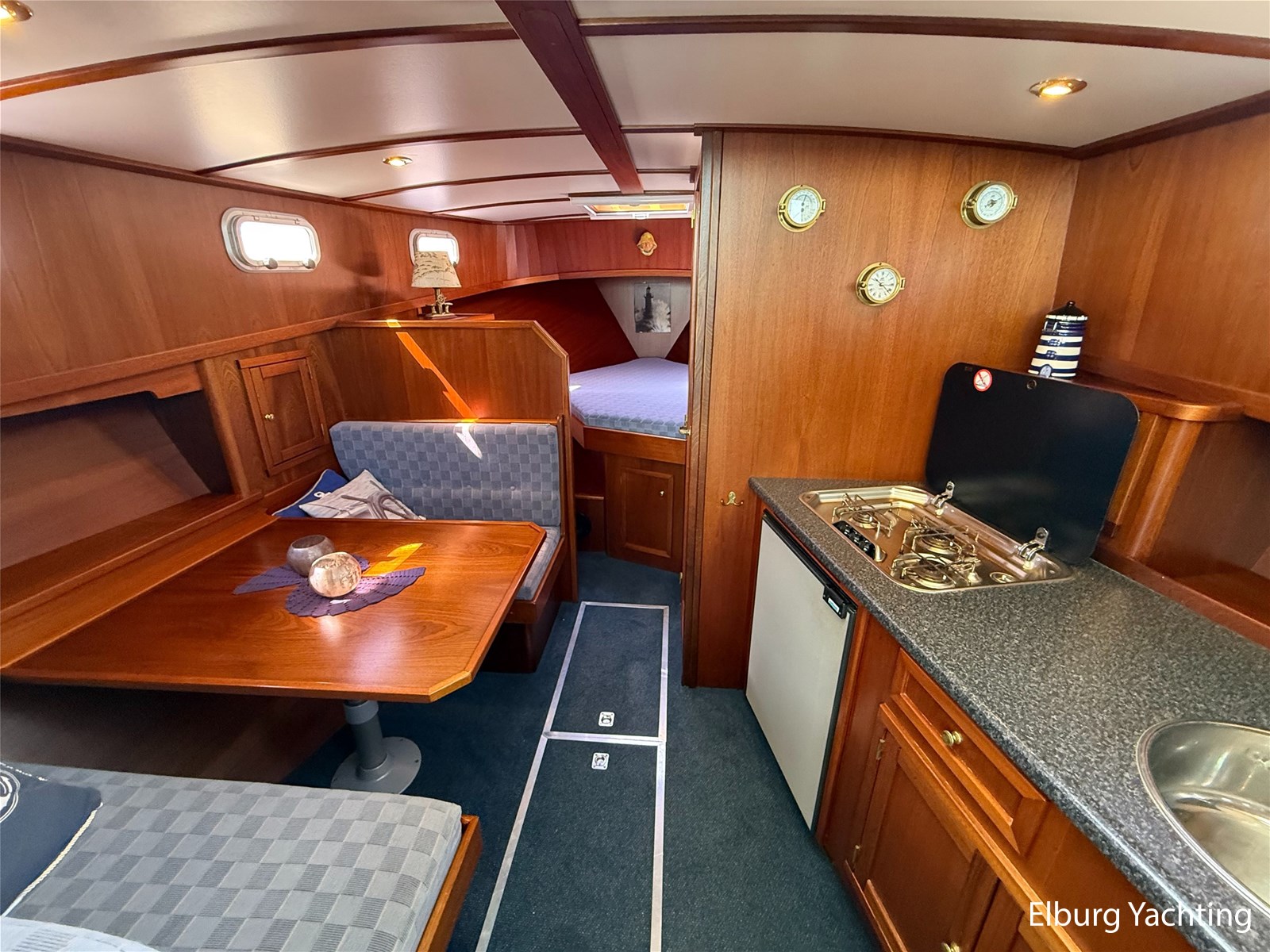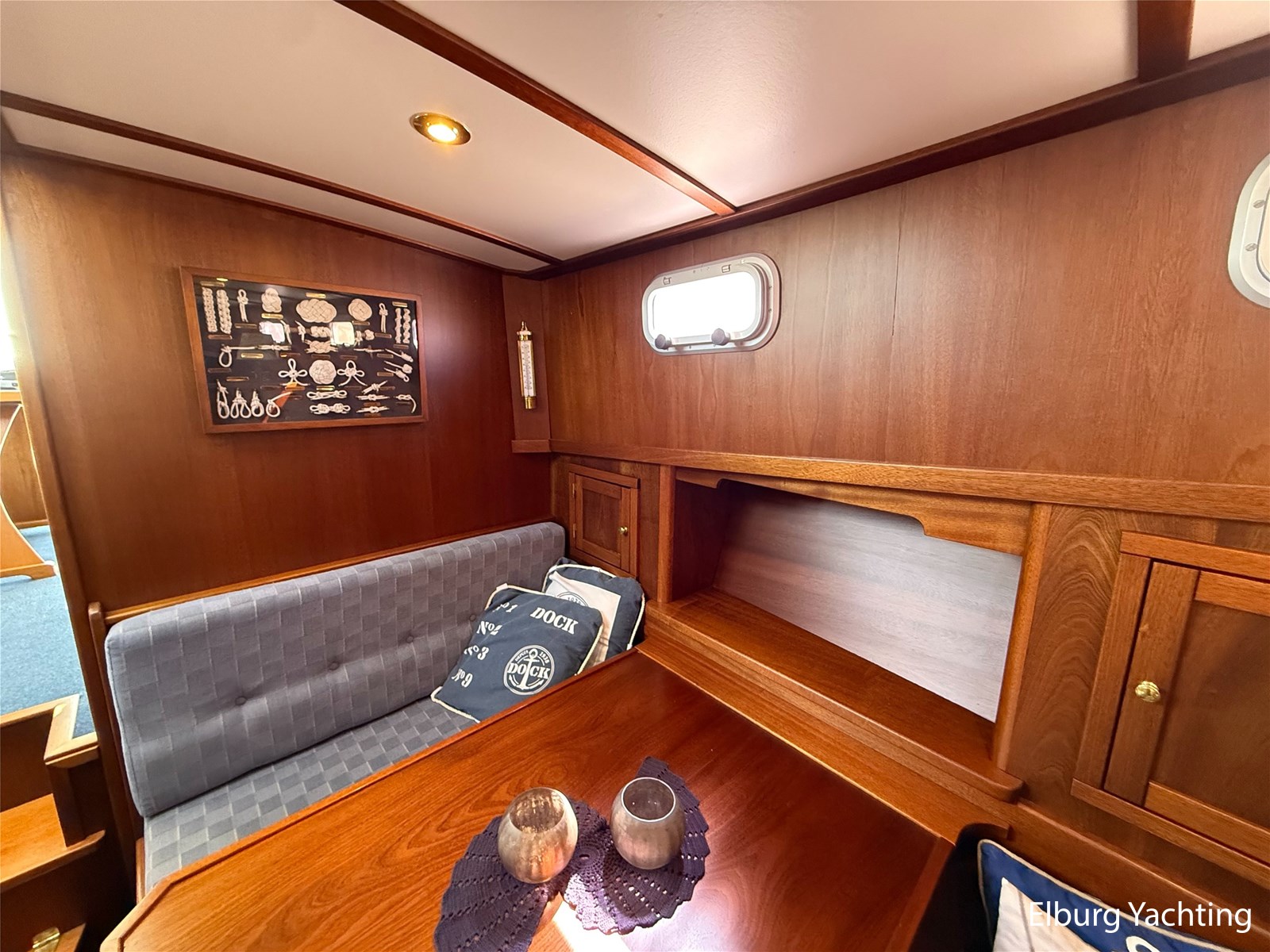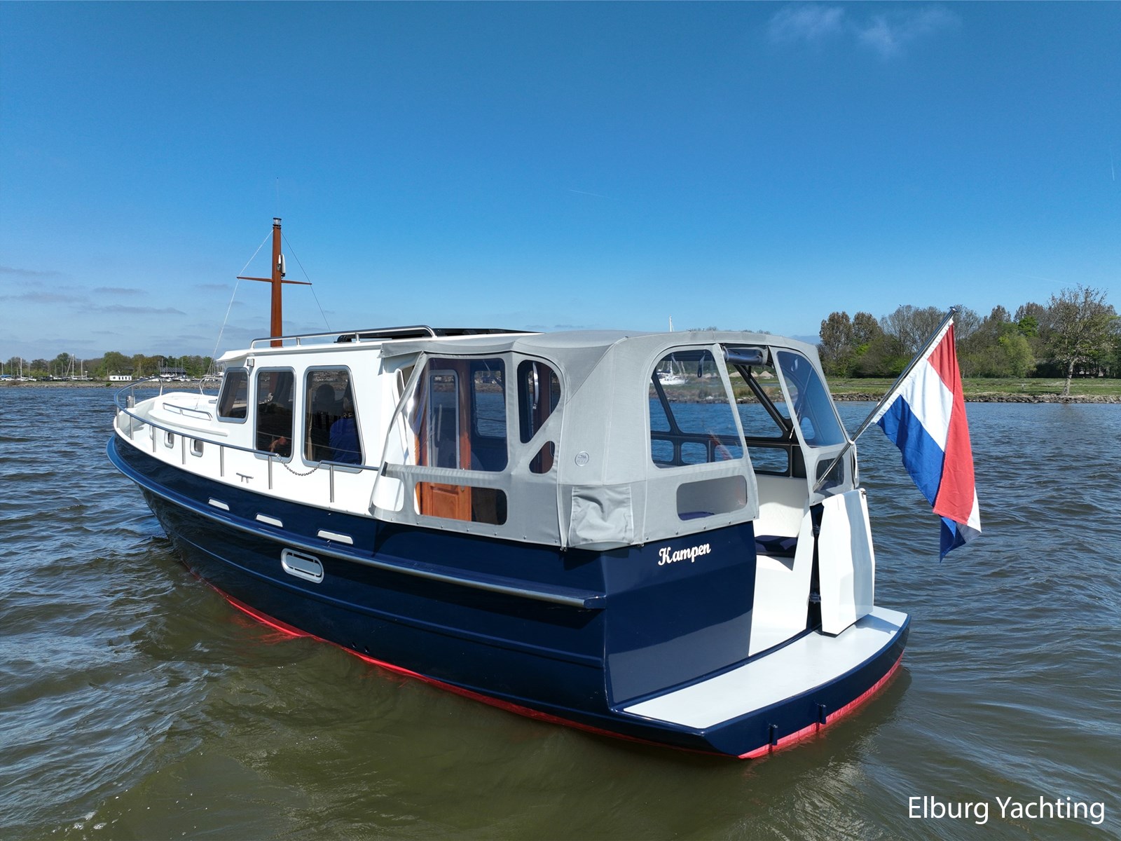 The Vroege Vogel is practically equipped and features: New cockpit cover (2025), solar panels for extra autonomy, a powerful 89 hp Mitsubishi 6-cylinder engine, electric bow thruster (95 kgf) for easy maneuvering, deck wash pump, keel fins (which keep the boat stable), a folding mast resulting in a very low clearance height, Webasto hot-air heating, a 3-burner stove, a manual anchor winch in the locker, a Victron Phoenix Multi inverter/charger, and a pull-out salon bench that creates two extra sleeping spots in a snap. The boat is also equipped with an integrated swim platform with a swim ladder and an Advansea marine radio.