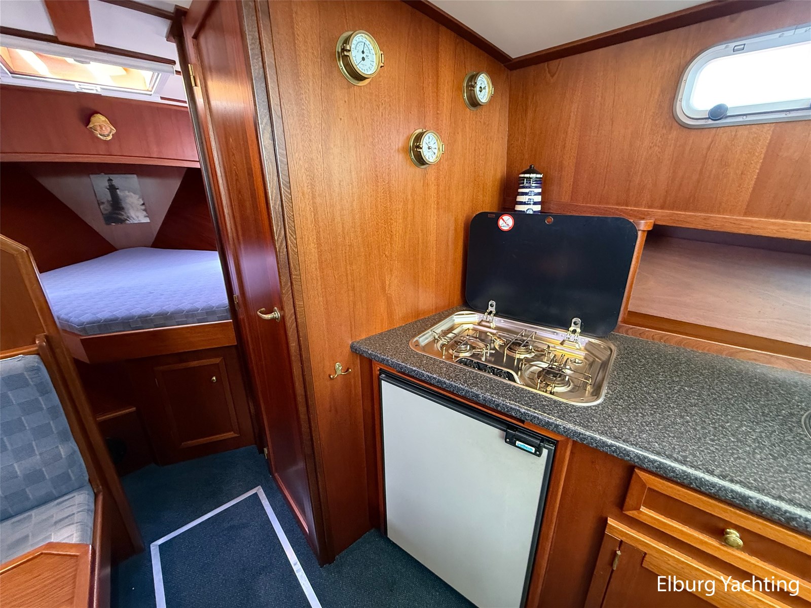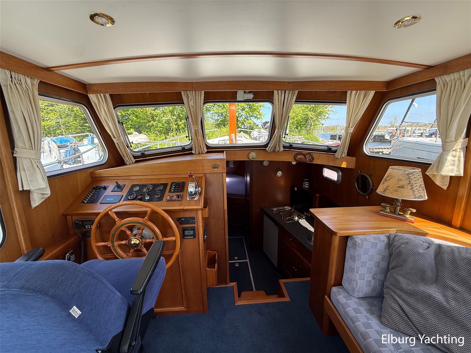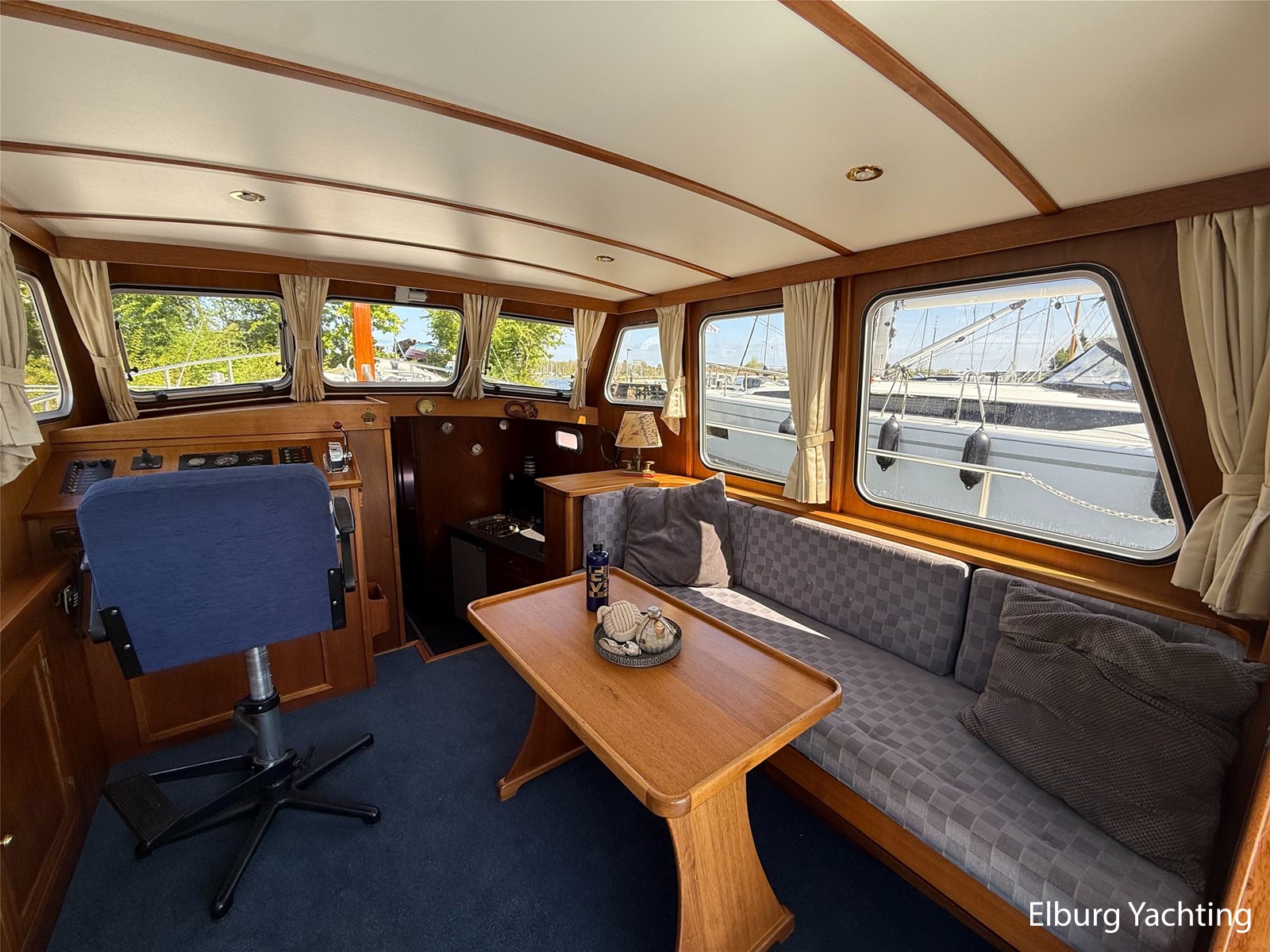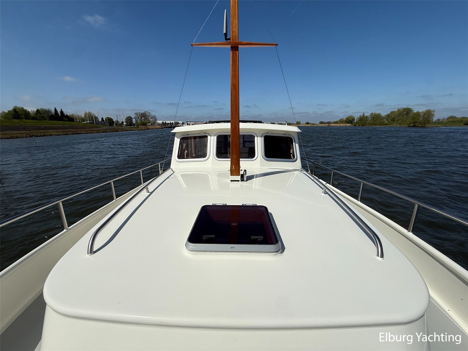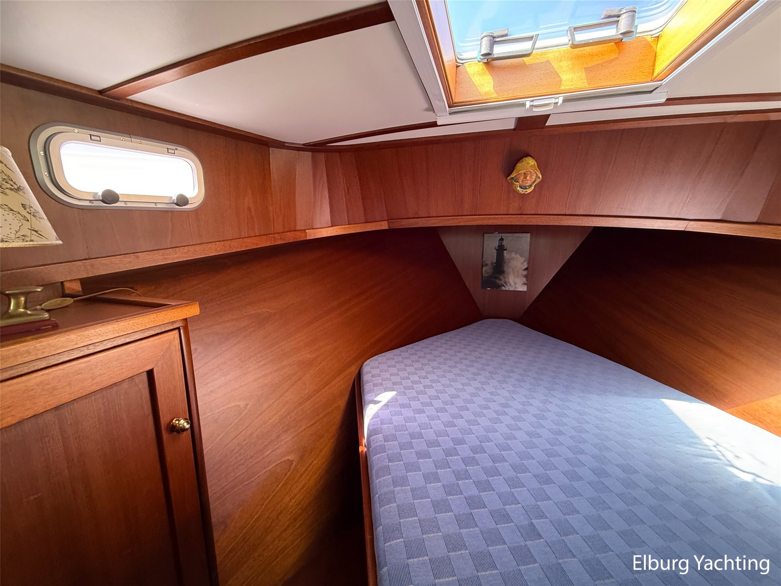 The Vroege Vogel is practically equipped and features: New cockpit cover (2025), solar panels for extra autonomy, a powerful 89 hp Mitsubishi 6-cylinder engine, electric bow thruster (95 kgf) for easy maneuvering, deck wash pump, keel fins (which keep the boat stable), a folding mast resulting in a very low clearance height, Webasto hot-air heating, a 3-burner stove, a manual anchor winch in the locker, a Victron Phoenix Multi inverter/charger, and a pull-out salon bench that creates two extra sleeping spots in a snap. The boat is also equipped with an integrated swim platform with a swim ladder and an Advansea marine radio.